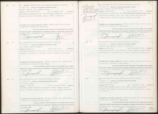 No. 22 Op vijfenr vijfentwintig juni negentienhonderd zeventig t 18 uur, 45 minuten, is in de gemeente Amsterdam overleden: Tieben, Bernard Jan, zonder beroep, geboren te Ambt Doetinchem op 28 maart 1903, wonende te Amsterdam, echtgenoot van: van Willegen, Hendrika, zoon van: Tieben, Jan en: Hilferink, Janna, beiden overleden. De aangifte van dit overlijden is gedaan door: Meijer, Gerrit Jan, oud 60 jaar, aanspreker, wonende te Amsterdam, die tevens verklaarde uit eigen wetenschap van het overlijden kennis te dragen Waarvan akte, welke overeenkomstig de wet is opgemaakt, voorgelezen en ondertekend te Amsterdam of 26 juni 1970. Goedgekeurd de doorhaling van 6 ij 7 letters en 1 cijfor Tmesjece J - - van Ebbenhorst Tengbergen, e Renvooi en de door haling van 3 woor- den goedgekeurd: Drucges JBens — Op zesentwintig juni negentienhonderd zeventig te 20 uur, 30 minuten, is in de gemeente Amsterdam overleden: geboren te Amsterdam op 14 oktober 1895, wonende te (Jung, Anthon, zonder beroep, Amstelveen, echtgenoot van: van Ebbenhorst, Pengbergen, Henr Henriette Johanna, zoon van: Jung, Pieter Marinus en: Janke, Maria Johanna Josepha, beiden overleden. De aangifte van dit overlijden is gedaan door: Meijer, Gerrit Jan, oud 60 jaar, aanspreker, wonende te Amsterdam. die tevens verklaarde uit eigen wetenschap van het overlijden kennis te dragen Waarvan akte, welke overeenkomstig de wet is opgemaakt, voorgelezen en ondertekend te Amsterdam op 29 juni 1970. Goedgekeurd de doorhaling van 1 leesteken en 4 letters. Gben Cneyen No. 23 10 Op zesentwintig juni negentienhonderd zeventig 22 uur, 0 minuten, is in de gemeente Amsterdam overleden: van Exter, Maria Aagtje, op29 juli 1916, wonende te geboren te Zaandijk Zaandam, echtgenote van: Hart, Jacob, dochter van: van Exter, Roelof, overleden en: Kleijn, Jansje, wonende te Zaandam. De aangifte van dit overlijden is gedaan door: Meijer, Gerrit Jan, oud 60 jaar, aanspreker, wonende te Amsterdam, die tevens verklaarde uit eigen wetenschap van het overlijden kennis te dragen Waarvan akte, welke overeenkomstig de wet is opgemaakt, voorgelezen en ondertekend te Amsterdam op 29 Juni 1978. beitr Smisens C No. 26 Op zesentwintig juni negentienhonderd zeventig te 13 uur, 0 minuten, is in de gemeente Amsterdam overleden: Deubel, Yda Adriana Jacoba, inkoopster, geboren te Amsterdam op 30 december 1944, wonende te Amsterdam, dochter van: Deubel, Wouter Marius Cornelis,ent overleden en: van Wetering, Louise, wonende te Amsterdam. De aangifte van dit overlijden is gedaan door: Meijer, Gerrit Jan, oud 60 jaar, aanspreker, wonende te Amsterdam, die tevens verklaarde uit eigen wetenschap van het overlijden kennis te dragen. Waarvan akte, welke overeenkomstig de wet is opgemaakt, voorgelezen en ondertekend te Amsterdam op 29 juni 1970. Goedgekeurd de doorhaling van 1 woord en t leesteken. e JC Ipreyier No. 24 Op zesentwintig juni negentienhonderd zeventig te 14 uur, 30 minuten, is in de gemeente Amsterdam overleden: de Lieme, Dina, op 25 december 1887, wonende te geboren te Haarlem Bussum, gehuwd geweest met: Noach, Samuel Simon, dochter van: de Lieme, Abraham en: Chits, Sophia, beiden overleden. De aangifte van dit overlijden is gedaan door: Meijer, Gerrit Jan, oud 60 jaar, aanspreker, wonende te Amsterdam, die tevens verklaarde uit eigen wetenschap van het overlijden kennis te dragen. Waarvan akte, welke overeenkomstig de wet is opgemaakt, voorgelezen en ondertekend te Amsterdam op Gibir 29 Jani 190. prigens No. 27 Op zevenentwintig juni negentienhonderd zeventig te 15 uur, 40 minuten, is in de gemeente Amsterdam overleden: Cramer, Heintje Jappe, geboren te Amsterdam op 11 december 1900 , wonende te Amsterdam, gehuwd geweest met: Mohl, Hendrik Everhard, dochter van: Cramer, Nicolaas en: Luten, Wilhelmina, beiden overleden. De aangifte van dit overlijden is gedaan door: Meijer, Gerrit Jan, p oud 60 je aanspreker, wonende te Amsterdam, die tevens verklaarde uit eigen wetenschap van het overlijden kennis te dragen. Waarvan akte, welke overeenkomstig de wet is opgemaakt, voorgelezen en ondertekend te Amsterdam op 29 juni 1970. Goedgekeurd de doorhaling van 1 letter. Sibiikr fneyen