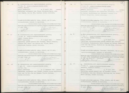 6 No. 47 Op vierentwintig juli negentienhonderd zeventig te 13 uur, 30 minuten, is in de gemeente Amsterdam overleden: Zandt, Johanna Maria, op 4 maart 1893, wonende te geboren te Amsterdam Amsterdam, gehuwd geweest met: Heimans, Gerrit Cornelis, dochter van: Zandt, Jan Jogchem en: Vrieze, Maria Geertruida Guurtje, beiden overleden. De aangifte van dit overlijden is gedaan door: Iben, Albert, oud 56 jaar, uitvaartleider, wonende te Amsterdam, die tevens verklaarde uit eigen wetenschap van het overlijden kennis te dragen. Waarvan akte, welke overeenkomstig de wet is opgemaakt, voorgelezen en ondertekend te Amsterdam op 27 198 Eerten 9 O No. 50 Op zeve zevenentwintig juli negentienhonderd zeventig 4 uur, O minuten, is in de gemeente Amsterdam overleden: den Enting, Abrham, Abraham, geboren te Kampen op 14 maart 1901, wonende te Amsterdam, achtereenvolgens gehuwd geweest met: Wielink, Wilhelmina; Niewenhuizen, Maria Johanna en: Eltink, Hendrika zoon van: den Enting, Hendrik en: van den Berg, Albertje, beiden overleden. De aangifte van dit overlijden is gedaan door: Geestman, Bernardus, oud 46 jaar, begrafenisondernemer, wonende te Amsterdam, die tevens verklaarde uit eigen wetenschap van het overlijden kennis te dragen. Waarvan akte, welke overeenkomstig de wet is opgemaakt, voorgelezen en ondertekend te Amsterdam op 27 juli 1970. Goedgekeurd de doorhaling yan 4 letters, alsme- de van een woord en 1 leesteken. Baseen G No. 48 te Op vijfentwintig juli negentienhonderd zeventig 4 uur, 30 minuten, is in de gemeente Amsterdam overleden: de Roo, Jan, geboren te Amsterdam op 21 augustus 1904, wonende te Amsterdam, echtgenoot van: Drewes, Johanna Jacoba Geertruida, zoon van: de Roo, Jan en: Husman, Clasina Adriana, beiden overleden. De aangifte van dit overlijden is gedaan door: Iben, Albert, oud 56 jaar, uitvaartleider, wonende te Amsterdam, die tevens verklaarde uit eigen wetenschap van het overlijden kennis te dragen. Waarvan akte, welke overeenkomstig de wet is opgemaakt, voorgelezen en ondertekend te Amsterdam op 27 Juli 1978. Libeit P No. 5 Op eenentwintig juli negentienhonderd zeventig te 14 Aur, minuten, is in de gemeente Amsterdam overleden: Swinkels, Cornelis Joannes, geboren te Tilburg op 27 juli 1905, wonende te Amsterdam, gehuwd geweest met: de Brouwer, Joanna Wilhelmina, zoon van: Swinkels, Martinus en: van Berkel, Maria Adriana, beiden overleden. De aangifte van dit overlijden is gedaan door: LJben, Albert, oud 56 jaar, uitvaartleider, wonende te Amsterdam, die tevens verklaarde uit eigen wetenschap van het overlijden kennis te dragen. Waarvan akte, welke overeenkomstig de wet is opgemaakt, voorgelezen en ondertekend te Amsterdam op 27 Juli 1878 Geite
