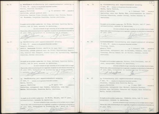No. 22 Op drieëntw-f drieëntwintig juli negentienhonderd zeventig te 15 uur, 15 minuten, is in de gemeente Amsterdam overleden: Oosten, Hendrika Dorothea, geboren te Amsterdam op 15 november 1882, wonende te Amsterdam, gehuwd geweest met: Slabbers, Laurens Frans, Joseph, dochter van: Oosten, Wouter en: Wassmann, Gerardina Hendrika, beiden overleden. De aangifte van dit overlijden is gedaan door: de Jong, Adrianus Ignatius Maria, koster, oud 34 jaar, wonende te Amsterdam, die tevens verklaarde uit eigen wetenschap van het overlijden kennis te dragen Waarvan akte, welke overeenkomstig de wet is opgemaakt, voorgelezen en ondertekend te Amsterdam op 24 juli 1970. Goedgekeurd de doorhaling van9 letters. L.K Vroesen G Jan No. 29 Op vierentwintig juli negentienhonderd zeventig 6 uur, 30 minuten, is in de gemeente Amsterdam overleden: Markx, Garry Patrick, geboren te Amsterdam op 5 februari 1969, wonende te Amsterdam, zoon van: Markx, Max, electromonteur en: Schell, Poulien Hubertien, zonder beroep, beiden wonende te Amsterdam. De aangifte van dit overlijden is gedaan door: de Wilde, Reijer, oud 47 jaar, uitvaartleider, wonende te Amsterdam, die tevens verklaarde uit eigen wetenschap van het overlijden kennis te dragen Waarvan akte, welke overeenkomstig de wet is opgemaakt, voorgelezen en ondertekend te Amsterdam op 27 Juli 1970. GCenter Ju No. 23 te Op tweeëntwintig juli negentienhonderd zeventig 14 uur, 30 minuten, is in de gemeente Amsterdam overleden: Bangert, Maria, geboren te Amsterdam Nieuwer Amstel op 30 juni 1891, wonende te Amsterdam, gehuwd geweest met: de Vries, Constantinus Hendri- cus, dochter van: Bangert, Pieter Louis en: Sprenkeling, Jannetje Jannetje, beiden overleden. De aangifte van dit overlijden is gedaan door: de Jong, Adrianus Ignatius Maria, koster, oud 34 jaar, wonende te Amsterdam. die tevens verklaarde uit eigen wetenschap van het overlijden kennis te dragen Waarvan akte, welke overeenkomstig de wet is opgemaakt, voorgelezen en ondertekend te Amsterdam op 24 juli 1970. Goedgekeurd de doorhaling van Y woord,alsmede JKRoeser 5 letters. WVJon 6 No. 26 Op vierentwintif vierentwintig juli negentienhonderd zeventigt. 14 uur, 50 minuten, is in de gemeente Amsterdam overleden: Vlessing, Ernst, geboren te Texel op 9 februari 1896, wonende te Amstelveen, echtgenoot van: de Miranda, Johanna, zoon van: Vlessing, Philip Samuel en: de Winter, Johanna, beiden overleden. De aangifte van dit overlijden is gedaan door: Belser, Dirk Ferdinand, oud 59 jaar, aanspreker, wonende te Amsterdam, die tevens verklaarde uit eigen wetenschap van het overlijden kennis te drage Waarvan akte, welke overeenkomstig de wet is opgemaakt, voorgelezen en ondertekend te Amsterdam op 27 juli 1970. Goedgekeurd de doorhaling van 13 letters. J Jelsel 5 No. 24 Op tweeëntwintig juli negentienhonderd zeventig te 22 uur, 5 minuten, is in de gemeente Amsterdam overleden: Smits, Gerrit, op 30 april 1900, wonende te geboren te Amsterdam Amsterdam, echtgenoot van: Donker, Catharina, zoon van: Smits, Schiebergen, Hendrika Maria, overleden. De aangifte van dit overlijden is gedaan door: de Wilde, Reijer, oud 41 jaar, uitvaartleider, wonende te Amsterdam, die tevens verklaarde uit eigen wetenschap van het overlijden kennis te dragen. Waarvan akte, welke overeenkomstig de wet is opgemaakt, voorgelezen en ondertekend te Amsterdam op 27 Juli 1970, Goedgekeurd de doorhaling van 1 woord en 1 lees Cbekr teken. Ev No. 27 Op vierentwintig juli negentienhonderd zeventig te 9 uur, 15 minuten, is in de gemeente Amsterdam overleden: Leijtens, Johanna Anna Hendrika Maria, geboren te Amsterdam op 3 juni 1889, wonende te Amsterdam, echtgenote van: Mulder, Cornelis Jacobus, dochter van: Leijtens, Johannes en: Rijnja, Anna Catharina Maria, beiden, overleden. De aangifte van dit overlijden is gedaan door: Remmers, Arie, oud 75 jaar, aanspreker, wonende te Amsterdam. die tevens verklaarde uit eigen wetenschap van het overlijden kennis te drage Waarvan akte, welke overeenkomstig de wet is opgemaakt, voorgelezen en ondertekend te Amsterdam op 27 juli 1970. W A Ber