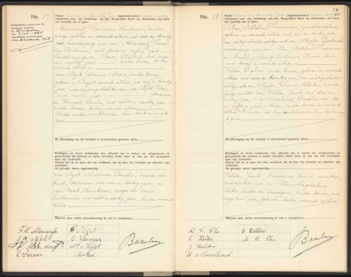 No. rproken bi) Ecl. vonnis dor rechtbank 1 Amsterdem van 3 Juli 1968 ingeschroven te Amsterdam heden. 6 september 1908 Heden zeven en twintig Juni negentienhonderd zes en veertig verschenen voor mij, Ambtenaar van deh Burgerlijken Stand van Amsterdam, ten eikde een huwelijk aan te gaan: Aldendorff, Franciscus Hendricus, handels. jaar, meerderjarige zoon van: Aldendorff, Francis- reiziger, geboren en wonende alhier oud vier en twintig cus Hendricus, oud twee en vijftig jaar, handels reiziger, en: Serier Clasina, oud egen en veertig jaar zonder beroep, beiden wonende alhier, en:— van Wijck, Johanna Maria, zonder beroep, geboren in Vught, wonende alhier oud vijf en twintig jaar, meerderjarige dochter van: van Wijck Petrus, oud zestig jaar Aucadoor, en Verspeck, Cornelia, oud acht en veertig jaar,- zonder beroep, beiden wonende alhier. Beider ouders verklaarden hun toestemming te geven De afkondiging tot dit huwelijk is onverhinderd geschied, alhier Bruldegom en bruid verklaarden mij, elkander aan te nemen tot echtgenooten en getrouwelijk alle plichten te zullen vervullen, welke door de wet aan den huwelijken staat zijn verbonden. Daarop heb ik, in naam der wet verklaard, dat zij door het huwelijk aan elkander zijn verbonden. Als getuigen waren tegenwoordig: van Wijck, Marinus Cornelis, broeder der bruid, stucadoor, oud vier en dertig jaar, en: van Beest, Christiaan, zwager der bruid, houtbewerker, oud acht en dertig jaar, beiden wonende alhier. Waarvan akte, welke overeenkomstig de wet is voorgelezen. No. 18 Heden zeven en twintig Juni negentienhonderd zes en veertig1 verschenen voor mij, Ambtenaar vanden Burgerlijken Stand van Amsterdam, ten einde een huwelijk aan te gaan: Plas Wilhelmus Franciscus, zywielhandelaar geboren en wonende alhier, oud een en dertig jaar van echtgeschiiden echtgenoot van: Sleijfer, Geertruid meerderjarige zoon van: Plas, Wilhelmus Franciseu en: Ruchling, Reintje Catharina Clasina, beiden zonder beroep en wonende alhier, en= Kelder, Engelina, zonder beroep, geboren en wonende alhier, oud zeven en twintig jaar, van echtgescheiden echtgenoote van: Sleijfer, ohannes Albertus, meerder jarige dochter van: Kelder, Jacob, oud drie en zestig jaar, — en: Moerland, Cornelia, oud drie en vijftig jaar — beiden zonder beroep en wonende alhier. De ouders der bruidverklaarden hun toestemmin te geven. De afkondiging tot dit huwelijk is onverhinderd geschied, alhier Bruldegom en bruid verklaarden mij, elkander aan te nemen tot echtgenooten en getrouwelijk alle plichten te zullen vervullen, welke door de wet aan den huwelijken staat zijn verbonden. Daarop heb 1k. in naam der wet, verklaard, dat zij door het huwelijk aan elkander zijn verbonden. Als getuigen waren tegenwoordig: Kelder Jacob, broeder der bruid, monteur, oud dertig jaar, en Plas, Magdalena Rika, zuster des bruidegoms; zonder beroep, ond Norten vel ard, dede woorde alhen Waarvan akte, welke overeenkomstig de wet is voorgelezen. D v Wich F.H. Aldendoff. W v Wijch W C Verspert Baanlaan JH Aldte dorff M.C. v Wijek Chv Bees. C Sereer W. F. Plas J Velder. Bauslen 1 E. Kelder M R. Plas J Kelder C Moerland.