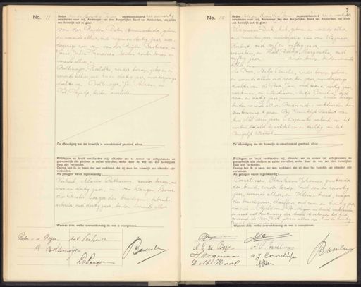 No. 11 Heden zes en twintig Juni negentienhonderd zes en veertig verschenen voor mij, Ambtenaar van den Burgerlijken Stand van Amsterdam, ten (einde een huwelijk aan te gaan: van der Reijden Pieter, terreinarbeider, geboren en wonende alhier, oud negen en dertig jaar, meer- derjarige zoon van: van der Reijden Bastiaan, en Janse, Julia Francisca, beiden zonder beroep en wonende alhier en: Bollemeijer, Roelofke, zonder beroep, geboren en wonende alhier, oud zes en dertig jaar, meerderjarige dochter van: Bollemeyjer, Jan Adriaan, en: Pol, Trijntje, beiden overleden- De afkondiging tot dit huwelijk is onverhonderd geschled, alhier Bruldegom en bruid verklaarden mij, elkander aan te nemen tot echtgenooten en getrouwelijk alle plichten te zullen vervullen, welke door de wet aan den huwelijken staat zijn verbonden. Daarop heb ik, in naam der wet verklaard, dat zij door het huwelijk aan elkander zijn verbonden. Als getuigen waren tegenwoordig: Verheul, Maria Catharina, zonder beroep, oud vier en dertig jaar, en: van Langen, Leonar- dus Corneuis, zwager des bruidegoms, fabrieks arbeider, oud dertig jaar, beiden wonende alhier Waarvan akte, welke overeenkomstig de wet is voorgelezen. No. 12 Heden zes en twintig Juni negentienhonderd zes en veertigst verschenen voor mij, Ambtenaar van den Burgerlijken Stand van Amsterdam, ten einde een huwelijk aan te gaan: Wagenaar, Dirk, kok, geboren en wonende alhier oud zeventien jaar, minderjarige zoon van: Wagenaar Herbert oud vijf en vijftig jaar waschbaas, en: Kool, Durkje Margaretha oud vijftig jaar, zonder beroep, beiden wonend alhier en- de Boer, Antje Cornelia, zonder beroep, geboren en wonende alhier oud zeventien jaar, minderjarige dochter van: de Boer Jan, oud zeven en veertig jaar werkman, en: Cornelissen, Antje Cornelia oud zeven en dertig jaar, zonder beroep beiden wonende alhier. Beider ouders verklaarden hun toestemming te geven. Bij Koninklijk Besluit van twee Mei dezes jaars, is dispensatie verleend van het verbod bedoeld bij artikel zes en tachtig van het Burgerlijk Wetboek- De afkondiging tot dit huwelijk is onverhinderd geschied, alhier - Bruldegom en bruid verklaarden mij, elkander aan te nemen tot echtgenooten en getrouwelijk alle plichten te zullen vervullen, welke door de wet aan den huwelijken staat zijn verbonden. Daarop heb ik. in naam der wet, verklaard, dat zij door het huwelijk aan elkander zijn verbonden. Als getuigen waren tegenwoordig: Cornelissen, Christiaan Johannes, grootvader der bruid, zonder beroep oud een en zeventig jaar, wonende alhier, en: Klein, Arend, zwager des bruidegoms, chauffeur, oud zeven en twintig jaar wonende in Apeldoorn, Bruidegom en bruid verklaarden de eerste met toestemming der tweede te erkennen het kind genaamd: de Boer Dirk, geboren alhier op twee en twintig maart dezes jaars— Waarvan akte, welke overeenkomstig de wet is voorgelezen. Pieter. v. d. Reijden JhC. Verkest R Bollemeyer Baanten AKhanger JW PV HC Cornelingen A.C. de Boer Booela HOrgena a J Conschsse D M Kaol ACen.