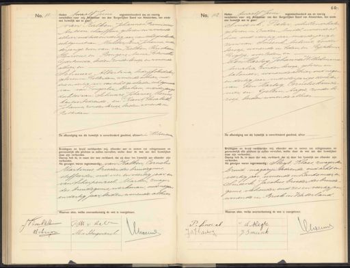 No. 111. Heden twaalf Juni negentenhonderd zes en veerde verschenen voor mij. Ambtenaar van den Burgerlijken Stand van Amsterdam, ten einde een huwelijk aan te gaan: van Ralken Johannes Franciscus Antoon, chauffeur, geboren en wonende alhier, oud twee en veertig jaar van echtgescheiden echtgenoot van: Mulder Lena Johanna meer derjarige zoon van: van Kalken, Christiaan Henricus, en: Bongers, Anna Petronella Geertruida, beiden zonder beroep en wonende alhier, en Schuurs, Albertina, bedrijfsleidster geboren in Rotterdam, wonende alhier, oud drie en dertig jaar, van echt gescheiden echtgenoote van: van Tongerloo, Abraham, meerderjarig dochter van Schuurs, Johannes Marins kantoorbediende, en: Rievit, Elisabeth Johanna, zonder beroep, beiden wonende in Rotterdam. De afkondiging tot dtt huwelijk is onverhinderd geschied, alhierenin Hilversum Bruidegom en bruid verklaarden mij, elkander aan te nemen tot echtgenooten en getrouwelijk alle plichten te zullen. vervullen, welke door de wet aan den huwelijken staat zijn verbonden. Daarop heb ik, in naam der wet verklaard, dat zij door het huwelijk aan elkander zijn verbonden. dds getuigen waren tegenwoorde van Ralken, Cornelis Martinus broeder des bruidegoms, stoffeerder, oud vier en veertig jaar, en. van Scherpenzeel, Marten, zwager des bruidegoms, werkman, oudnegen en dertig jaar, beiden wonende alhier No. 112. Heden twaalf Juni negentienhonderd zes en veertig verschenen voor mij. Ambtenaar van den Burgerlijken Stand van Amsterdam, ten einde een huwelijk aan te gaan: Smeenk, Pieter, schillenophale„ geboren in Ouder-Amstel, wonende al hier, oud veertig jaar meerderjarige zoon van Smeenk, Antonie, zonder beroep, wonende in Edam, en Rijpkemo Rigtje, overleden, en den Hartog, Johanna Wilhelmina Amalia, zonder beroep, geboren in talsmeer, wonende alhier, oud negen en dertig jaar, meerderjarige dochter van den Hartog, Cornelis kruide- nier, en: Gelein, Aagie, zonder be- roep, beiden wonende alhier. De afkondiging tot dit huwelijk is onverhinderd geschied, alhier. Bruldegom en bruid verklaarden mij, elkander aan te nemen tot echtgenooten en getrouwelijk alle plichten te zullen vervullen, welke door de wet aan den huwelijken staat zijn verbonden. Daarop heb ik. in naam der wet, verklaard, dat zij door het huwelijk aan elkander zij verbonden.: dds getuigen waren tegenwoorde: Slegt, Klaas, zwager de bruid magazijn bediende oud acht en veertig jaar, wonende in Landsmeer, en Smeenk Jacobus broeder des bruide, goms, veehouder oud zes en veertig jaar wonende in Broek in Waterland, AMk v Kelr J J Voorkalke ASchria Murerl M. v Scherpenseel A Blegr P. Smeerk Ehvveuuw J:d Jartos J. Smeenk