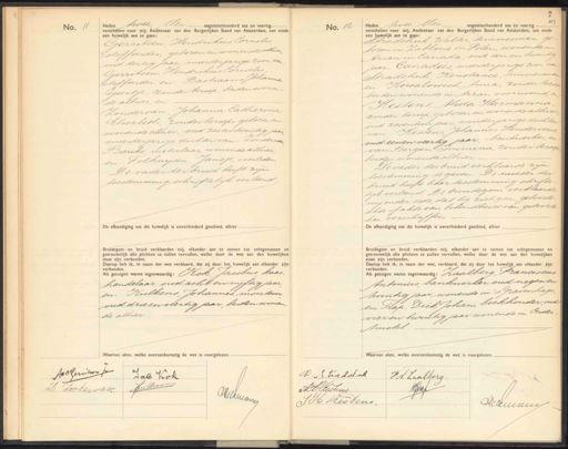 No. 11 Heden twee Mli negentenhonderd zes en veerde verschenen voor mij. Ambtenaar van den Burgerlijken Stand van Amsterdam, ten einde een huwelijk aan te gaan: Gerritsen, Hendrikus Cornelis, stoffeerder, geboren en wonende alhier, oud dertig jaar, meerderjarige zoon van: Gerritsen, Hendrikus Cornelis, toffeerder, en: Bastiaans Johanna Geertje, zonder beroep, beiden wonen- de alhier, en zondervan, Johanna Catharina EElisabeth zonder beroeps geboren en wonende alhier, oud zes en twintig jaar meerderjarige dochter van: zonder van Bauke, metselaar wonende alhier en Tolhuijsen, Jansje, overleden De vader der bruid heeft zijn toestemming schriftelijk verleend De afkondiging tot dit huwelijk is onverhinderd geschied, alhier- Bruidegom en bruid verklaarden mij, elkander aan te nemen tot echtgenooten en getrouwelijk alle plichten te zullen vervullen, welke door de wet aan den huwelijken staat zijn verbonden. Daarop heb ik, in naam der wet verklaard, dat zij door het huwelijk aan elkander zijn. verbonden. dis getuigen waren tegenwoordg: Rok, Jacobus kaas- handelaar oud acht en vijftig jaar, en Rulkens Johannes, monteur oud drie en veertig jaar, beiden wonen- de alhier Waarvan akte, welke overeenkomstig de wet is voorgelezen.- No. 12 0 Heden twee Mei negentienhonderd zes en veertig verschenen voor mij, Ambtenaar van den Burgerlijken Stand van Amsterdam, ten einde een huwelijk aan te gaan: Stradchuk Walter timmerman, ge boren in Zablocie in Polen, wonende in Arran in Canada, oud een en twintig jaar, Canadees, meerderjarige zoon van Stradchuk, Konstance, timmerma en Rowalowich, Anna, zonder beroe beiden wonende in Arran voornoemd, en Restens, Alida Harmanna zonder beroep geboren en wonende alhier oud zeventien jaar, minderjarige dochter van: Restens, Johannes Hendericus oud een en veertig jaar bankwerker, en van Bergen, Omming, zonder beroep beiden wonende alhier. Le vader der bruid verklaarde zijn toestemming te geven. De moeder der bruid heeft haar toestemming schrifte lijk verleend. De bruidegom verklaarde mij onder eede, dat hij zich geen geboorte akte of akte van bekendheid van getoorte kan verschapfen De afkondiging tot dit huwelijk is onverhinderd geschied, alhier, Bruldegom en bruld verklaarden mij, elkander aan te nemen tot echtgenooten en getrouwelijk alle plichten te zullen vervullen, welke door de wet aan den huwelijken staat zijn verbonden. Daarop heb ik. in naam der wet, verklaard, dat zij door het huwelijk aan elkander zijn verbonden. Als getuigen waren tegenwoordig: Raalberg, Franciacus Antonius, bankwerker oud negen en twintig jaar, wonende in '’s Gravenhage. en Trap, Dick Johan, boekhouder oud vier en twintig jaar, wonende in Ouder Amstel JCLeritens Jac Kok Gulker B: Zondervan Reauang W. Ahaschok JA. Laalberg. AH Keskus W ap JH Kesbens. Tekumn