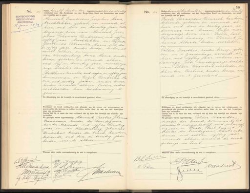 No. 111 ECHTSCHEIDING INGESCHREVEN AMSTERDAM. 12 Juni 19,9 Heden twaalf september negentienhonderd zes en veertig verschenen voor mij, Ambtenaar van den Burgerlijken Stand van Amsterdam, ten einde een huwelljk aan te gaan: Mensink Franciscus Josephus Maria, hier, oud drie en twintig jaar, meerbroodbakker, geboren en wonende al derjarige zoon van: Mensink, Josephus Johannes Hendricus, oud vijf en vyftig jaar broodbakker, en: Bijlmer Geertruida Petronella Maria oud een en vijftig jaar zonder beroep, beiden wonende alhier, en: van Weerdenburg, Anna Maria, zonder beroep, geboren en wonende alhier oud vijf en twintig jaar meerderjarige dochter van: van Weerdenburg, Mattheus Cornelis, oud negen en vijftig jaar timmerman, en: Keijer, Hendrika Maria, oud zestig jaar, zonder beroep beiden wonende alhier. Beider ouders verklaarden hun toestemming te geven De afkondiging tot dit huwelijk is onverhinderd geschied, alhier Bruidegom en bruid verklaarden mij, elkander aan te nemen tot echtgenooten en getrouwelijk alle plichten te zullen vervullen, welke door de wet aan den huwelijken staat zijn verbonden: Daarop heb ik, in naam der wet verklaard, dat zij door het huwelijk aan elkander zijn verbonden. ds getuigen waren tegenwoordg: Mensink, Jacobus Johannes Franciscus broeder des bruidegoms kantoorbediende oud vijf en twintig jaar, en: van Weerdenburg, Johannes Hendrikus, broeder der bruid, kantoor bediende, oud twee en twintig jaar. beiden wonende alhier Waarvan akte, welke overeenkomstig de wet is voorgelezen. No. 112 a Heden twaalf september negentienhonderd zes en veertig verschenen voor ufij, Ambtenaar van den Burgerlijken Stand van Amsterdam, ten einde een huwelijk aan te gaan: Friele Bernardus Heinrich, kantoor bediende, geboren en wonende al. hier, oud drie en zestig jaar, weduwnaar van: Kroon, Antje, meer derjarige zoon van: Friele, Carl Friedrich Ludwig, en: Vorrink, Jo hanna Albarta beiden overleden. en: Polder, Dorothea, zonder beroep, geboren in s. Gravenhage, wonende alhier oud vijftig jaar, weduwe van Laninga, jelte meerderjarige dochter van: Polder, Waandert overleden, en Schouten, Bertina, zonder beroep, wonende in s. Graveland. De afkondiging tot dit huwelijk is onverhinderd geschied, alhter Gruidegom en bruid verklaarden mi, elkander aan te nemen tot echtgenooten e getrouwelijk alle plichten te zullen vervullen, welke door de wet aan den huwelijken staat zijn verbonden. Daarop heb ik. in naam der wet, verklaard, dat zij door het huwelijk aan elkander zijn verbonden. Als getuigen waren tegenwoordig: Polder Waander broeder der bruid, commies bij het gemeente energiebedrijf, oud zes en vijf tig jaar, en Friele, Carl August, boeder des bruidegoms, kantoorbediende, oud achten vijftig jaar wonende alhier, wonende de eerste getuige in ZeistA. J Jennel Ar Weerderburg JH d Meerdenburgg H M Keijer Woament Jaaleem G Pel Bilvageler BH Tuiee JCHderv vansoest. D. Polder tiee