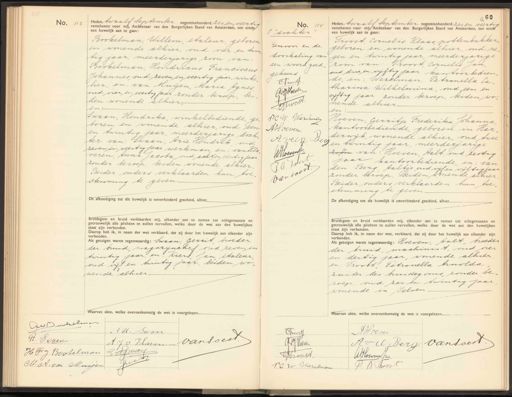 No. 113 Heden twaalf september negentienhonderd zes en veertig verschenen voor mij. Ambtenaar van den Burgerlijken Stand van Amsterdam, ten einde een huwelljk aan te gaan: Bookelman Willem etaleur geboren en wonende alhier, oud vier en twin tig jaar, meerderjarige zoon van: Bookelman, Hendricus Franciscus Johannes, oud zeven en veertig jaar, winke lier, en: van Muijen, Maria Agnes oud vier en veertig jaar zonder beroep, bei„ den wonende alhier. en: Swaan, Hendrika, winkelbediende, ge„ boren en wonende alhier, oud een en twintig jaar, meerderjarige doch ter van: Swaan, Arie Hendrik, oud zeven en veertig jaar werkman, en: van Kla„ veren, Anna Jacoba, oud achten veertig jaar zonder beroep beiden wonende alhier Beider ouders verklaarden hun toe stemming te geven. De afkondiging tot dit huwelijk is onverhinderd geschied, alhier Bruldegom en bruid verklaarden mij, elkander aan te nemen tot echtgenooten en getrouwelijk alle plichten te zullen vervullen, welke door de wet aan den huwelijken staat zijn verbonden. Daarop heb ik, in naam der wet verklaard, dat zij door het huwelijk aan elkander zijn verbonden. Als getuigen waren tegenwoordig: Swaan Gerrit broeder der bruid, magazijnchef, oud zeven en twintig jaar; en Kiers, Jan, etaleur oud vijf en twintig jaar, beiden wo¬ nende alhier. Waarvan akte, welke overeenkomstig de wet is voorgelezen. No. 114 No. 114 ¶ dochter renvooi en de doorhaling van een woord goed¬ gekeurd. C hroost CJHloeven 2 PC.W Wezelman A Hoeven. A vey Per WHoevenJr 28 J van toed 450 Heden twaalf september negentienhonderd zes en veertig verschenen voor mij Ambtenaar van den Burgerlijken Stand van Amsterdam, ten einde een huwelijk aan te gaan: Troost, Cornelis Klaas, pottenbakker gen en twintig jaar, meerderjarige geboren en wonende alhier, oud ne- zoon van: Proost, Cornelis Jan oud drie en vijftig jaar kantoorbedien, de, en: Wezerman, Petronella Ca- tharina Wilhelmina, oud een en vijftig jaar zonder beroep, beiden wo nende alhier en Hoeven, Gerritje Frederika Johanna kantoorbediende, geboren in Har- derwijk, wonende alhier, oud twee en twintig jaar, meerderjarige zoon van: Hoeven, Aalt, oud zestig jaar kantoorbediende, en: van den Berg Aaltje, oud vijf en vijftig jaar zonder beroep, beiden wonende achier Beider ouders verklaarden hun toe. stemming te geven De afkondiging tot dit huwelijk is onverhinderd geschied, alhier— Bruidegom en bruid verklaarden mij, elkander aan te nemen tot echtgenooten en getrouwelijk alle plichten te zullen vervullen, welke door de wet aan den huwelijken staat zijn verbonden. Daarop heb ik. in naam der wet, verklaard, dat zij door het huwelijk aan elkander zijn verbonden. dls getuigen waren tegenwoordg: Hoeven, Aalt broeder der bruid, machinist, oud vier en dertig jaar, wonende alhier en Groost, Petronella Arnolda zuster des bruidegoms, zonder be- roep, oud zes en twintig jaar wonende in Ielsen Waarvan akte, welke overeenkomstig de wet is voorgelezen. e Dootselingn H: Beeaan van soest. R. Swaan A J v Klaver H F. J Bootelman GAgreay M. A. van Muyjern A Hoever Coest A v U Bery vanSoest. A Broest A Hloeven p. P. A Thoost JC W Wezelan