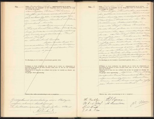 No. Heden zeventien Juli negentienhonderd zes en veertig verschenen voor mij, Ambtenaar van den Burgerlijken Stand van Amsterdam, ten einde een huwelijk aan te gaan: van Leyden, Petrus Philippus, chanffeur, geboren en wonende alhier oud drie en twintig jaar, meerderjarige zoon van van Leyden, Meindert, overleden en Groenhart, Arnelia zonder beroep, wonende alhier, en- Ramphorst Sorsthea Maria, zonder beroep, geboren en wonende allier oud twintig jaar, minderjarige dochter van Ramp. horst Roelof. en; Suikerbuik Cornelia, beiden zonder beroep en wonende alliver De moeder des bruidegoms ende ouders der bruid verklaarden hun toestemming te geven De afkondiging tot dit huwelijk is onverhinderd geschied, alhier. Bruidegom en bruid verklaarden mij, elkander aan te nemen tot echtgenooten en getrouwelijk alle plichten te zullen vervullen, welke door de wet aan den huwelijken staat zijn verbonden. Daarop heb ik. in naam/ der wet verklaard, dat zij door het huwelijk aan elkander zijn verbonden: Als getuigen waren tegenwoordig: Waarvan akte, welke overeenkomstig de wet is voorgelezen No. 60 Heden zeventien Juli negentienhonderd zes en veertig j verschenen voor mij. Ambtenaar van den Burgerlijken Stand van Amsterdam, ten einde een huwelijk aan te gaan: Rastelijn Hendrikus, diepzeldur ker, geboren en wonende in Helvoirt, oud twee en twintig jaar, meerderjarige zoon van Rastelijn Adrianus, en: van Erp, Wilhelmina beiden overleden, en: van der Werf Maria Cornelia, zonder beroep, geboren en wonende allier oud zeventien jaar minderjarige doch ter van van der Werf Huite oud zeven en vijftig jaar werkman, en: Scheer¬ Josephina Alida Maria oud zes en vijftig jaar, zonder beroep, beiden wonende alhier De ouders der bruid verklaarden hun toestemming te geven. Bij beschik. king van den Officier van Jussitie bij de Miron dissements. Rechtbank alhier is dispensatie verleend van den bij artikalhonderd dertig van het Burgerlijk Wetboek voorgeschreven wachttijd.- De afkondiging tot dit huwelijk is onverhinderd geschied, alhier En en Helvou Bruidegom en bruid verklaarden mij, elkander aan te nemen tot echtgenooten en getrouwelijk alle plichten te zullen vervullen, welke door de wet aan den huwelijken staat zijn verbonden: Daarop heb ik, in naam der wet, verklaard, dat zij door het huwelijk aan elkander zijn verbonden.: dis getuigen waren tegenwoordg: Agema Henri Josephus zwager der bruid, decoratieschieder, oud negen en twintig jaar en Sauerborn Mietje, zonder beroep, oud vijf en vijftig jaar, beiden wonende alhier gelezen. Goedgekeurd de doorhaling dezer bladzijde wegens abusieve beschrijving De Ambtenaar van den Burgerlijken Stand. 6 A. Zuiden H. Kastelijn H.J Fgema. Mum M E vd Werf. M Sanerbom H. v Weef J A M. Scheer