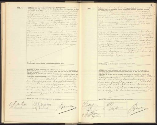 No.17 Heden zes en twintig september negentienhonderdzes en veertig verschenen voor mij, Ambtenaar van den Burgerlijken Stand van Amsterdam, ten einde een huwelijk aan te gaan: de Bos, Frederik Hendrik fabrieks chef, geboren en wonende alhier oud vijf en dertig jaar, van echtgescheiden echtgenoot van: takes Hendrica Johanna, meerderjarige zoon van de Bos, Hendrik, overleden, en: Ver„ mij, Sophia Frederika Louisa Wilhel- mina, zonder beroep, wonende alhier, en— Terstroot, Hendrika, zonder beroep, geboren en wonende alhier, out dertig jaar, meerderjarige dochter van terstroot, Hendrik Matthijs, werk man en Moehring, Grietje, zonder beroep, beiden wonende alhier De afkondiging tot dit huwelyjk is onverhinderd geschied, alhter Bruldegom en bruid verklaarden mij, elkander aan te nemen tot echtgenooten en getrouwelijk alle plichten te zullen vervullen, welke door de wet aan den huwelijken staat zijn verbonden: Daarop heb 1k. in naam der wet, verklaard, dat zij door het huwelijk aan elkander zijn verbonden: dds getuigen waren tegenwoordg de Bos, Sophia Crede¬ rika Louise Wilhelmma, zuster des bruidegoms, bedryfslerdster oud acht en veertig jaar, en Ver„ Stroot, Alida Geertrinda, zuster der bruid, lederbewerkster, oud drie en twintig jaar, beiden wonende alhier Waarvan akte, welke overeenkomstig de wet is voorgelezen. No. 18 Heden zesen twintig September negentienhonderd zes en veertig 4 verschenen voor mij, Ambtenaar van den Burgerlijken Stand van Amsterdam, ten einde een huwelijk aan te gaan: van Dongen, Willem, kantoorbe diende, geboren en wonende alhier oud een en dertig jaar, meerderjarige zoon van: van Dongen, Wilhelmus Hermanus, ziekenverpleger, en Verwerda, Kunske, zonder beroep beiden wonende alhier. en: van Hoeve, Carolina Sophia Wilhelmina kantoorbediende, gebo ren en wonende alhier, oud twee en twintig jaar, meerderjarige dochter van: van Hoeve, Gerardus, oud twee en veertig jaar- brievensorteerder, en Eijlers, Carolina Sophia Wilhel. mina, oud veertig jaar. — zonder beroep, beiden wonende alhier De ouders der bruid verklaarden hun toe stemming te geven De afkondiging tot dit huwelijk is onverhinderd geschied, alhier Bruidegom en bruid verklaarden mij, elkander aan te nemen tot echtgenooten en getrouwelijk alle plichten te zullen vervullen, welke door de wet aan den huwelijken staat zijn verbonden: Daarop heb ik, in naam der wet verklaard, dat zij door het huwelijk aan elkander zijn verbonden. dds getuigen waren tegenwoorde: Dolters, Willem Hen- drik, werktuigbouwkundige, oud drie en twintig jaar, en: Roth, Joseph Christiaan, leeraar in de lichamelijke opvoeding, oud vier en dertig jaar, beiden wonende alhier Waarvan akte, welke overeenkomstig de wet is voorgelezen. 10 CM: de Bor A. K. W. de Bos. Baanla H. Justrot A.G Genstraat N Babbekn