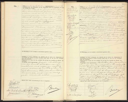 No. 19 Heden zes en twintig septemter negentienhonderd zes en veertig verschenen voor mij, Ambtenaar van den Burgerlijken Stand van Amsterdam, ten einde een huwelijk aan te gaan: van der Hulst, Gerrit Willem kantoorbediende geboren en wonende alhier, oud zes en twintig jaar meerderjarige zoon van van der Hulst, Willem Coenraad, overleden, en: Munnik, Anna Maria Elisa beth, oud vijf en vyftig jaar. zonder beroep, wonende alhier en Toezall, Helena, zonder beroep geboren en wonende alhier, oud zes en twintig jaar, meerderjarige dochter van: Ovezall, Johannes Marinus. oud vier en vijftig jaar- kantoorbe¬ diende, en Goejer, Josma Hendri ka, oud twee en vijftig jaar, zonder beroep, beiden wonende alhier De moeder des bruidegoms en de ouders der bruid verklaarden hun toestemming tegenen De afkondiging tot dit huwelijk is onverhinderd geschied, alhier. Bruldegom en bruid verklaarden mij, elkander aan te nemen tot echtgenooten en getrouwelijk alle plichten te zullen vervullen, welke door de wet aan den huwelijken staat zijn verbonden: Daarop heb ik. in naam der wet, verklaard, dat zij door het huwelijk aan elkander zijn verbonden. ds getuigen waren tegenwoorde: Goeser, Anthonij oom der bruid, directeur van een rusthuis, oud negen en vijftig jaar, wonende in Haarlem, en: Akkermans, Hendrikus Maria koopman, oud vier en zestig jaar, wonende alhier WaATVAN a NZ. ekeuht Goedgekeurd de doorhaling van drie woor. den queiters Wiermlr Vieueg G F v Carpel RCunti 5. DH P7 1 Heden zes en twintig septembernegentienhonderd zes en veertig verschenen voor mij, Ambtenaar van den Burgerlijken Stand van Amsterdam, ten einder een huwelijk aan te gaan: Melcners, Pieter Ulkes, hoofdklerk bij het gemeente vervoerbedrijf, gevoren en wonende alhier, oud vijf en dertig jaar meerderjarige zoon van: Melchers Roelof, zonder beroep, wonende alhier. ter en: Polman, Margaretha, over- leden, en: Liemstra, Maria Anna, zonder beroep, bureelambtenaar bij het gemeente girokantoor geboren in Batavia m Nederlandsch Indië, wonende alhier. oud vijf en twintig jaar meerderjarige dochter van: Tiemstra Bauke, oud twee en vijftig jaar, magazijnbediende en van Caspel, Grietje Anna, oud drie en vijftig jaar, zonder beroep, beiden wonende alhier. De ouders der bruid verklaarden kun toestemming te geven De afkondiging tot dit huwelijk is onverhinderd geschied, alhier Bruldegom en bruid verklaarden mi, elkander aan te nemen tot echtgenooten en getrouwelijk alle plichten te zullen vervullen, welke door de wet aan den huwelijken staat zijn verbonden: Daarop heb ik, in naam der wet verklaard, dat zij door het huwelijk aan elkander zijn verbonden.: dds getolgen waren tegenwoorde: Melchers, Jan Jacobus, broeder des bruidegoms, oureelambte naar ter gemeente-secretarie, oud drie en dertig vaar: Tiemstra, Karel, broeder der bruid, machinist ter koopvaardij, oud zeven en twintig jaar; Rog, Jakob, re„ serendaris ter gemeente-secretarie, oud negen en veertig jaar, en: Scholtz, Jo- hannes Rudolf, tert bij het gemeente Ener giebedrijf, oud een en vijftig jaar, allen wo nende alhier Waarvan akte, welke overeenkomstig de wet is voorgelezen. enkomstig de wet is voorgelezen. Goe J Oelradl JH Goejer Jaanen Mr: A.M:E. Manst PWee Jooczael AKhurman uuldens 7 Tiermtir GyfCicel tuen Baande „ „2