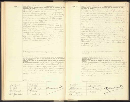 No. 31 Heden twee October negentienhonderd zes en veertig verschenen voor mij, Ambtenaar van den Burgerlijken Stand van Amsterdam, ten einde een huwelijk aan te gaan: Bosch, Johannes Marinus, zubber bewerker, geboren en wonende alhier, oud drie en twintig jaar, meerderjarige zoon van: Bosch. Hendrik, oud zestig jaar, magazijnbediende. en Gandelius Arendina Francisca oud een en zestigjaar, — zonder beroep beiden wonende alhier, en: Valk, Geertruida, zonder beroep geboren en wonende alhier oud ze„ ventien jaar, minderjarige dochter van: Valk, Jan Willem oud drie en veertig jaar, magazijnbediende, en: Baun Geertruida Gijsbertha, oud vier en veer tig jaar, zonder beroep, beiden wonen de alhier. Beider ouders verklaarden hun toestemming te geven De afkondiging tot dit huwelijk is onverhinderd geschied, alhier Bruldegom en bruid verklaarden mij, elkander aan te nemen tot echtgenooten en getrouwelijk alle plichten te zullen vervullen, welke door de wet aan den huwelijken staat zijn verbonden. Daarop heb ik, in naam der wet, verklaard, dat zij door het huwelijk aan elkander zijn verbonden.: dls getuigen waren tegenwoordig: Schotte, Johannes Josephus Michel, boekdrukker oud twee en twintig jaar, en: webe. rink, Cornelis zwager des bruidegoms expeditieknecht, oud drie en dertig jaar, beiden wonende alhier.- Waarvan akte, welke over No. 32 Heden twee October negentienhonderd zes en veertig verschenen voor mij, Ambtenaar van den Burgerlijken Stand van Amsterdam, ten eindel een huwelijk aan te gaan: Draijer Willem, chauffeur, geboren. in Haarlem, wonende in Zandvoort oud twee en twintig jaar, meerder. jarige zoon van: Drayer. Simon Cornelis, oud acht en veertig jaar. chauffeur, en: van der Veld, Petro nella Maria, oud zeven en veertig jaar, zonder beroep, beiden wonende in Zandvoort, en Rooijman, Maria Anna, zonder beroep, geboren in Ouder-Amstel, wo- nende alhier, oud vier en twintig jaar, meerderjarige dochter van Rooijman, Gerrit, overleden, en van Koert, Marijtje, oud twee en vijf. tig jaar, zonder beroep, wonende in Onder Amstel. De ouders des bruidegoms en de moeder der bruid verklaarden hun toe- stemming te geven De afkondiging tot dit huwelijk is onverhinderd geschied, alhier en in hand„ voort Bruidegom en bruid verklaarden mij, elkander aan te nemen tot echtgenooten en getrouwelijk alle plichten te zullen vervullen, welke door de wet aan den huwelijken staat zijn verbonden. Daarop heb ik, in naam der wet verklaard, dat zij door het huwelijk aan elkander zijn verbonden. As getuigen waren tegenwoordg: Bragonje, Aalbertus Wilhelmus, zwager der bruid, klee„ renperser, oud een en dertig jaar, en Rooyman. Martha Cornelia, zuster der bruid, zonder beroep, oud twee en twintig jaar, beiden wo¬ nende alhier. Waarvan akte, welke overeenkomstig de wet is voorgelezen. J M Bosch J.W. Valk vanseest Vab E. G Douw 1 176 H Bonk Schette A F Gandeler Veberuh. 4 Duije CH v Koort ABwy van soest AH Roopvn NC. Hoogene DC Droijl T M vd Vild