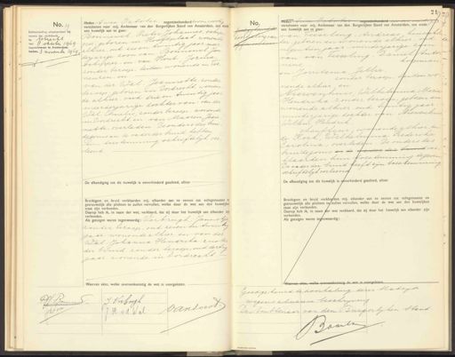 No. 30 No. 30 Echtschelding ultgesproken bi ingeschreven te Amsterdam. vonnis der rechtbank van 8 optober 1969 Utreckt heden 3 november 19691 Heden twee October negentienhonderd zes en veertig verschenen voor mij, Ambtenaar van den Burgerlijken Stand van Amsterdam, ten eind een huwelijk aan te gaan: Bonnewel, Pieter Johannes, schin ner, geboren in Hoofdplaat, wonend alhier, oud zes en twintig jaar, meer derjarige zoon van: Bonnewel, Jan schipper, en: van Hout, Jozina, zonder beroep, beiden wonende in ter neuzen, en van der Wal, Jeannette, zonder beroep, geboren in Dordrecht, wonen de alhier, oud drie en twintig jaar meerderjarige dochter van: van der Wal, Cornelis, zonder beroep, wonende in Dordrecht, en van Maaren, Jean„ nette, overleden. De ouders des brui„ degoms en de vader der bruid hebben hun toestemming schriftelijk ver¬ leend De afkondiging tot dit huwelijk is onverhinderd geschied, alhier Bruldegom en bruid verklaarden mij, elkander aan te nemen tot echtgenooten e getrouwelijk alle plichten te zullen vervullen, welke door de wet aan den huwelijken staat zijn verbonden. Daarop heb ik, in naam der wet, verklaard, dat zij door het huwelijk aan elkander zij verbonden. dls getuigen waren tegenwoordg: Verbrugh, Jannetj zonder beroep, oud zeven en twintig jaar, wonende alhier, en van der Wal, Johanna Hendrika, zuster der bruid, zonder beroep, oud dertig jaar, wonende in Dordrecht Getaartte doorhaling van vfwoorden Heden verschenen voor mud, Ambtenaar van den Borgenijken Stand van Amsterdam, ten einde H een huwelijk aan te gaan: van Teeseling, Andreas, huisschil„ der geboren en wonende alhier, oud t negentien jaar, minderjarige zoon van: van Veeseling, Daniël Anton komman. N8 nius en Jorritsma, Jellie. zonder beroep, beiden wo- nende alhier, en: Niervenhuis Wilhelmina Maria Hendrika, zonder beroep, geboren en wonende alhier, oud twintig jaar minderjarige dochter van: Niewenhuis Willem Hendrik, chauffeur, wonende alhier, en de Kock, Wilhelmina Frederika Carolina, overleden. De ouders des bruidegoms en de vader der bruidver¬ klaarden hun toestemming te geven De vader der bruid heeft zijn toestemming schriftelijk verleend De afkondiging tot dit huwelijk is opverhinderd geschied, alhier Bruidegom en bruid verklaarden mij, elkander aan te nemen tot echtgenooten en getrouwelijk alle plichten te/ zullen vervullen, welke door de wet aan den huwelijken staat zijn verbonden. Daarop heb ik. in naam der wet verklaard, dat zij door het huwelijk aan elkander zijn verbonden. Als getuigen waren tegenwoordig ewetis voor teken 44000 P:J: Bonm J. Verbugk vansoest. 1007 H. vd Wal Goedgekeurd de doorhaling dezer bladzijde wegens abusieve beschrijving De Ambtenaar van den Burgerlijken stand BLoonts