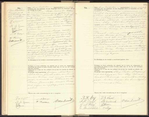 „ „ Den Helder Renvooi en de doorhaling van drie woorden goedgekeurd. W: S hoon M. A. Groen. Gran N A Geedijn J Koen vorsoest. Heden twee October negentienhonderd zes en veertig verschenen vóor mij, Ambtenaar van den Burgerlijken Stand van Amsterdam, ten ein een huwelijk aan te gaan: de Proome, Pieter Cornelis, bestuur der van een vakvereeniging, geboren in Den Helder, wonende alhier, oud vijf en dertig jaar, van echtgescheiden echtgenoot van: telman, Alijda meerderjarige zoon van: de Roome Pieter Cornelis, overleden, en: Koene Jannetje, zonder beroep, wonende alhier, en Groen, Maria Anna, zonder beroep, geboren in Alkmaar, wo nende alhier, oud een en twintig jaar, meerderjarige dochter van Groen, Dirk, oud ees en veertig jaar stoker, wonende in Egmondaan zeer en Godijn, Vrouwtje, overleden. De vader der bruid verklaarde zijn toe stemming te geven. Bij beschikking van den Officier van Jussitie bij de Arrondisse ments-Rechtbank alhier isdispensatie verleend van de afkondiging in Den Helder De afkondiging tot dit huwelijk is onverhinderd geschied, alhier Bruidegom en bruid verklaarden mij, elkander aan te nemen tot echtgenooten getrouwelijk alle plichten te zullen vervullen, welke door de wet aan den huwelijke staat zijn verbonden. Daarop heb ik, in naam der wet, verklaard, dat zij door het huwelijk aan elkander i verbonden. ds getuigen waren tegenwoorde: Godijn- Nicolaas Abraham, grootvader der bruid zonder beroep, oud een en zeventig jaar, wonende in Alkmaar, en Roene, Jannetje, zonder beroep oud negen en vijftig jaar, wonende alhier. Waarvan akte, welke overeenkomstig de wet is voorgelezen. No. 4 Heden twee October negentienhonderd zes en veertig verschenen voor mij, Ambtenaar van den Burgerlijken Stand van Amsterdam, ten einde een huwelijk aan te gaan: Steij. Antoon Marinus, Mec. trisch lasscher geboren en wonende alhier, oud acht en twintig jaar van echtgescheiden echtgenoot van Bakker, Josina, meerderjarige zoon van: Steij, Charles Marinus, oud zeven en zestig jaar, en: Meulenbeld Clasina, oud vier en zestig jaar, ver den zonder beroep en wonende alhier en: Canel Anna Margaretha. zonder beroep, geboren en wonende alhier, oud een en twintig jaar meerderjarige dochter van: Panel Dirk Johannes, oud vijf en veertig jaar, schoenmaker, en: Drederiks Anna Maria, oud een en veertig jaar zonder beroep, beiden wonende alhier Beider ouders verklaarden hun toe- stemming te geven. De afkondiging tot dit huwelijk is onverhinderd geschied, alhier. Bruidegom en bruid verklaarden mij, elkander aan te nemen tot echtgenooten en getrouwelijk alle plichten te zullen vervullen, welke door de wet aan den huwelijken staat zijn verbonden. Daarop heb ik, in naam der wet verklaard, dat zij door het huwelijk aan elkander zijn verbonden. ds getuigen waren tegenwoorde: Stey, Pieter fotograaf oud dertig jaar, en steij, Conrad kantoorbediende, oud acht en dertig jaar, beiden broeder des bruidegoms en wonende alhier Waarvan akte, welke overeenkomstig de wet is voorgelezen. P: A Sroewe M A Gollep Van soest. t Kreene J A Groen P Grvn A. M, Stey D:J: Kauel van soest. A M Diederik AM Pauel GHe MM Hey C Meulenbeld. Stex