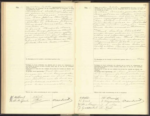 No. 62 Heden zestien October negendenhonderd zes en veertig verschenen voor mij, Ambtenaar van den Burgerlijken Stand van Amsterdam, ten Einde een huwelijk aan te gaan: Hilbrink, Wilhelmus, huisschil der, geboren en wonende alhier, oud acht en veertig jaar, weduwnaar van: Ledro, Gesina Hendrika, meerderjarige zoon van: Hilbrink, Albertus, en: Walman, Johanna Elisabeth Bernardina, beiden overleden, en de Groot, Hendrika Maria zonder beroep, geboren in Utrecht wonende alhier, oud drie en vijftig jaar weduwe van: Grul, Marinus Jacobus, meerderjarige dochter van de Groot, Pieter Martinus en Hoo- gerbeets, Maria, beiden overleden.- De afkondiging tot dit huwelijk is onverhinderd geschied, alhier Bruldegom en bruid verklaarden mij, elkander aan te nemen tot echtgenooten en getrouwelijk alle plichten te zullen vervullen, welke door de wet aan den huwelijken staat zijn verbonden. Daarop heb ik, in naam der wet, verklaard, dat zij door het huwelijk aan elkander zijn verbonden. Als getuigen waren tegenwoordig: Rool, Bernardus zwager der bruid, tremconducteur, oud vijftig jaar, en Grul. Mari nus Jacobus, zoon der bruid, ma„ gazijnbediende, oud zes en twintig jaar, beiden wonende alhier. Waarvan akte, welke overeenkoms No. 63 33 Heden zestien October negentenhonderd zes en veertig verschenen voor mij, Ambtenaar van den Burgerlijken Stand van Amsterdam, ten einde 6 een huwelijk aan te gaan: de Man, Cornelis, groentenhande. laar, geboren in Muiden, wonende in Hilversum, oud drie en twintig jaar, meerderjarige zoon van: de Man, Willem, oud acht en vijftig jaar groentenhandelaar, en: Gaasenbeek Jacoba, oud acht en vyftig jaar, zonder beroep, beiden wonende in Hilversum. en Ruit, Sophia Elisabeth, zonder beroep, geboren en wonende alhier, oud negentien jaar, minder jarige dochter van: Ruit, Hendrik, oud acht en vyftig jaar, werkman, en Wagenmakers. Jetske, oud vijf en vijftig jaar. zonder beroep, beiden wo„ nende alhier. Beider ouders verklaar„ den hun toestemming te geven.— De afkondiging tot dit huwelijk is onverhinderd geschied, alhier en in Hilver sum. Bruidegom en bruid verklaarden mij, elkander aan te nemen tot echtgenooten en getrouwelijk alle plichten te zullen vervullen, welke door de wet aan den huwelijken staat zijn verbonden. Daarop heb ik, in naam der wet verklaard, dat zij door het huwelijk aan elkander zijn verbonden. As getuigen waren tegenwoordg: de Man, Jacob, broeder des bruidegoms fabrieksarbeider, oud vijf en twintig jaar, wonende in Hilversum, en: Kuit, Hendrik broeder der bruid, magarinbediende oud zeven en twintig jaar, wonende alhier. Waarvan akte, welke overeenkomstig de wet is voor A Kool H Helbrus vansoest ufj H: M. de Groot J9 Edtetter H Buif Vansoest S Zuit I Wagenmaker W de Mars7 de Man J: Graasenberk H. Kuit