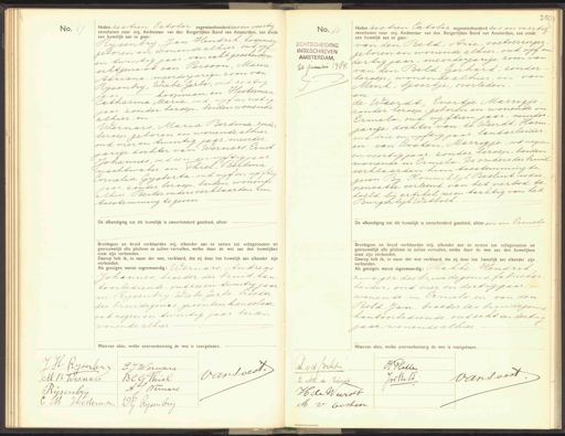 No. 67 Heden zestien October negentdenhonderd zes en veertig verschenen voor mij, Ambtenaar van den Burgerlijken Stand van Amsterdam, ten Einde een huwelijk aan te gaan Rijsenbrij, Jan Hendrik, koopman geboren en wonende alhier, oud vijf en twintig jaar van echtgescheiden echtgenoot van: Persoon, Maria Adriana, meerderjarige zoon van Rijsenbrij, Wiebe Gerbe, oud zestig Jaar. — koopman, en: Hesterman Catharina Maria, oud vijf en zestig jaar, zonder beroep, beiden wonende alhier, en Wernars, Maria Berdina, zonder beroep, geboren en wonende alhier oud vier en twintig jaar, meerder. jarige dochter van Wernars, Ernst Johannes, oud een en vijftig jaar nachtwaker, en: thiel, Berdina Cornelia Gysberta, oud vijf en vijftig jaar, zonder beroep, beiden wonende alhier. Beider ouders verklaarden hun toestemming te geven. De afkondiging tot dit huwelijk is onverhinderd geschied, alhier Bruidegom en bruid verklaarden mij, elkander aan te nemen tot echtgenooten en getrouwelijk alle plichten te zullen vervullen, welke door de wet aan den huwelijken staat zijn verbonden. Daarop heb ik. in naam der wet, verklaard, dat zij door het huwelijk aan elkander zijn verbonden. Als getuigen waren tegenwoordig: Wernars, Andreas Johannes, broeder der bruid, kan toorbediende, oud zes en twintig jaar en Rijsenbrij Wiebe Gerbe, broeder des bruidegoms, groentenhandelaar, oud negen en twintig jaar beiden wonende alhier. Waarvan akte, welke overeenkomstig de wet is voorgelezen. No. 68 ECHTSCHEIDING INGESCHREVEN ANOTEROANN. 01 20 Januari 1900 Heden zestien October negentienhonderd zes en veertig verschenen voor mij, Ambtenaar van den Burgerlijken Stand van Amsterdam, ten einde een huwelijk aan te gaan: van den Beld, Arie, voetverzorger geboren en wonende alhier, oud vijf en dertig jaar, meerderjarige zoon van van den Beld, Gerhard, zonder beroep, wonende alhier, en: van Mink, Sjoertje, overleden, en: de Weerdt Evertje Marrigje. zonder beroep, geboren en wonende in Ermelo, oud vijftien jaar, minder jarige dochter van: de Weerdt, Harm oud drie en vijftig jaar, landarbeider en: van Oosten, Marrigje, ond negen en veertig jaar, zonder beroep, beiden wonende in Ermelo. De ouders der bruid verklaarden hun toestemming te geven Bij Koninklijk Besluit is dis pensatie verleend van het verbod be doeld bij artikel zes en tachtig van het Burgerlijk Wetboek. De afkondiging tot dit huwelijk is onverhinderd geschied, alhier en in Ermela Bruidegom en bruid verklaarden mij, elkander aan te nemen tot echtgenooten en getrouwelijk alle plichten te zullen vervullen, welke door de wet aan den huwelijken staat zijn verbonden. Daarop heb ik. in naam der wet verklaard, dat zij door het huwelijk aan elkander zijn verbonden. dds getuigen waren tegenwoordg: Clakke Hendrik, zwager des bruidegoms, fabriekar beider, oud vier en dertig jaar, wonende in Cimelo, en: van den Beld, Jan, broeder des bruidegoms, kantoorbediende, oud acht en dertig jaar, wonende alhier. J: H Rrsersers E J.Wernars. vansoest. BC G. Thiel M. B Welnars A. J. Wernars. Rijseubrij C.M WestermanWG Risenbrij L. vd Beld H. Vlakken vansoest Jorkzels E M de Weerdt H de Weerdt M v Oosten