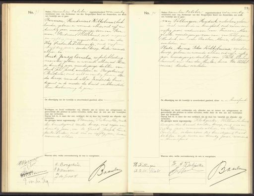 No. 73 Heden zeventien October negentienhonderd zes en veertig verschenen voor mij, Ambtenaar van den Burgerlijken Stand van Amsterdam, ten Ande een huwelijk aan te gaan: Bermon, Hendricus Wilhelmus, boek- houder geboren en wonende alhier, oud vijf en twintig jaar, meerderjarige zoon van: Ber- mon, Hendricus Wilhelmus, oud negen en vijftig jaar, acquisiteur, en: van der Weg. Frederika Willemientje, oud vijf en vijftig jaar, zonder beroep, beiden wonende alhier, en: Smit, Jansje Cornelia, confectiekleeding- naaister, geboren en wonende alhier, oud twee en twintig jaar, meerderjarige dochter van smit, Jan Jacob, overleden, en: Borgstein, Christina, oud acht en veertig jaar, zon- der beroep, wonende alhier. De ouders des brui= degoms en de moeder der bruid verklaarden hun toestemming te geven. De afkondiging tot dit huwelijk is onverhinderd geschied, alhier - Bruldegom en bruid verklaarden mij, elkander aan te nemen tot echtgenooten en getrouwelijk alle plichten te zullen vervullen, welke door de wet aan den huwelijken staat zijn verbonden. Daarop heb 1k. in naam der wet, verklaard, dat zij door het huwelijk aan elkander zijn verbonden: dds getuigen waren tegenwoordi: Bermon, Pieternella, zuster des bruidegoms, zonder beroep, oud negen en twintig jaar, en: de Groot, Jooeph, trans- portarbeider, oud een en vyftig jaar, beiden wonende alhier Waarvan akte, welke overeenkomstig de wet is voorgelezen. No. 74 Heden zeventien October negentienhonderd zes en veertig verschenen voor mij, Ambtenaar van den Burgerlijken Stand van Amsterdam, ten einde een huwelijk aan te gaan: van Tellingen, Hendrik, metselaars geboren in Zeist, wonende in Amersfoort, oud zeven en vijftig jaar, weduwnaar van: Vermeer, Mar grieta, meerderjarige zoon van: van Tellingen, Hendrik, en: van Basten, Maria, beiden overleden, en: Plato, Anna Ida Wilhelmina, zonder beroep, geboren en wonende alhier, oud vijf en vijftig jaar, meerderjarige dochter van Plats, Johannes Samuel, en: van der Meulen, Anna Ida Wilhel mina, beiden overleden. De afkondiging tot dit huwelijk is onverhinderd geschied, alhier en in Amersfoort. Bruidegom en bruid verklaarden mij, elkander aan te nemen tot echtgenooten en getrouwelijk alle plichten te zullen vervullen, welke door de wet aan den huwelijken staat zijn verbonden. Daarop heb ik, in naam der wet verklaard, dat zij door het huwelijk aan elkander zijn verbonden. dds getuigen waren tegenwoordi: Klokgieter, Willem Antonie zwager der bruid, zonder beroep, oud vier en zestig jaar, wonende alhier, en: Haven, Cornelis, schoonzoon des bruidegoms, brood bakker, oud zeven en twintig jaar, wonende in Amersfoort. Waarvan akte, welke overeenkomstig de wet is voorgelezen.