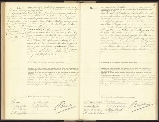 No. 75 Echtscheiding uitgesproken bij vonnis der. Lechtbank te Amsterdam van 20 September 1951, inge- schrevens te tmsterdam, heden 8 Novmber 1950 JR Mrmnler No. 75 Heden zeventien October negentienhonderd zes en veertig verschenen voor mij, Ambtenaar van den Burgerlijken Stand van Amsterdam, ten einde „ een huwelijk aan te gaan: „Luhrs, Jan Jacob, timmerman, geboren en wonende alhier, oud drie en twintig jaar meerderjarige zoon van: Luhrs, Daniël Liius, „chauffeur, en: Flore, Neeltje, oud zeven en veertig jaar, zonder beroep, beiden wonende alhier, en Rappoldt, Catharina, zonder beroep geboren en wonende alhier, oud zes en twintig jaar, meerderjarige dochter van: Rappoldt Luitje oud twee en zestig jaar, stoker, en: Visser, Tjietske, zonder beroep, beiden wonende alhier. De moeder des bruidegoms en de vader der bruid verklaarden hun toestemming te geven. De vader des bruidegoms en de moeder der bruid hebben hun toestem ming schriftelijk verleend. De afkondiging tot dit huwelijk is onverhinderd geschied, alhier Bruidegom en bruid verklaarden mij, elkander aan te nemen tot echtgenooten en getrouwelijk alle plichten te zullen vervullen, welke door de wet aan den huwelijken staat zijn verbonden. Daarop heb ik, in naam der wet, verklaard, dat zij door het huwelijk aan elkander zijn verbonden. dds getuigen waren tegenwoordg: Rappoldt, Johanna Cor nelia zuster der bruid, serveerster, oud negen en twintig jaar, en: Snabilie, Jan Dirk Jacob, havenarbeder, oud negen en veertig jaar, beiden wonende alhier Waarvan ke overe No. 76 Heden zeventien October negentienhonderd zes en veertig verschenen voor mij, Ambtenaar van den Burgerlijken Stand van Amsterdam, ten einde een huwelijk-aan te gaan: ten Bosch, Abraham, kantoorbediende, geboren en wonende alhier, oud drie en twintig jaars meer derjarige zoon van: ten Bosch, Jan, oud negen en vijftig jaar — havenarbeider, en: van der steen, Maria, oud acht en vijftig jaar zonder beroep, beiden wonende alhier, en Munsterman, Melanie Willemina, kan toorbediende, geboren en wonende alhier, oud vier en twintig jaar, meerderjarige dochter van Munsterman, Evert Pieter, oud vier en veer tig jaar bankwerker, en: Zoetigheid. cornelia Ludorica, oud een en veertig jaar, zonder beroep, beiden wonende alhier. Beider ouders verklaarden hun toestemming te geven. De afkondiging tot dit huwelijk is onverhinderd geschied, alhier Bruldegom en bruid verklaarden mij, elkander aan te nemen tot echtgenooten en getrouwelijk alle plichten te zullen vervullen, welke door de wet aan den huwelijken staat zijn verbonden: Daarop heb ik. in naam der wet verklaard, dat zij door het huwelijk aan elkander zijn verbonden. dls getuigen waren tegenwoordg: ten Bosch, Marinus, broeder des bruidegoms, expediteur, oud drie en dertig jaar en Canninga, Jan Willem, zwager des bruidegoms, Hypograaf oud negen en dertig jaar, beiden wonende alhier Waarvan akte, welke overeenkomstig de wet is voorgelezen. H hulis JC. Rappoldt. Baanla Res Kvlat JS.J. Snabel D A Hlore L Rappoltt. A. Aen Bn Munsterman Baanla C L Zoetigheid M Minsterman J ten Bosch Mtenwosck JWcarin ga. M van der Hteen