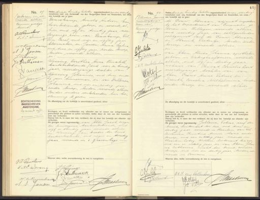 No. 87 geboren en wo- nende alhier. Renvooi goedge. keurd. aanenwekanp JA E. Weuzing x WEReuekam A S Jansen J. Wersing J V Pullemen. Vanden Huwers Jielee ECHTSCHEIDING INGESCHREVEN AMSTERDAM. 16 maart 1981 No. 87 Heden drie en twintig October negentienhonderd zes en veertig verschenen voor mij, Ambtenaar van den Burgerlijken Stand van Amsterdam, ten ende een huwelijk aan te gaan: Renvekamp, Arnold Antoon, kan toorbediende, geboren en wonende al¬ hier, oud vijf en twintig jaar meer- derjarige zoon van: Renvekamp Dil. lem Carel oud vier en vijftig jaar kleermaker, en: Jansen, Anna Sophia oud twee en vijftig jaar, zonder beroep. beiden wonende alhier. en Wensing Dorothea Anna Elisabeth, kantoorbediende. (oud vier en twintig jaar, meerderjarige dochter van wensing Johannes, oud twee en zes tig jaar, timmerman, en: van Dullemen Johanna oud vier en zestig jaar. zonder beroep, beiden wonende alhier Beider ouders verklaarden hun toe¬ stemming te geven De afkondiging tot dit huwelijk is onverhinderd geschied, alhier getrouwelijk alle plichten te zullen vervullen, welke door de wet aan den huwelijken Bruidegom en bruid verklaarden mij, elkander aan te nemen tot echtgenooten en staat zijn verbonden. Daarop heb ik. in naam der wet, verklaard, dat zij door het huwelijk aan elkander zijn verbonden. Als getuigen waren tegenwoordig: van Abbe, Jacob, zwager des briidegoms kantoorbediende, oud vijf en twintig jaar, wonende alhier en Densing, Jan, broeder der bruid kantoorbediende, oud negen en twintig jaar, wonende in 's. Gravenhage. Waarvan akte, welke overeenkomstin No. 80 ¶Olivier Jeanne meerderjarige zoon van: Renvooi goedge keurd.