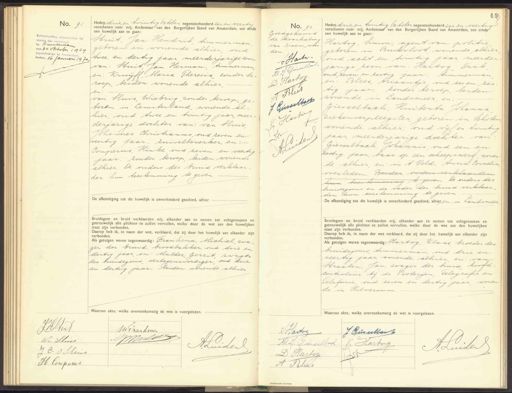 Heden drie en twintig October negentienhonderd zes en veertig verschenen voor mij, Ambtenaal van den Burgerlijken Stand van Amsterdam, ten einde een huwelijk aan te gaan: Hartog, Simon, agent van politie geboren in Buiksloot, wonende alhier oud acht en twintig jaar meerder jarige zoon van: Hartog Dirk oud zeven en zestig jaar, timmerman en: Blees, Ariaantje oud zes en zes- tig jaar zonder beroep, beiden wonende in Landsmeer, en. Giesselbach, Huiberta Johanna ziekenverpleegster, geboren in Schoten wonende alhier, oud vijf en twintig jaar, meerderjarige dochter van Giesselbach Johannes oud een en zestig jaar, baas op een scheepswerf wonen de alhier en: in t Veld, Anna Cornelia overleden. Beider onders verklaarden hun toestemming te geven De ouders des bruidegoms en de vader der bruid verklaar den hun toestemming te geven De afkondiging tot dit huwelijk is onverhinderd geschied, alhier en in Landsmeer Bruldegom en bruid verklaarden mij, elkander aan te nemen tot echtgenooten en getrouwelijk alle plichten te zullen vervullen, welke door de wet aan den huwelijken staat zijn verbonden. Daarop heb ik. in naam der wet verklaard, dat zij door het huwelijk aan elkander zijn verbonden. As getuigen waren tegenwoordg: Hartog, Klaas broeder des bruidegoms tmmerman, oud drie en veertig jaar, wonende alhier, en: van straaten Jan, zwager der bruid hoofd controleur bij de Tooferijen, Telegrafie en Telefonie oud zeven en dertig jaar, wonen de in Hilveroum. Waarvan akte, welke overeenkomstig de wet is voorgelezen. JHend M Vranken JMuld W:. Slins A. Zuiden J C d Sluis H Coupenes D Hartog J Cussbbert x H.J. Gusselberk K Hartog P. Luisen D Hartog. A Blees