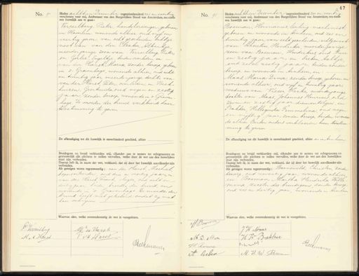 No. 90 Heden achttien December negentienhonderd zes en veertig verschenen voor mij, Ambtenaar van den Burgerlijken Stand van Amsterdam, ten einde een huwelijk aan te gaan: Verzeilberg, Pieter, handelsreiziger, geboren in Haarlem, wonende alhier, oud vijf en veertig jaar, van icht gescheiden echtgenoot van: van den Elsaker, Albertie, meerderjarige zoon van: Verzeilberg, Pieter, en: Gorlee, Engeltje, beiden overleden, en: van der Harst, Maria, zonder beroep, geboren in 's- Gravenhage, wonende alhier, oud acht en twintig jaar, meerderjarige dochter vanvan der Harst Peter, overleden, en: Beekhuizen, Geertruida, oud negen en zestig jaar, zonder beroep, wonende in 's- Graven. hage. De moeder der bruid verklaarde haar toestemming te geven De afkondiging tot dit huwelijk is onverhinderd geschied, alhier Bruidegom en bruid verklaarden mij, elkander aan te nemen tot echtgenooten en getrouwelijk alle plichten te zullen vervullen, welke door de wet aan den huwelijken staat zijn verbonden. Daarop heb ik, in naam der wet, verklaard, dat zij door het huwelijk aan elkander zijn verbonden. Als getuigen waren tegenwoordig: van der Harst, Machiel kopersorteerder, oud drie en veertig jaar en van der Harst Frank, slager oud acht en dertig jaar, beiden broeder der bruid, en wonende in s. Gravenhage. De moeder der bruid heeft met geteekend omdat zij met kan schrijven No. 91 Heden achttien December negentienhonderd zes en veertig verschenen voor mij, Ambtenaar van den Burgerlijken Stand van Amsterdam, ten einde een huwelijk aan te gaan: Bosman, Hermanus, leerling- machinist, geboren en wonende in Arnhem, oud zes en twintig jaar, van echt gescheiden echtgenoot van: Schouten, Hendrika, meerderjarige zoon van: Bosman, Hendrikus oud twee en zestig jaar, en: Sieben, Aaltje oud zes en zestig jaar, beiden zonder beroep, en wonende in Arnhem, en Maas, Maria Dina, zonder beroep, geboren en wonende alhier, oud vijf en twintig jaar, weduwe van: Visser, Feike, meerderjarige dochter van: Maas, Johannes Henricus, oud zeven en zestig jaar, diamantslijper, en Bakker Hillegonda Temmelina oud negen en viftig jaar, zonder beroep, beiden wonen de alhier. Beider ouders verklaarden hun trestem ming te geven. De afkondiging tot dit huwelijk is onverhinderd geschied, alhier en in Arnhem Bruidegom en bruid verklaarden mij, elkander aan te nemen tot echtgenooten en getrouwelijk alle plichten te zullen vervullen, welke door de wet aan den huwelijken staat zijn verbonden. Daarop heb ik, in naam der wet, verklaard, dat zij door het huwelijk aan elkander zijn verbonden. Als getuigen waren tegenwoordig: Barneveld, Christen, zonder beroep, oud zeventig jaar, wonende alhier en Bosman, Martha Hendrika Wille mina zuster des bruidegoms zonder beroep oud zes en dertig jaar, wonende in Arnhem P: Verzeilbug M Ja Harst P Vd Harst M vd Hars Reeruming H Bormen J.H. Maas 81 H F Bakker M D. Man Jhrnveld Leckeuerg H Berma A Lieler M. H. W. Bosm