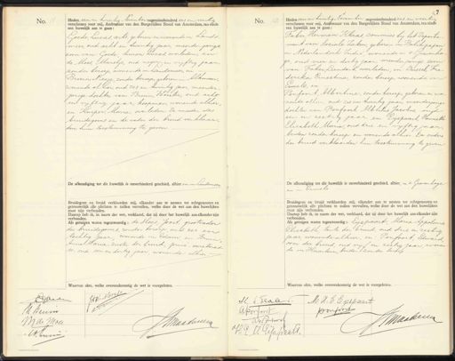 No. 11 Heden een en twintig November negentienhonderd zes en veertig verschenen voor mij, Ambtenaar van den Burgerlijken Stand van Amsterdam, ten einde een huwelijk aan te gaan: Goede, Lucas, arti, geboren en wonende in Lands- meer, oud acht en twintig jaar, meerderjarige zoon van: Goede, Simon Lucas, overleden, en: de Moes, Maretje, oud negen en vyftig jaar, zonder beroep, wonende in Landomeer, en Bruin, Niesje, zonder beroep, geboren in Alkmaar wonende alhier, oud zes en twintig jaar, meerder jarige dochter van: Bruin, Wouter, oud acht en vijftig jaar, koopman, wonende alhier en Kuiper, Maria, overleden, De moeder des bruidegoms en de vader der bruid verklaar- den hun toestemming te geven. De afkondiging tot dit huwelijk is onverhinderd geschied, alhier en in Landsmeer„ Bruidegom en bruid verklaarden mij, elkander aan te nemen tot echtgenooten en getrouwelijk alle plichten te zullen vervullen, welke door de wet aan den huwelijken staat zijn verbonden. Daarop heb ik, in naam der wet, verklaard, dat zij door het huwelijk aan elkander zijn verbonden. Als getuigen waren tegenwoordig: de Hoes, Joost, grootvader des bruidegoms, zonder beroep, oud zes en tachtig jaar wonende in Edam en: Bruin Anna Maria, zuster der bruid, privé - secretaris. se, oud een en dertig jaar, wonende alhier. No. 12 Heden een en twintig November negentienhonderd zes en veertig verschenen voor mij, Ambtenaar van den Burgerlijken Stand van Amsterdam, ten einde een huwelijk aan te gaan: Faber, Herman Klaas, commies bij het Departe- ment van Sociale Zaken, geboren in Balikpapan in Nederlandsch Indië, wonende in 's-Gravenha ge, oud vier en dertig jaar, meerderjarige zoon van: Faber, Leendert, overleden, en: Dussel, Fre- derika Ernestina, zonder beroep, wonende in Ermelo, en Ponfoort, Albertine, zonder beroep, geboren en wo„ nende alhier, oud zes en twintig jaar, meerderjarige dochter van Ponfoort, Albertus Jacobus, oud een en zestig jaar, en: Eijspaart, Henriette Elisabeth Maria, oud drie en vijftig jaar beiden zonder beroep en wonende alhier. De ouders der bruid verklaarden hun toestemming te geven De afkondiging tot dit huwelijk is onverhinderd geschied, alhier, in 's- Gravenhage en in Ermelo Bruidegom en bruid verklaarden mij, elkander aan te nemen tot echtgenooten en getrouwelijk alle plichten te zullen vervullen, welke door de wet aan den huwelijken staat zijn verbonden. Daarop heb ik, in naam der wet, verklaard, dat zij door het huwelijk aan elkander zijn verbonden. Als getuigen waren tegenwoordig: Eijspaart, Maria Appolonia Elisabeth tante der bruid, oud drie en zestig jaar, wonende alhier, en: Ponfoort Eduard oom der bruid, oud vijf en zestig jaar wonen de in Haarlem, beiden zonder berte Waarvan akte, welke overeen tig de wet is voorgelezen. JHd: Wots Ldoede M Brum Jmaaterg M de Moel W. Irnn H. K Jealer M A.E Eyspaart ponfoort Aforfont NMaalle AG Contoor 99 J CM: Uipspaars