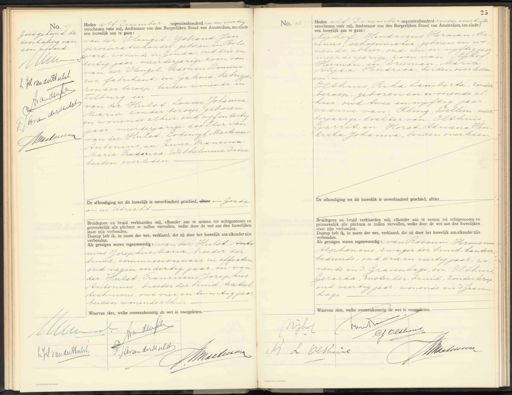 No. 45 No. 45 Goedgekeurd de doorhaling van: een proord Ium L J van der Hal o do C Jmalunn Heden elf December negentienhonderd zes en veertig verschenen vóór mij, Ambtenaar van den Burgerlijken Stand van Amsterdam, ten einde een huwelijk aan te gaan: van der Vleugel, YJsbrand Jan procuratiehouder, geboren in Bols„ ward, wonende in Gouda, oud drie en dertig jaar, meerderjarige zoon van van der Vleugel, Sidonius Domini„ cus, fabrikant, en Galema, Siebrigje zonder beroep, beiden wonende in Filburg, en van der Hulst, Louise Johanna Maria, zonder beroep, geboren en wonende alhier, oud vijf en dertig jaar, meerderjarige dochter van van der Hulst, Lodewijk Martinus Antonius, en Zuur, Francina Maria Crederica Wilhelmina Dina beiden overleden De afkondiging tot dit huwelijk is onverhinderd geschied, alhier in Gouda en in Utrecht Bruidegom en bruid verklaarden mij, elkander aan te nemen tot echtgenooten en getrouwelijk alle plichten te zullen vervullen, welke door de wet aan den huwelijken staat zijn verbonden. Daarop heb ik, in naam der wet, verklaard, dat zij door het huwelijk aan elkander zijn verbonden. Als getuigen waren tegenwoordig: van der Hulst, Anto mus Jozephus Maria, broeder der bruid, commissionnair in effecten oud negen en dertig jaar, en: van der Hulst Franciscus Jozephus Antonius, broeder der bruid, textiel technicus, oud vier en twintig jaar beiden wonende alhier Waarvan akte, welke overeenkomstig de wet is voorgelezen.- No. 46 25 Heden elf December negentienhonderd zes en veertig d verschenen vóór mij, Ambtenaar van den Burgerlijken Stand van Amsterdam, ten einde een huwelijk aan te gaan: Nijhof, Hendricus Herman Ma rinus, schoenmaker, geboren en wo nende alhier, oud een en vijftig jaar meerderjarige zoon van: Nijhof Herman, en Drieman, Maria Alijda Hendrica, beiden overleden en Olthuis, Rika Lamberta, zonder beroep, geboren en wonende al„ hier, oud twee en vyftig jaar. weduwe van: Kling, Willem, meer derjarige dochter van: Olthuis jarrit, en: Horst, Adriana Hen- drika Johanna, beiden overleden De afkondiging tot dit huwelijk is onverhinderd geschied, alhier. Bruidegom en bruid verklaarden mij, elkander aan te nemen tot echtgenooten en getrouwelijk alle plichten te zullen vervullen, welke door de wet aan den huwelijken staat zijn verbonden. Daarop heb ik, in naam der wet, verklaard, dat zij door het huwelijk aan elkander zijn verbonden. Als getuigen waren tegenwoordig: van Rossum, Hermanus Alphonsus, zwager der bruid, kantoor„ bediende, oud drie en veertig jaar wo„ nende in 's- Gravenhage, en Olthuis Gerarda, zuster der bruid, zonder beroep oud veertig jaar, wonende in 'sGraven hage Aan Mof Mulu P: J: Avan der Kuld LJA Van de Halst Amiehuan Van Po Ngho G. Olthns Jetme R L Oltherl