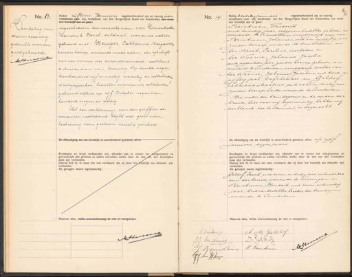 No. 13. No. 13. Voorhaling van Drie en zeventig gedrukte woorden goedgekeurd, Maansont Heden vijftien Januari negentienhonderd zes en veertig is door verschenen voor mij, Ambtenaar van den Burgerlijken Stand van Amsterdam, ton oinde een huwelijk aan te geen: moeschreven ten verzoeke van: van Duivenbooden Hendrik Carel, soldaat, wonende alhier. gehuwd met: Kruiger, Catharina Margaretha zonder beroep, wonende mede alhier, een afschrift van een vonnis der arrondissements- rechtbank te Amsterdam van twintig september negen„ tienhonderd vijf en veertig waarbij de echtscheiding is uitgesproken tusschen voornoemde echtelieden, gehuwd alhier op vijf October negentien„ honderd negen en dertig. Uit een verklaring van den griffier der voormelde rechtbank blijkt, dat geen aan¬ teekening van gedaan verzet is geschied. tet de Bruidegom en bruid verklaarden mij, elkander aan te nemen tot schtgenooten en getrouwelijk alle plichten te zullen vervullen, welke door de wet aan den huwelijken staat zijn verbonden. Daarop heb ik, in naam der wet verklaard, dat zij door het Huwelijk aan elkander zijn verbonden. Als getuigen waren tegenwoordig: Waarvan akte, wetteg vant de weel No. 14. Heden Zestien Januari negentienhonderd zes en veertig verschenen voor mij, Ambtenaar van den Burgerlijken Stand van Amsterdam, ten einde een huwelijk aan te gaan: Brinkman, Frederik oud twintig jaar, telegrambesteller, geboren en wonende te Amsterdam, minderjarige zoon van Brinkman, Johannes, oud een en vijftig jaar zonder beroep, wonende te Amsterdam en ten-Broek, Carolina, overleden en ter Weeme, Johanna Jacoba oud negentien Jaar, zonder beroep, geboren en wonende te Amsterdam, minderjarige dochter van ter Weeme, Johannes Jacobus, oud twee.en vijftig jaar, Cafehouder en Geldof, Adriand Martina, oudacht en Veertig jaar zonder beroep, beiden wonende te Amsterdam. De vader des bruidegoms en de ouders der bruid, hier voor mij tegenwoordig, hebben mij verklaard toe te stemmen, in dezen echt- De aftondigng tot dit huwelijk is onverhinderd geschied, alhier op vijf Januari dezes jaars. Bruidegom en bruid verklaarden mij, elkander aan te nemen tot echtgenooten en getrouwelijk alle plichten te zullen vervullen, welke door de wet aan den huwelijke staat zijn verbonden. Daarop heb ik. in naam der wet, verklaard, dat zij door het huwelijk aan elkander zijn verbonden. Als getuigen waren tegenwoordig: Geldof, Izaak oud zeven en dertig jaar uitvoerde oom der bruid, wonende te Wieringen en Brinkman, Hendrik, oud zeven en twintig jaar, brievenbestellen, broeder des bruidegoms wonende te Amsterdam. Waarvan akte, welke overeenkomstig de wet is voorgelezen. Nmmelin J. Brinkma A M Geldof D: Col Dof J.J. ter Weems N H. Brinkman CBrunr GJ. Wz