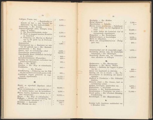24 Gedingen (Voeren van) . eN “ “ » — Regtskundig on- derzoek tot het —, met inbegrip der deklaratiën van den stads-advokaat. Geldleening. — Zie: Leening. Gemeenschappelijke zaken, belangen, inrig- tingen of werken: 1’. Zes Noord-Hollandsche steden , 2°. Zand- en jaagpad tusschen Breukelen en Ouderkerk ee 3°. Uitkeering aan Haarlem en Rijnland van 2/3 der pacht van de Overtoom- sche sluis. Gemeenteblad ne Gemeentegrond enz. — Restitutie ter zake van het gebruik van —. Zie: Restitutie. Gemeenteraad. — Zie: Raad. Genees-, heel- en verloskundige school . Geneeskundige armverzorging . Ge Geneeskundige dienst (Kommissie van toezigt op de stedelijke). SN Gezondheidskommissie (Plaatselijke) . Gijzeling van veroordeelde overtreders van politie-verordeningen . Goten. — Zie: Riolen. Grachten. — Zie: Diep- en schoonhouden. Gratifikatiën. Ee u — Zie: Premiën. Grondbelasting. — Uitkeering aan het Rijk van het aandeel in de kwade posten 1864. Grondlasten wegens gebouwde en onge- bouwde eigendommen. Gymnasium Handel en nijverheid (Openbare school NN EN Haven- en kaaïmeesters. — Jaarwedde der — en verdere kosten voor de havendienst. Havens, vaarten, kaaimuren, sluizen en an- dere waterwerken . a: Havens. — Zie: Diep- en schoonhouden. Heffingen. — Kosten van invordering van onderscheidene inkomsten en — Hooisteker. — Jaarwedde Hoop (Museum van der). 3,750. — 1,107.50 L— 1,260. — 83,000.— 100. 1 25 Horologiën. — Zie: Klokken. Hortus Botanicus - Huiszittenhuis. — Subsidie IE Huizen, torens, poorten enz. — Onderhoud: a. onder beheer van het dagelijksch be- stuur a b. onder beheer der kommissie voor de rentegevende eigendommen . Hulpgelden. — Zie: Drenkelingen. Hulponderwijzers en kweekelingen. Huren en erfpachten . Ee Huren van scheepstimmerwerven (Terug: gave van). ee 1. Industrieschool voor de vrouwelijke jeugd . K. Kaaimeesters. — Zie: Havenmeester. Kaaimuren. — Zie: Havens, Wallen. Kadaster. — Dubbelen der leggers en plans Le A Kamer van koophandel en fabrieken . Keuring van vee en vleesch. — Zie: Vee. Kiezerslijsten en uitoefening der kiesver- UOMO. 10 cela ele Kinderen te Veenhuizen. — Zie: Uitbestede kinderen. Klinische school. — Zie: Genees-, heel- en verloskundige school. Klokken, horologiën, speelwerken enz. Klokkenisten. — Jaarwedde Os Kolonisten. — Zie: Bedelaarskolonisten. Krankzinnigen. — Verpleging van arme —, Kwade posten. — Zie: Personele Belasting, Grondbelasting. Kweekelingen. — Zie: Hulponderwijzers. L. Leening 4 pCt. krachtens raadsbesluit van 5 December 1855: 1,500.— 21,770.89 9,580. — 50,751.— 21,770.89 Invordering (Kosten van), der plaatselijke belastingen. — Zie: Belastingen. Invordering (Kosten van), van onderschei- dene inkomsten en heffingen