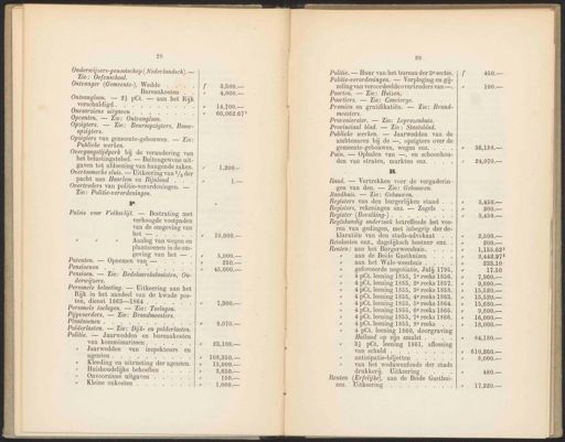 28 Onderwijzers-genootschap ( Nederlandsch). — Zie: Oefenschool. Pp. Paleis voor Volksvlijt. — Bestrating met verhoogde voetpaden van de omgeving van IE Aanleg van wegen en plantsoenen in de om- geving van het — . 3,500. — 4,000.— 14,700.— 60,062.675 10,000.— 5,000. — 250. 45,000.— 7,800.— 9,070.— 23,108.— 108,350.— 15,000.— 3,650. — 150.— 1,000. — 29 Politie. — Huur van het bureau der 8e sectie. Raad. — Vertrekken voor de vergaderin- gen van den. — Zie: Gebouwen. Raadhuis. — Zie: Gebouwen. Registers van den burgerlijken stand . Registers, rekeningen enz. — Zegels Register (Bevolking) . . Regtskundig onderzoek betreffende het voe- ren van gedingen, met inbegrip der de- klaratiën van den stads-advokaat Reiskosten enz., dagelijksch bestuur enz. Renten: aan het Burgerweeshuis. aan de Beide Gasthuizen aan het Wale-weeshuis . : geforceerde negotiatie, Julij 1795, 4 pCt. leening 1855, 1e reeks 1856. 4 pCt. leening 1855, 2e reeks 1857. 4 pCt. leening 1855, 8e reeks 1858. 4 pCt. leening 1855, 4e reeks 1863. 4 pCt. leening 1855, 5e reeks 1864. 4 pCt. leening 1855, 6e reeks 1865. 4 pt. leening 1855, 7e reeks 1866. 4 püt. leening 1855, 8e reeks 4 pCt. leening 1860, doorgraving Holland op zijn smalst . . 3: pCt. leening 1861, aflossing van schuld . EN anticipatie-biljetten ij van het weduwenfonds der stads drukkerij. Uitkeering . . Renten DI] aan de Beide Gasthui- zen. Uitkeering 3,450. 200. 3,450. 2,500.— 200. 1,155.625 2,442.975 233.10 17.50 7,960.— 9,800. — 15,520.— 15,520.— 15,680.— 9,800. 16,000.— 18,000.-— 84,180.— 610,260.— 8,000. — 480. 17,220.— Ontvanger (Gemeente). Wedde Patenten. — Opnemen van — Politie-verordeningen. — Verpleging en gij- zeling van veroordeelde overtreders van —. Bureaukosten Pensioenen es io Poorten. — Zie: Huizen. Ontvangloon. — 24 pCt. — aan het Rijk verschuldigd . a Pensioen. — Zie: Bedelaarskolonisten, On- derwijzers. Poortiers. — Zie: Concierge. Onvoorziene uitgaven . : Personele belasting. — Uitkeering aan het Rijk in het aandeel van de kwade pos- ten, dienst 18631864 . a Premiën en gratilikatiën. — Zie: Brand- meesters. Opcenten. — Zie: Ontvangloon. Personele toelagen. — Zie: Toelagen. Provenierster. — Zie: Leprozenhuis. Opzigters. — Zie: Beursopzigters, Bouw- opzigters. Pijpvoerders. — Zie: Brandmeesters. Provinciaal blad. — Zie: Staatsblad. Opzigters van gemeente-gebouwen. — Zie: Publieke werken. Dintsoehen "se Publieke werken. — Jaarwedden van de ambtenaren bij de —, opzigters over de gemeente-gebouwen, wegen enz. . Overgangstijdperk bij de verandering van het belastingstelsel. — Buitengewone uit- gaven tot afdoening van hangende zaken. Polderlasten. — Zie: Dijk- en polderlasten. Puin. — Ophalen van —, en schoonhou- den van straten, markten enz. Overtoomsche sluis. — Uitkeering van 2/4 der pacht aan Haarlem en Rijnland i Politie. — Jaarwedden en bureaukosten Overtreders van politie-verordeningen. — Zie: Politie-verordeningen. van kommissarissen . Ee Jaarwedden van inspekteurs en geenen. … = NE 1 0 Kleeding en uitrusting der agenten. Huishoudelijke behoeften . Onvoorziene uitgaven Kleine onkosten