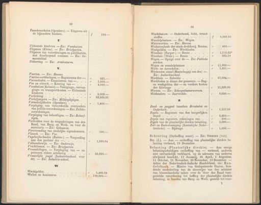 32 Tusschenscholen (Openbare). — Uitgaven uit de bijzondere fondsen. A ee ie u. Uitbestede kinderen. — Zie: Veenhuizen. Vv. Vaarten. — Zie: Havens. Vaccine-verklaringen. — Registreren der —. Varenslieden. — Examineren van —. w. Wachtgelden. Wallen en kaaimuren ij 825.— 1,000.— 4,800.— 9,002. — 92,569.91 1,400.— 500.— 1,550.04 5,400.94 109,000.— 38 Wachthuizen. — Onderhoud, licht, brand- stolnsse zi le ; Zand- en jaagpad tusschen Breukelen en Ouderkerk. NE Zegels. — Registers van den burgerlijken stand Dn Zegels van registers, rekeningen enz. . Zegels van de plaatselijke direkte belasting. Zeil- en Roeivereeniging (Koninklijke Neder- 8,998.50 480.— 1,155.625 233.10 11,000.— 1,851. — 57,094.— 11,828.80 8,000.— 1,107.50 3,450. — 1,000.— Bekeuring (Ontheffing eener). — Zie: SWIETEN (VAN). Ber (J.). — Aan — ontheffing van plaatselijke direkte be- lasting verleend, 19 December. Belasting (Plaatselijke direkte). — Aan eenige belastingschuldigen ontheffing van — verleend, anderen niet ontvankelijk verklaard, op de adressen van anderen afwijzend beschikt, 17 Januarij, 25 April, 1 Augustus, 11 October, 15 November, 28 November, 19 December. _ Adres der Nederlandsch-Indische Handelsbank, zie: Han- delsbank. — Missive van Gedeputeerde Staten, hou- dende mededeeling van de zienswijze van den minister van binnenlandsche zaken over de door den Raad vast- gestelde verordening tot heffing der plaatselijke direkte belasting, in handen van Burg. en Weth. gesteld tot voor- 3 Uitgaven (Kleine). — Zie: Briefporten. Vee en vleesch. — Keuring van — . : Wandelplaatsen. — Zie: Wegen. landsche). — Bijdrage. LT, 200.— 3,000.— Uitgaven van verordeningen en publikatiën, met doorloopend nommer. — Zie: Ge- meenteblad. Veenhuizen (Kolonie). — Vestigings-, vervan- gings- en transportkosten. — Uitbestede kinderen . : Waterwerken. — Zie: Havens. _ Uitkeering. — Zie: Armbesturen. Fering ee Weduwenfonds der stads drukkerij. Renten. Verlofgangers. — Zie: Militiepligtigen. Weekgelden. — Zie: Werklieden. Vermakelijkheden (Openbare). . Weeshuis (Burger-). — Rente . Verpleging van veroordeelde overtreders van politie-verordeningen. — Zie: Politie- verordeningen. Weeshuis (Wale-) — Rente . . Verpleging van behoeftigen. — Zie: Behoef- tigen. Wegen. — Opzigt over de —. Zie: Publieke werken. Vertrekken voor de vergaderingen van den Raad, van Burg. en Weth. en voor de secretarie. — Zie: Gebouwen. Wegen en wandelplaatsen Vervreemding van stedelijke eigendommen. Werk- en leerscholen . ado EE Vleesch. — Zie: Vee. Werkenden stand (Maatschappij van den) —. Zie: Ambachtsschool. Vogelwijks-landen (Buiten-). — Vergoeding aan den pachter der —. ee , Werkhuis. — Subsidie . Td, Volksonderwijs. — Zie: Onderwijs. Werklieden in dienst der gemeente. — Dag- en weekgelden der — en verdere kosten der fabricage lab, A0 Va Vrachtloonen. — Zie: Briefporten. Werven. — Zie: Scheepstimmerwerven. Vreemdelingen. — Verpleging van — en personen elders armlastig ee Wethouders. — Jaarwedde. } Vrouwelijke jeugd (Industrieschool voor de). — Zie: Industrie-school.