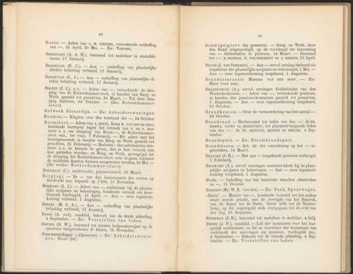 40 Boete. — Adres van A. TOEPOEL, verzoekende ontheffing van —, 25 April, 30 Mei. — Zie: TOEPOEL, BOISSEVAIN (A. A. H.), benoemd tot makelaar in manufak- turen, 17 Januari. BossEvAIN (E. C.). — Aan — ontheffing van plaatselijke direkte belasting verleend, 17 Januarij. BOISSEVAIN (G. J.). — Aan — ontheffing van plaatselijke di- rekte belasting verleend, 17 Januari. BOLTEN (J. J.), c.s. — Adres van —, verzoekende de dem- ping van de Rotterdammer-sloot, in handen van Burg. en Weth. gesteld tot preadvies, 28 Maart, — Tot deze dem- ping besloten, 24 October. — (Zie: Rotterdammer- sloot). Bolwerk Sloterdijk. — Zie: Arbeiderswoningen. Boomen. — Klagten over den toestand der —, 24 October. Boomsloot.— Adres van J. BEETZ, firma M. VAN SON en ZOON, houdende bezwaren tegen het verzoek van P, en S. REN- DORP €. s. om demping van Krom —, de Rotterdammer sloot enz, ter visie, 7 Februari. — Dit adres met het laatstgenoemde in handen van Burg. en Weth. gesteld tot preadvies, 21 Februarij. — Besloten: den adressanten REN. DORP C.S, te kennen te geven, dat in hun verzoek niet kan getreden worden; en Burg. en Weth. gemagtigd tot de demping der Rotterdammer-sloot over te gaan, wanneer de middelen daartoe kunnen aangewezen worden, 80 Mei. — (Zie verder: Rotterdammer-sloot). BORGBART (C.), nachtwacht, gepensioneerd, 28 Maart. Borgtogt. — De — van den kommissaris der veeren op Dordrecht enz. bepaald op f 600, 15 November. BORMANN (J. J.). — Adres van — ambtenaar bij de plaatse- lijke accijnsen en belastingen, houdende verzcek om door- loopend wachtgeld, 18 April. — Aan — eene tegemoet- koming verleend, 1 Augustus. Borski (M. S. A). — Aan — ontheffing van plaatselijke belasting verleend, 17 Januarij Bosse (A. VAN), raadslid, behoort tot de derde afdeeling, 4 September. — Zie: Voorstellen van leden. BouTEn (D. W‚), benoemd tot eersten hulponderwijzer op de openbare burgerscholen 2e klasse, 15 November. Bouwmaatschappij (Algemeene). — Zie: Arbeiderswonin- gen, HAAN (DE). 41 wopzigters der gemeente. — Burg. en Weth. door ee ee | op de voordragt ter benoeming van — dubbeltallen te plaatsen, 14 Maart. — Benoemd tot —: B. HAMERS, W. TER REEHORST en A. DEKKER, 18 April. BRAND (J. VAN SOMEREN). — Aan — eervol ontslag verleend als inspekteur der plaatselijke accijnsen en belastingen, 1 Mei. — Aan — eene tegemoetkoming toegekend, 1 Augustus. Brandwezen. — Art. 24 der verordening op het — in- getrokken, 14 Maart. | BRANSEN (J. H.). — Het aan — toegekende pensioen verhoogd, lj i klerk bij de plaat A (A.), eervol ontslagen assistent-kler - Dijke ee en belastingen. — Aan — eene tegemoet- koming toegekend, 1 Augustus. Breda. — Opheffing van het beurtveer tusschen Amsterdam en —, 11 October. BREGGEN (Mr, W.K. VAN DER). — Zie: Park, Spoorwegen. “Brin”. — Missive van —, houdende voorstel tot het maken eener breede gracht, aan de overzijde van het Damrak, van de Beurs tot de Oude-, liever zelfs tot de Nieuwe- brug; op dit ongezegeld stuk overgegaan tot de orde van den dag, 29 Augustus. "a E BRINKMAN (J. H.), benoemd tot makelaar in EN id. — Lid der kommissie voor het bur- ee en lid en voorzitter der kommissie van onderzoek der aanvragen om pensioen, wachtgeld enz., 4 September. — Behoort tot de tweede afdeeling, 4 Sep- tember. — Zie: Voorstellen van leden. Brandassurantie Museum VAN DER HOOP. — Zie: Hoop (VAN DER). De s keluider van den BRANDENBURG (A.), eervol ontslagen klok 3 Westerkerktoren. — Adres van _— verzoekende pensioen, in handen der pensioen-kommissie gesteld tot preadvies, l Augustus, — Aan — eene tegemoetkoming toegekend, 10 October. Brandkranen. — Over de vermeerdering van het aantal —, 24 October. ei Brandraad. — Herbenoemd tot leden van den —: de hh. MOMMA, LUDEN en HESHUYSEN; tot plaatsvervangende leden van den —: de hh. BIENFAIT, MENDES en BEELOO, 4 Sep- tember. ' Brandspuit. — Zie: Stoombrandspuit.