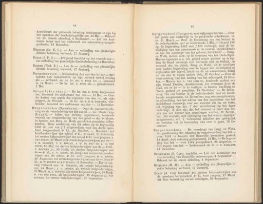 44 kontròleurs der personele belasti BÜCHNER (Dr. E. C.). — Aan — ontheffing van plaatselijke direkte belasting verleend, 17 Januari. BuNGe (J. P. G.). — Afwij i IG). ijzend beschikt op het verzoek van — om ontheffing van plaatselijke direkte lastig Do BuNKER (Wed. K.). — Aan de — ontheffing ij direkte belasting verleend, 17 ei eden . Burgemeester. — Mededeeling dat aan den hr. mr. 3. MEs- gei VAN VOLLENHOVEN op zijn verzoek eervol ontslag als — verleend, en de hr. mr. C. FOCK tot — benoemd ea jd 5 Jd laart. — De hr. mr. C. FOCK als — geïnstalleerd, Burgerlijken stand. — De hr. mr. C. Fock, burgemees- ter, benoemd tot ambtenaar van den —, 16 Mei À Over de kosten van zegels der registers van den —, als rijks uitgave, 24 October. — De hr. mr. B. H. M. DRIESSEN DE houder, benoemd tot ambtenaar van den —, 19 December Burgerscholen (Openbare). — Over de ring en de vermindering van ee aantal —, EO (Lager). — Adres van twintig ingezetenen We verzoek om vermeerdering van het getal — der 4e klasse in handen van Burg. en Weth. gesteld tot preadvies, 4 Sep- tember. Naar aanleiding van dit adres op de begrootin 1867 de post van f 1 uitgetrokken voor een derde EE bare burgerschool 4e Kl, 24 October, — Benoemd: tot hoofdonderwijzer der school 4e Kl, w. LAAN, 21 Februari: tot eersten hulponderwijzer der school 4e Kl. voor jongens 4 VAN BUREN, 21 Maart ; tot tweede hulponderwijzers aan de a J. M. ELSHOUT, T. P. ADRIAN, J. W. DE ROO en J. E TER Gouw, 30 Mei; tot derden hulponderwijzer aan de _ Tekl d MOUWER Jr, 20 Junij; tot derden hulponderwijzer aan e— 4e kl, G. w. SKENE, 20 Junij: tot eersten hulponder- wijzer aan de school 4e kl, voor jongens, H. C. ROGGE 29 Augustus; tot eerste hulponderwijzers aan de —, 2e en 4 kl. D. W. BOUTEN en J. P.JANSEN, 15 November: — Eervol ont- slag verleend aan: W. MELGERD, als tweede hulponderwij- ej Maart; J. P. JANSEN, als tweede halponderwijze l Maart ;M. A. TERWEN, als eerste hulponderwijzer 20 Junij: D. VAN DEN BERG, als hulponderwijzer, 29 Augustus; A IE BUUREN, als eerste hulponderwijzer, 20 September ee 45 Burgerschool (Hoogere), met vijfjarigen kursus. — Over het gemis aan onderwijs in de praktische scheikunde, 14 en 21 Maart. — Over de benoeming van een leeraar in de nederlandsche taal en letterkunde, 1 Mei. — De post 150 op de begrooting 1867 met f 750 verhoogd, voor de be- zoldiging van een amanuensis in de natuur- en scheikunde en van een concierge van het gebouw, 24 October. — Burg. en Weth. stellen voor, op de terreinen van het Oude-Zijds- Heeren-logement €.s. een geheel nieuw gebouw op te rig- ten; de Raad vereenigt zich hiermede niet en besluit, op voorstel des hn. Jäcer, Burg. en Weth. uit te noodigen eene nadere begrooting over te leggen van de inrigting en exploitatie der school, hetzij op de nu aangewezen, hetzij op een aan te wijzen andere plek, 25 October. — Over de verminderiug van het bedrag van het schoolgeld, 25 Octo- ber. — Missive van A. VAN LIER 1Z., houdende aanbod van zijn Grand Théâtre, Amstelstraat, ter overname door de stad, om er de — in te vestigen, in handen van Burg. en Weth. gesteld tot preadvies, 15 November. — De benoe- ming van een leeraar in de nederlandsche taal en letter- kunde aangehouden, 15 November; nog eens aangehouden, in afwachting van het advies van den inspekteur van het middelbaar onderwijs over een voorstel des hn. DE VRIES, tot wijziging van art. 7 der verordening op het lager onderwijs, in dien zin, dat het doceren in meer dan één vak aan één leeraar kan opgedragen worden, 28 Novem- ber. Dit voorstel, met bijvoeging van het woord stijdelijk” aangenomen; art. 7 voornoemd mitsdien zoo gewijzigd, en besloten tot de benoeming niet over te gaan, 19 De- cember. Burgerweeshuis. — De voordragt vau Burg. en Weth. tot goedkeuring der rekeuing en verantwoording van het — over 1865 in handen der financiële kommissie gesteld, 18 April; deze rekening goedgekeurd, 16 Mei. — De begroo- ting van het — voor 1867 goedgekeurd, 29 Augustus. — Tot regent van het — herbenoemd de hr. C. R. VAILLANT, 19 December. Burreine (H. M). — Aan — onthefing van plaatselijke di- rekte belasting verleend, 17 Januari. BUREN (A, VAN), benoemd tot eersten hulponderwijzer aan de openbare burgerschool 4° kl. voor jongens, 21 Maart; uit deze betrekking eervol ontslagen, 20 September. le belasting behulpzaam te zijn bij le opmaken der beschrijvingsbiljetten, 30 Mei. We ot de tweede afdeeling, 4 September. — Lid der kom- missie belast met het onderzoek der schouwburg-aangel genheden, 19 December. Wij BussEmAKER (S. Cars). raadslid. — Lid der kommissie van voorbereiding van financiële onderwerpen, 4 September. — Behoort tot de eerste afdeeling, 4 September.