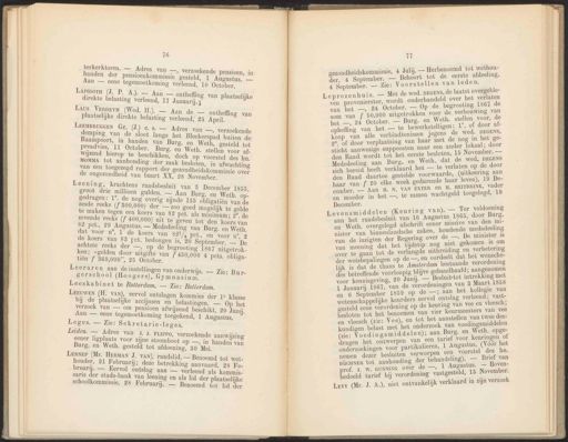 76 eg — Adres van 11 16 . € —_ in 2 der pensioenkommissie i eene tegemoetkoming ve APIDOTH (J P. A direkte belast „. — Aan — ontheff elasting verle hefing van plaatselij Elie ner 5 end, 17 Januarij, 4 plaatselijke Leprozenhuis. — Met de wed. DEGENS, de laatst overgeble Ne (Wed. H.). — Aan de ven provenierster, wordt onderhandeld over het verlaten ke direkte belasting verleend” In ontheffing van van het -—, (24, October. Op de begrooting 1867 de LEEMBRUGGEN Gz (1) ‚ 25 April. som van f 50,000 uitgetrokken voor de verbouwing van emping van d ) C.S. — Adres van — het —, 24 October. — Burg. en Weth. stellen voor, de R g van de sloot langs 1 ‚ verzoekende 5 : De aampoort, in hande angs het Bleekerspad buiten d opheffing van het — te bewerkstelligen: 1. of door af- preadvies, 11 oen we Burg. en Weth, ei . koop van alle verbindtenissen jegens de wed. DEGENS, wijzend hierop te be hi urg. en Weth. stellen voo 9° of door verplaatsing van haar met de nog in het ge- MOMMA tot aan! eschikken, doch op voorstel Pe sticht aanwezige suppoosten naar een ander lokaal; door ve een Ee In zaak besloten, in ej den Raad wordt tot het eerste besloten, 15 November. — de 57 ‘CB rapport der gezo ids SV Ng ededeeli ; je ; aN 7 ongezondheid van buurt XX issie DET eg A) ee eeni , 7 vember. — 1 Ma Ti krachtens raadsbesluit van 5 D den Raad daartoe gestelde voorwaarde, (uitkeering aan IE millioen gulden. — Aan B ecember 1855, haar van f 20 elke week gedurende haar leven), 19 De- gen: 1°. de nog overio zij burg. en Weth. op- cember. — Aan H. N. VAN EXTER en H. HEITBRINK, vader zesde reeks (f 8 \ g zijnde 155 obligatië ' te mak 00,000) der —'zoo goed gatiën van de en moeder in het —, te zamen wachtgeld toegelegd, 19 en tegen een koers van 89 5 mogelijk te gelde December. pet. als minimum; 2°, de Levensmiddelen (Keuring van) ‚ verzoekende pensioen, í n, , a N gesteld, 1 ee mn gezondheidskommissie, 4 Julij. — Herbenoemd tot wethou- rleend, 10 October. der, 4 September. — Behoort tot de eerste afdeeling, 4 September. — Zie: Voorstellen van leden. — Ter voldoening zevende ree i eks (f 400,000) uit te geven tot den koe " oers van aan het raadsbesluit van 16 Augustus 1865, door Burg. $2 pet, 29 Augnstus ae Angnstas. — Mededeling van Burg. en Wet! Vi a de koers van 83 rct eN van 821/, pet, en ER eth. en Weth. overgelegd afschrift eener missive van den mi- achtste reeks on edongen is, 20 September n.2 nister van binnenlandsche zaken, houdende mededeeling ken: gelden door uil op de begrooting 1867 iiet De van de inzigten der Regering over de —. De minister 1S tiën f 369,000” van f450,000 4 pcts kt VE van meening dat het tijdstip n08 niet gekomen Is Om Leeraren ! ee ctober. {9D En over te gaan tot de verlangde uitbreiding en verbetering ge aan de instellingen van onderwijs í der wetsbepalingen op de —, en oordeelt dat het wensche- gerschool (Hoogere), Gymna lerwijs. — Zie: Bur- lijk is dat de thans te Amsterdam bestaande verordening Leeskabinet te Rotterda ep des betreffende voorloopig blijve gehandhaafd; aangenomen LEEUWEN (H. VAN), eer m. — Zie: Rotterdam. voor kennisgeving, 20 Junij. — Besluittot intrekking met bij de vol ontslagen kommies der Ie kl 1 Januarij 1867, van de verordeningen van 3 Maart 1858 verzoek van Neenee en belastingen. — Op en 6 September 1859 op de —; aan het kollegie van Aan — eene ee afwijzend beschikt, 20 ! De wetenschappelijke keurders eervol ontslag verleend; vast- Less bee oming toegekend, 1 AU t urn). gesteld eene verordening op de keuring van vee en vleesch; an Zie: Sekretarie-lege eee besloten tot het bencemen van vier keurmeesters van Vee Leiden. — Adres van 7 pe. en vleesch (zie: Vee), en tot het aanstellen van twee des- eener ligplaats voor ie RT verzoekende aanwijzin kundigen belast met het onderzoek van voedingsmiddelen Burg. en Weth. steld tot A00 op —, in Bande (zie: Voedingsmiddelen); aan Burg. en Weth. opge- LENNEP (Mr. HerMAN J aldoening, 30 Mei. dragen het ontwerpen van een tarief voor keuringen of houder, 21 Februa ej VAN), raadslid. — Benoemd tot wet onderzoekingen voor partikulieren, 1 Augustus. (Vóór het bruarij. — Eero; deze betrekking aanvaard PA nemen dezer besluiten verworpen CON. voorstel des bn. sars der stads] le aan — verleend als'k Fe- pücHNER tot aanhouding der behandeling). — Brief van ads-bank van leening en als lid d SOINS prof. J. W. GUNNING over de —, 1 Augustus. — Boven- er plaatselijke bedoeld tarief bij verordening vastgesteld, 15 November. scl se, schoolkommissie, 28 Februarij. — Benoemd tot lid i 0 1 dada Levy (Mr. J. A), niet ontvankelijk verklaard in zijn verzoek