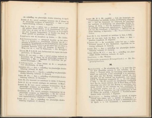 78 om ontheffing van plaatse] LicHEr (J. S.), eervol ontslagen kommies der 2e de plaatselijke accijnsen en belastin tegemoetkoming verleend, 1 Augustus. LIER Iz, (A. van). — Adres y zijn gebouw Grand Théâtre, name door de stad, om het tot eene hoogere burgerschoo] Weth. gesteld’ tot preadvies, 15 November. Ligplaats voor de stoomboot op Leiden. Lijnbaansgracht. Van C. J. GRADER C. 5, tusschen de Spiegelgra beschikking tevens he ‚ verzoekende demping van de —, cht en het Leidscheplein; door welke slist is op het adres van J. K, JOB C.S, houdende bezwaren tegen die demping, 17 Januarij. — LINDEN (T. vAN DER). — Aan — eervol ontslag verleend als kontròleur der 3° klasse bij de plaatselijke accijnsen en belastingen, 1 Mei. — Benoemd tot kontrôleur ' der ge- meente-belastingen, 1 Mei, LUDEN (G.). — Aan — ontheffing van plaatselijke direkte belasting toegekend, 17 Januari. : Bruggen. ‚ herbenoemd tot regent der beide huizen op de — aangekocht ng van plaatselijke direkte & van plaatselijke & van plaatselijke direkte in tabak, 17 Januari. makelaar, 14 Maart. } eervol ontslagen kommandeur bij de eene e ‚ H.L. M.), ike direkte belasting, 25 April. Luwen (Mr. H klasse bij gen. — Aan — eene an —, houdende aanbod van in de Amstelstraat, ter over- te verbouwen en in te rigten — Zie: Leiden. — Afwijzend beschikt op het adres 19 raadslid. — Lid der kommissie van voorbere d ng van publ eke werke 21 t ebrua |, 4 p - 8 ) 1 Dn, r1 Se tem ijke direkte be- ituti ijving van plaatselijke c De Ee ee kommissie ui eon el ie rentegevende eigendommen, Von en EE brandraad, 4 September A eere iN afdeeling, 4 September. — Zie: leden. ë " L M.C. A) benoemd tot makelaar 1n ig DE GT tl, A), B (G. vAn DER), bode bij Burg. en Weth een toegekend, 29 se ee roonkelder onder an AN eren “609, Kerkstraat, ongeschikt ter be rende r vn verklaard, 17 January. ek: LUSINK (B) _ Aan — ontheffing van plaa UNE 1e Januari]. Nij ij Aan de — A AE van plaat- sKE (Erven W. C.). ) ) are ge belasting verleend, 25 Apr! Lusttuin. — Zie: WERKER. ei ie We Luthersche gemeente (Evangel1 graafplaatsen. Julij. elijke direkte Mm. : dan één ì : Tr — 1m meer Iakelaardij. — De uitoefening a verboden. 7 Ja vak door denzelfden oe oe eener raadskom- € ot D le) “ _ Voorstel FEITH, HE ontwerpen nuarij. den. of het SI oe ie ne issie Var . B ende ver ei adres aan den IE ij voor zooveel ac ek Va ei leed an het wetbo ter visie gelegd, wijziging Vé : angaande de —, betreft de bepalingen a el een amendement voorgesteld , it voors | f Weth. E ij n hr DE eines, dat de Raad Burg. en oor de ee i werpen, hou- itnoodige een adres aan den oe! Ee U de : i ntwerp van \ ú oer eN ee in overeenstemming Seg 3 n vrije mededinging en m brengen met de beginselen va ij vee De Ee chen der praktijk, 1 SU ie [ 1 Augustus. Makelaars. — vertrek naar elders, in LIPPE, 14 Maart; J. B. PLA ln 25 April; A. A. VAN WAYE \ Brug over de —, vóór de Palmsiraat. — Zie LiAAR (Mr. F.G.R. H. VAN) Lindengracht. — Twee voor schoollokalen, 20 Junij. LINGEMAN (L.). — Aan — ontheffi belasting verleend, 25 April. LINGEMAN (Erven P.). — Aan de — ontheffin direkte belasting verleend, 17 Januarij. lanse (W: H.J}. — Aan ontheffin belasting verleend, 19 December. Lion Ez. (T.), benoemd tot makelaaar Lippe (J. A.), op verzoek ontslagen als Lorrom (C. H. van plaatselijke accijnsen en belastingen. — Aan ‚ in handen van Burg. en ber. De L 1 d 4 r aan ag Bl rworpen g Jm # ; verleend, op verzoek, of wegens 5 : „1 + ej, A. KOFOED, 17 January; J. A. 25 April; J. NOORDHOORN GAZ, L. HARTGERINK R,WZ., u gasthuizen, 19 December. tegemoetkoming ‘toegekend, 1 Augustus. ! IC er kor 1MISS1e ot [0] der zoek de ig vragen LucKERMAN (F. W‚), eervol ontslagen kommandeur bij de plaatselijke aeceijnsen en belastingen. — Op het verzoek Van — Om pensioen afwijzend beschikt, 20 Junij. — Aan — eene tegemoetkoming toegekend, 1 Augustus.