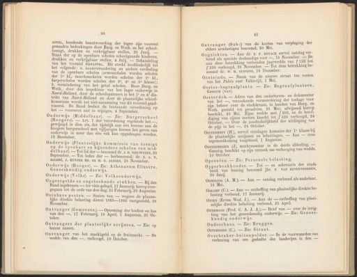 90 APPEL, houdende beantwoording der tegen zijn voorstel gemaakte bedenkingen door Burg. en Weth. en het school- toezigt, drukken en verkrijgbaar stellen, 20 Junij. — Staat der op de openbare scholen schoolgaande deren, drukken en verkrijgbaar stellen, 4 Julij. — Behandeling van het voorstel PIJNAPPEL. Dit strekt hoofdzakelijk tot het volgende: a. naamverandering en andere verdeeling van de openbare scholen (armenscholen worden scholen der le kl, usschenscholen worden scholen der 2e kl, burgerscholen worden scholen der 36°, 4e en 5e klasse); b. vermindering van het getal scholen. Door Burg. en Weth, door den inspekteur van het lager onderwijs in Noord-Holland, door de schoolopzieners in het 1e en 4é dis- trikt van Noord-Holland en door de plaatselijke school- kommissie wordt tot niet-aanneming van dit voorstel gead- viseerd. De Raad besluit de bestaande verordening op het — vooreerst nief te wijzigen, 4 September. Onderwijs (Middelbaar). — Zie: Burgerschool (Hoogere). — Art. 7 der verordening regelende het —, gewijzigd in dien zin, dat tijdelijk aan één leeraar aan de hoogere burgerschool met vijfjarigen kursus het geven van onderwijs in meer dan één vak kan opgedragen worden, 19 December. Onderwijs (Plaatselijke kommissie van toezigt op de openbare en bijzondere scholen van mid- delbaar).— Tot lid der — benoemd dr. 7. n. NIEUWVEEN, 20 September. — Tot leden der — herbenoemd: dr. 6. An N; ALLEBÉ, J. KUYPER HZ. en H. G. JANSEN, 28 November. Onderwijs (Hooger). — Zie: Athenaeum Illustre, Geneeskundig onderwijs. Onderwijs (Volks). — Zie: Volksonderwijs. Ongezegelde en ongeteekende stukken. — Bij den Raad ingekomen —: ter visie gelegd, 17 Januarij; hierop over- gegaan tot de orde van den dag, 21 Februarij, 29 Augustus. Oninbare posten. — Staten van — wegens de plaatse- lijke direkte belasting dienst 18651866 vastgesteld, 28 November. Ontvanger (Gemeente). — Opneming der boeken en kas van den —, 17 Februarij, 18 April, 1 Augustus, 25 Oc- tober. Ontvangers der plaatselijke acciijjnsen. — Zie: op hunne namen. 91 Ontvanger (Sub-) van de kosten van verpleging der elders armlastigen benoemd, 30 Mei. pe] Oudeschans. — Zie: Bruggen. OuTsHooRN (C.). — Zie: Straat. Overbraker-buitenpolder. — In de NO AIB) verhuring van een gedeelte der landerijen 1n Ontvanger van het marktgeld op de fruitmarkt. — De wedde van den —, verhoogd, 10 October. i ; d. ervol ontslag ver- ziekten. — Aan dr. E. F. HOYACK € vid iT als speciale Geb OI De aan deze betrekking verbonden Jaarwe ie #30 je 28 November. — Tot deze betrekking be noemd dr. W. M. GUNNING, 19 December. Oosteinde. — Naam van de nieuwe straat ten oosten van het Paleis voor Volksvlijt, 1 Mei. Ooster-begraafplaats. — Zie: Begraafplaatsen, GORCUM (VAN). - lokmeester k.— Adres van den onderhaven- en d EA —, verzoekende vermeerdering der toelage Io zijn beheer over de stadskraan, In ade se j preadvies, 25 ei; afwij Weth. gesteld tot preadvies, 25 Mei; a en) i Tei ïij 7 t f 200, en de be beschikt, 20 Mei. Zijne wedde me bg ioi ran Zi eersten knecht tot {420 verhoogd, en wel ij de noodzakelijkheid der uitdieping van jp i —, 24 tober. de pijp in het —, 24 Oe a Oostermour (H.), eervol ontslagen kommies der dE eg de plaatselijke accijnsen en belastingen. — Aan tegemoetkoming toegekend, 1 Augustus. re) 5 i derde afdeeling. — ERMENWJER (J), marktmeester in de ad ij es op zijn verzoek om verhooging van wedde, 10 October. a ie: j le belasting. Opcenten. — Zie: Persone in erboekhouder. — Tot — en sekretaris der EE Re van leening benoemd jhr. F. VAN BEVERVOORDEN, 20 Junij. Ormeune (A. M.). — Aan — ontslag verleend als makelaar, 16 Mei. ì Oskamp (C.). — Aan — ontheffing van plaatselijke direkte be- lasting verleend, 17 January. De Orren (Erven Wed. J.). — Aan de — ontheffing van plaat- selijke direkte belasting verleend, 25 April. at ù — Brief van — over de imrig- DEMANS (Prof. C. A. J. A.). ove DR DE het geneeskundig onderwijs. — Zie: Genees kundig onderwijs.