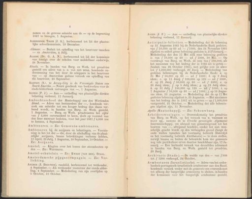 4 memen en de gewone subsidie aan de — op de begrooting 1867 te brengen, 1 Augustus. ALBERDINGK Tay (J. A.), herbenoemd tot lid der plaatse- lijke schoolkommissie, 19 December. Alkmaar. — Besluit tot opheffing van het beurtveer tusschen — en Amsterdam, 4 Julij. ALLEBÉ (Dr. G. A. N.), herbenoemd tot lid der kommissie van toezigt over de scholen voor middelbaar onderwijs, 28 November. Almelo. — In handen van Burg. en Weth. tot preadvies gesteld een adres van 0. 0. VAN DEN BERG, houdende on- dersteuning van het door de schippers in het beurtveer van — op Amsterdam gedane verzoek om opheffing van dit beurtveer, 20 September. Ambtenaren. — Zie: Gemeente-ambtenaren. Ambtenaren bij de accijnsen en belastingen. — Voorzie- ning in het lot der — die, door de afschaffing van de plaat- selijke aceijnsen, hunne betrekkingen verloren hebben, 18 April, 20 Julij, 1 Augustus, 20 September, 10 October. — Zie: Accijnsen. Amstel. — Klagten over het lossen der stoombooten op den —. Zie: WITTERING. ling, 4 September. — Mededeeling van zijn overlijden op 5 October, 10 October. ANTEN (J. F.). — Aan — onthefling van plaatselijke direkte belasting verleend, 17 Januarij. Anticipatie-bilietten. — Mededeeling dat de beleening op 31 Augustus 1865 bij de Nederlandsche Bank gesloten, van f 50,000 op 60 ad — { 1000, den 24 November 1865 afgelost en sedert geene beleening gesloten is, 21 Februari. — Mededeeling dat den 17 Mei zulk eene beleening gesloten is van { 50,000 op 60 — ad f 1000, 30 Mei. — Op voordragt van Burg. en Weth. de som van { 500,000, als het maximum van het bedrag der in 1866 uit te geven — (besluit van 26 October 1865), met gelijke som en alzoo tot f 1,000,000 verhoogd, 20 Junij. — Mededeeling van geslotan beleeningen bij de Nederlandsche Bank: a. op 21 Mei f 50,000 op 60 — ad f 1000; b. op 8 Junij idem; c. op 11 Junij { 100,000 op 120 — ad f 1000, d. op 21 Junij f 50,000 op 60 — ad f 1000; e. op 28 Junij idem; {. op 5 Jul idem; g. op 19 Julij idem; h. op 31 Juli f 100,000 op 120 — ad f 1000; i. op 7 Augustus f 50,000 op 60 — ad f 1000; j. op 10 Augus- tus idem, 29 Augustus. — Mededeeling dat de op 17 Mei gesloten beleening afgelost is, 29 Augustus. — Het maximum van het bedrag der in 1867 uit te geven — op f 1,000,000 vastgesteld, 25 October. — Mededeeling dat alle beleenin- gen afgelost zijn, 15 November. Archivaris (Stads-). — De wedde van den — van {800 tot f 1200 verhoogd, 24 October, Armbesturen (lsraelietische). — Adres van het neder- landsch-portugeesch-israelietisch armbestuur aan den Raad, houdende verzoek weder met de gemeente een overeenkomst tot afkoop der burgerlijke armenzorg te sluiten, in handen der kommissie voor het burgerlijk armbestuur gesteld, ALOFSsEN (S.), te Jersey-City in de Vereenigde Staten van Noord-Amerika. — Nieuw geschenk van boekwerken voor de stads-bibliotheek ontvangen van —, 1 Augustus. Amstel-schutsluis. — Zie: KwAsT (VAN DER), STAAL. Apollo (Maatschappij). — Zie: Schouwburg. ArTess (P. J.). — Aan — ontheffing van plaatselijke direkte belasting verleend, 17 Januarij. Amsterdamsche pijpgascompagnie. — Zie: Ver- lichting. Arbeiderswoningen. — Overeenkomstig het preadvies van Burg. en Weth. op het verzoek van M. VROESOM DE WAAN qq., namens de te Utrecht gevestigde Algemeene bouwmaatschappij, om afstand van gemeentegrond tot het bouwen van —, afwijzend beschikt, omdat het niet wen- schelijk geacht wordt op den verlangden grond (langs de oude wallen tusschen het voormalig bolwerk Sloterdijk en het voormalig bolwerk Karthuizers) — te doen stellen, terwijl binnen en buiten de bebouwde kom der gemeente nog vele partikuliere erven daartoe beschikbaar zijn, 17 Ja- nuarij. — Een herhaald verzoek van denzelfden adressant in handen van Burg. en Weth. gesteld tot preadvies, 20 Junij. Ambachtsschool der Maatschappij van den Werkenden Stand. — Adres van bestuurders der —,- houdende ver- zoek om subsidie tot een hooger bedrag dan thans ver- leend wordt, in handen van Burg. en Weth. gesteld, 1 Augustus. — Burg. en Weth. preadviseren het cijfer van f 3,000 onveranderd te laten, doch op voorstel van den heer BIENFAIT besloten, voor het jaar 1867 f 4,000 toe te kennen, 4 September. ANCHER (J. BrouWER), raadslid, herbenoemd tot wethouder, 4 September. — Als wethouder voorzitter der vierde afdee-