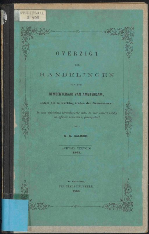 Stadsarchief Amsterdam, archieftoegang 31375, Archief van de Gemeente Amsterdam: Gemeenteblad, inventarisnummer 9, Indexen, Overzicht der handelingen van de gemeenteraad over de jaren 1851-1890, 1865