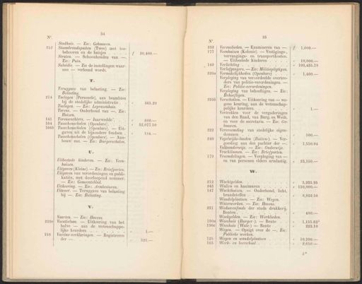 141 164 1660 34 Stadhuis. — Zie: Gebouwen. Stoombrandspuiten (Twee) met toe- behooren en de huisjes el Straten. — Schoonhouden van —. Zie: Puin. Subsidie. — Zie de instellingen waar- aan — verleend wordt. mw. Teruggave van belasting. — Zie: Belasting. U. Uitbestede kinderen. — Zie: Veen- huizen. WY, Vaarten. — Zie: Havens. 20,400.— 365.20 600.— 32,077.50 154% N°. 232 177 149 22040 2890 287 1904 190e 125 163-| 35 Varenslieden. — Examineren van —. ww. Wachtgelden. 1,000. — 10,000.— 103,485.78 1,400. — 500. 1,550,04 480.— 1,155.625 233.10 10,700.— 2,650.— Toelagen (Personele), aan beambten bij de stedelijke administratie. Uitgaven (Kleine). — Zie: Briefporten. Vacatieloon. — Uitkeering van het halve — aan de wetenschappe- lijke keurders Bes Veenhuizen (Kolonie). — Vestigings-, vervangings- en transportkosten. — Uitbestede kinderen Wallen en kaaimuren Ig Wachthuizen. — Onderhoud, lieht, brandstoffen . At Toelagen. — Zie: Leprozenhuis. Uitgaven van verordeningen en publi- katiën, met doorloopend nommer. -— Zie: Gemeenteblad. Vaceine-verklaringen. — Registreren der —. Verlichting ass Io | Wandelplaatsen. — Zie: Wegen. Torens. — Onderhoud van —. Zie: Huizen. Uitkeering. — Zie: Armbesturen. Verlofgangers. — Zie: Militiepligtigen. Waterwerken. — Zie: Havens. Torenwachters. — Jaarwedde’. Uitvoer. — Teruggave van belasting bij —. Zie: Belasting. Vermakelijkheden (Openbare) : Weduwenfonds der stads drukkerij. Renton a, —— JAE Lj Tusschenscholen (Openbare). WE Verpleging van veroordeelde overtre- ders van politie-verordeningen. — Zie: Politie-verordeningen. Weekgelden. — Zie: Werklieden. Tusschenscholen (Openbare). — Uit- gaven uit de bijzondere fondsen . Verpleging van behoeftigen. — Zie: Behoeftigen. Weeshuis (Burger-). — Rente Tusschenscholen (Openbare). — Aan- bouw enz. — Zie: Burgerscholen. Verschotten. — Uitkeering van — we- gens keuring, aan de wetenschap- pelijke keurders. a, Weeshuis (Wale-) — Rente Vertrekken voor de vergaderingen van den Raad, van Burg. en Weth. en voor de secretarie. — Zie: Ge- bouwen. Wegen. — Opzigt over de —, Zie: Publieke werken. Vervreemding van stedelijke eigen- dommen ee Wegen en wandelplaatsen Vogelwijks-landen (Buiten-). — Ver- goeding aan den pachter der —. Werk- en leerschool . Volksonderwijs. — Zie: Onderwijs. Vrachtloonen. — Zie: Briefporten. Vreemdelingen. — Verpleging van — en van personen elders armlastig.