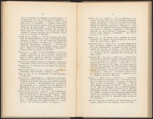 40 van K. M. SPIJKERMAN, verzoekende 0. a. verbetering der — in de Vijzelstraat, ter visie, 22 November. Zie: SPIJKERMAN. — Overeenkomstig het rapport van Burg. en Weth. op het adres van P. J. LANGEVELD €. s., zal hun worden geant- woord, dat de bezwaren worden erkend, die volgens adres- santen aan de tegenwoordige — in de Haarlemmerstraat en op den Haarlemmerdijk verbonden zijn, en Burg. en Weth. hopen en vertrouwen, op de begrooting 1867 de middelen te kunnen aanwijzen om de verlangde verbete- ring aan te brengen, 20 December. Beurtveer. — Adres van de beurtschippers van het veer tusschen Amsterdam en Texel, houdende verzoek geen vierden schipper van dat veer te benoemen, in handen van Burg. en Weth. gesteld tot afdoening, 5 September. — Tweede adres terzelfde zake, als voren, 8 November. Beus (J.F. DE), raadslid, toegelaten 16 Augustus; neemt zitting 5 September; behoort tot de tweede afdeeling, 5 September. 41 BiENFaIT (L. A) raadslid. — Lid der kommissie tot on- derzoek van het adres der Amsterdamsche Kanaalmaat- schappij, betreffende de plaats voor het centraal spoorweg- station, 28 Augustus. — Lid der kommissie van voorbe- reiding van financiële onderwerpen, 5 September. — Aan- gewezen om als raadslid de uit te geven anticipatie-biljetten voor gezien” te teekenen, 5 September. — Plaatsvervan- gend lid van den brandraad, 5 September. — Behoort tot de tweede afdeeling, 5 September. — Zie: Voor- stellen van leden. BienFaIT (L. A.), op verzoek eervol ontslagen als lid der kommissie van bestuur over de inrigting tot het exami- neren van varenslieden, 8 Maart. Bijten. — Adres van J. D. PRIOR JR. C. $,, ‚verzoekende, dat het maken en openhouden van — des winters, voort- aan van stadswege geschiede, in handen van Burg. en Weth. gesteld tot preadvies, 5 September. — Op dit adres afwijzend beschikt, 18 October. — Op voorstel des hn. DE VRIES, de kommissie voor de strafverordeningen uitgenoodigd de zaak zelve in beginsel tot een punt van overweging te maken, 18 October. — Adres van H. DOEFS VAN BOMMEL, verzoekende dat schikkingen mogen gemaakt worden met betrekking tot het openhouden der —, ter zijde gelegd, daar het op ongezegeld papier geschreven is, 2 November. BEuKER (J. B.) raadslid. — Lid der kommissie van onder- zoek der bezwaarschriften in zake de plaatselijke direkte belasting, 14 Junij. — Op zijn verzoek niet herbenoemd tot lid der kommissie van beheer over de stedelijke ren- tegevende eigendommen, 5 September. — Lid der kom- missie van voorbereiding van publieke werken, 5 Septem- ber. — Behoort tot de derde afdeeling, 5 September. — Neemt ontslag als raadslid, 22 November. BEVERSEN (N. J.), ontslagen als bouw-opzigter der gemeente, 20 December. BIESTERVELD (D.). — Adres van — en eenige ballast-schip- pers, verzoekende wijziging der ontwerp-verordening op het stads ballastkantoor, in handen van Burg. en Weth. gesteld tot preadvies, 11 Januarij. — Tweede adres van —, tot bet vermeerderen van het getal van drie aanvul- lers, behandeld bij de vaststelling der verordening, 18 April, 4 Mei. Bing (V.), benoemd tot leeraar in het handteekenen aan de hoogere burgerschool met vijfjarigen kursus, 20 Julij. BEvERVOORDEN (Wed. E. vaN). — Aan de — ontheffing van plaatselijke direkte belasting verleend, 14 Junij. BoLEveLp (Mr. J. C.), q.q. — Adres van —, direkteur der Amsterdamsche Pipe Compri betreffende het verlee- nen van koncessie aan C. SOETENS tot het leggen van een paarden-spoorbaan, 11 Januarij. — Adres van —, ver- zoekende koncessie tot het leggen van buizen onder de bestrating enz. gedurende den koncessietijd der verlichting van den publieken weg, in handen van Burg. en Weth. gesteld tot preadvies, 11 ee deze koncessie verleend, 18 October. — Adres van —, houdende bezwaren tegen de verhuring van stads grond aan G. BLOKHUIS WZ. en J. L. KROM, 18 October, 8 November. Brvyst JR. (Dr. H. P.), herbenoemd tot stads geneesheer, 20 December. Bewoning. — Ongeschikt ter — verklaard de onder-achter- kamers der huizen in buurt V n°. 1004 tot en met n°, 1009, 13 April; id. de kelder onder het perceel Z 604 in de Kerk- straat, 18 October. — De behandeling der voordragt tot het ongeschikt ter — verklaren van twee kelders in de Kerkstraat, Z 608 en 609 aangehouden, 22 November. — Zie: WILKING, LAGUNA, DE JONG, LUIDENGA. Bibliotheek (Stads). — Aan de — 508 boekdeelen ten geschenke gegeven door den hr. S. ALOFSEN, van Amster- dam, te Jersey-City in Noord-Amerika, 8 Maart. — Den hr. ALOFSEN eene fotografische afbeelding van het gebouw der —, als blijk van erkentelijkheid, toegezonden, 25 Oc- tober. — Boekwerken door generaal-majoor W. J. KNOOP aan de — ten geschenke gezonden, 16 Augustus.