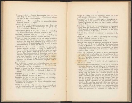 42 Binnenlandsche Zaken (Departement van). — Brief van Burg. en Weth. door het — onbeantwoord gelaten, 19 Julij. — Zie: Spoorwegen. Braauw (Q.). — Aan — ontheffing van plaatselijke direkte belasting verleend, 13 April. BraRKOM (J. P. vAn), aangewezen om nog van 1 Maart tot 4 April te fungeren als sub-ontvanger der plaatselijke direkte belasting, 9 Februarij. BLEIJENBURGH (Erven A. M. vAn). — Aan de — ontheffing van plaatselijke direkte belasting verleend, 4 Mei. BLocQuEry (Mevrouw VAN DE). — Aan — ontheffing van plaatselijke direkte belasting verleend, 14 Junij. Bloed. — Aan J. C. MANN c. s., op hun adres betreffende het beletten van den invoer van ossen— alhier, te ant- woorden, dat deze zaak geregeld is bij eene provinciale verordening, en de gemeenteraad niet bevoegd is hierin eene beschikking te nemen, 18 October. BLokuus Wz. (G.). — Aan — ontheffing van plaatselijke direkte belasting verleend, 13 April. — Adres van'— en J. L. KROM, verzoekende afstand in huur van stads grond op de schans tegenover de fabriek der Amster- damsche Pijp-Gas-Compagnie; de kommissie voor de ren- tegevende eigendommen adviseert gunstig hierop; adressen tegen deze verhuring, van A. VAN DER VIJGH, C. VERWEY en mr. J. C. BIJLEVELD q.q.; de behandeling dezer zaak uitgesteld, 18 October; op het verzoek afwijzend beschikt, 8 November. Boas en JUDELS. — Adres van — betreffende de voorwaar- den van gunning tot het bespelen van den schouwburg, 22 November. — Zie: Schouwburg. Boete. — Adres van A. M. TOEPOEL, verzoekende uitkeering van eene hem ingehouden —, 14 Junij, 20 Julij. — Zie: TOEPOEL. BoissEvAIN (E. C.). — Aan — ontheffing van plaatselijke direkte belasting verleend, 13 April. BorssEvAm (G. J.). — Aan — ontheffing van plaatselijke direkte belasting verleend, 13 April. BorssevAIn (J.), herbenoemd tot lid der plaatselijke school- kommissie, 6 December. BOKERN en C°. (von). — Op het adres van —, verzoekende op de Reguliersbreestraat verhoogde voetpaden te doen maken, voorloopig afwijzend beschikt, 8 Maart. 43 BomMEL (H. DOEFs van). — Ongezegeld adres van — ter zijde gelegd, 2 November. — Zie: Bijten. BooM (A.). Adres van —, verzoekende eervol ontslag als stads heel- en verloskundige, in handen van Burg. en Weth. gesteld tot preadvies, 6 December. — Dit eervol ontslag verleend, 20 December. Boom Jr. (G.), benoemd tot makelaar in mobilair, 11 Ja- nuarij. Borski (M. S. A.). — Aan — ontheffing van plaatselijke direkte belasting verleend, 138 April. Bos (G.), nachtwacht, gepensioneerd, 4 Mei. Bosse (A. VAN), raadslid, herkozen; toegelaten 16 Augustus; zal behooren tot de vierde afdeeling, 5 September; neemt zitting, 2 November. — Benoemd tot lid der kommissie belast met het ontwerpen eener reorganisatie van het ge- neeskundig onderwijs alhier, 20 December. — Zie: Voor- stellen van leden. Botermarkt. — Over de amotie van het waaggebouw op de —, 25 October. - Bouwmaatschappij (Nederlandsche). — De aan dr. Ss. SARPHATI verleende koncessie tot het bebouwen en verfraaijen van den omtrek van het Paleis voor Volksvlijt, overgedragen aan de —, 16 Februarij. — Op het adres der —, verzoe- kende goedkeuring van het bouwplan van vak T in den omtrek van het Paleis voor Volksvlijt, besloten te ant- woorden: dat in haar verzoek, zoo als het daar is lig- gende, vooralsnog (dit woord er in gelascht op voorstel des hn. GÜLCHER) niet kan worden getreden, maar dat zoo dra mogelijk de voorbereidende maatregelen zullen genomen worden, tot afstand van den openbaren gemeente- grond en het openbaar gemeentewater, ten zuiden van het Amstelgrachtje, tegenover den tuin Flora, 23 Augus- tus. — Adres van T. M. LOOMAN c. s., houdende bezwaren tegen bedoelden afstand, in handen van Burg. en Weth. gesteld tot preadvies, 28 Augustus. — Adres der —, BooGAARD (P. VAN DEN). — Adres van —, verzoekende ver- gunning om in een perceel in de Raamstraat koeijen te houden, in handen van Burg. en Weth. gesteld tot afdoe- ning, 22 Mei. Boter. — Voordragt van Burg. en Weth. geleidende een ontwerp-besluit tot afschaffing van den accijns op de —, in handen der financiële kommissie gesteld, 22 Novem- ber. — Plaatselijke belasting op de —, met 1 Mei 1866 afgeschaft, 20 December.