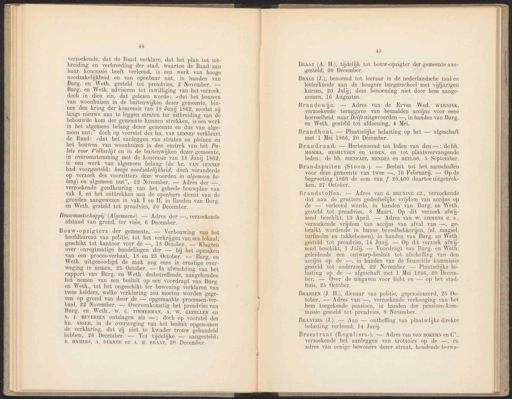 44 verzoekende, dat de Raad verklare, dat het plan tot uit- breiding en verbreeding der stad, waartoe de Raad aan haar koncessie heeft verleend, is een werk van hooge noodzakelijkheid en van openbaar nut, in handen van Burg. en Weth. gesteld tot preadvies, 2 November. — Burg. en Weth. adviseren tot inwilliging van het verzoek, doch in dien zin, dat gelezen worde: >dat het bouwen van woonhuizen in de buitenwijken dezer gemeente, bin- nen den kring der koncessie van 18 Junij 1862, zoodat zij langs nieuwe aan te leggen straten ter uitbreiding van de bebouwde kom der gemeente kunnen strekken, is een werk in het algemeen belang dezer gemeente en dus van alge- meen nut;” doch op voorstel des hn. VAN LENNEP verklaart de Raad: „dat het aanleggen van straten en pleinen en bet bouwen van woonhuizen in den omtrek van het Pa- leis voor Volksvlijt cn in de buitenwijken dezer gemeente, in overeenstemming met de koncessie van 18 Junij 1862, is een werk van algemeen belang (de hr. VAN ‘LENNEP had voorgesteld: hooge noodzakelijkheid, doch veranderde op verzoek des voorzitters deze woorden in algemeen be- lang) en algemeen nut”, 22 November. — Adres der —, verzoekende goedkeuring van het geheele bouwplan van vak I, en het onttrekken aan de openbare dienst van de gronden aangewezen in vak I en TÍ, in Handen van Burg. en Weth. gesteld tot preadvies, 20 December. Bouwmaatschappij (Algemeene). — Adres der —, verzoekende afstand van grond, ter visie, 6 December. Bouw-opzigters der gemeente. — Verbouwing van het hoofdbureau van politie, tot het verkrijgen van een lokaal, geschikt tot kantoor voor de —, 18 October. — Klagten over onregtmatige handelingen der — bij het opmaken van een proces-verbaal, 18 en 25 October. — Burg. en Weth. uitgenoodigd de zaak nog eens in ernstige over- weging te nemen, 25 October. — In afwachting van het rapport van Burg. en Weth. desbetreffende, aangehouden het nemen van een besluit op een voordragt van Burg. en Weth, tot het ongeschikt ter bewoning verklaren van twee kelders, welke verklaring zou moeten worden gege- ven op grond van door de — opgemaakte processen-ver- baal, 22 November. — Overeenkomstig het preadvies van Burg. en Weth., W. C. TIMMERMAN, A. W. GEZELLEN en N. J. BEVERSEN ontslagen als —; doch op voorstel des hn. ASSER, in de overweging van het besluit opgenomen de verklaring, dat zij niet te kwader trouw gehandeld hebben, 20 December. — Tot tijdelijke — aangesteld: B. HAMERS, A. DEKKER en A. H. BRAAT, 20. December. 45 BRAAT DN H.), tijdelijk tot bouw-opzigter der gemeente aan- gesteld, 20 December. BraLs (J.), benoemd tot leeraar in de nederlandsche taal en letterkunde aan de hoogere burgerschool met vijfjarigen kursus, 20 Julij; deze benoeming niet door hem aange- nomen, 16 Augustus. Brandewijn. — Adres van de Erven Wed. WARNINK, verzoekende teruggave van betaalden accijns voor eene hoeveelheid naar Delft uitgevoerden —, in handen van Burg. en Weth. gesteld tot afdoening, 4 Mei. Brandhout. — Plaatselijke belasting op het — afgeschaft met 1 Mei 1866, 20 December. Brandraad. — Herbenoemd tot leden van den —: de hh. MOMMA, HESHUYSEN en LUDEN, en tot plaatsvervangende leden: de hh. BIENFAIT, MENDES en BEELO0, 5 Sepiember. Brandspuiten (Stoom-). — Besluit tot het aanschaffen voor deze gemeente van twee —, 16 Februarij. — Op de begrooting 1866 de som van f 20,400 daartoe uitgetrok- ken, 27 October. Brandstoffen. — Adres van G. BRUNING GZ., verzoekende dat aan de grutters gedeeltelijke vrijdom van accijns op de — verleend worde, in handen van Burg. en Weth. gesteld tot preadvies, 8 Maart. Op dit verzoek afwij- zend beschikt, 18 April. — Adres van W. SIEMONS C. S., verzoekende vrijdom van accijns van afval van —, ge- bruikt wordende in hunne broodbakkerijen, (nl. zaagsel, turfmolm en takkebossen), in banden van Burg. en Weth. gesteld tot preadvies, 14 Junij. — Op dit verzoek afwij- zend beschikt, 7 Julij. — Voordragt van Burg. en Weth. geleidende een ontwerp-besluit tot afschaffing van den aceijns op de —, in handen van de financiële kommissie gesteld tot onderzoek, 22 November. Plaatselijke be- lasting op de — afgeschaft met 1 Mei 1866, 20 Decem- ber. — Over de uitgaven voor licht en — op het stad- huis, 25 October. BRANSEN (J. H.), dienaar van politie, gepensioneerd, 25 Oe- tober. — Adres van —, verzoekende verhooging van het hem toegekende pensioen, in handen der pensioen-kom- missie gesteld tot preadvies, 8 November. Brantjes (J.). — Aan — ontheffing van plaatselijke direkte belasting verleend, 14 Junij. Breestraat (Reguliers-). — Adres van VON BOKERN en (°., verzoekende het aanleggen van trottoirs op de —, en adres van eenige bewoners dezer straat, houdende bezwa-