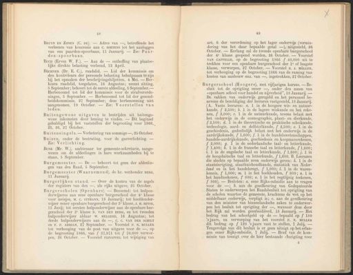 48 Bruyn EN ZONEN (C. DE). — Adres van —, betreffende het verleenen van koncessie aan C. SOETENS tot het aanleggen van een paarden-spoorbaan, 11 Januari. — Zie: Paar- den-spoorbaan. Bucn (Erven W. F.). — Aan de — ontheffing van plaatse- lijke direkte belasting verleend, 13 April. Buitengewone uitgaven te bestrijden uit buitenge- wone inkomsten door leening te vinden. — Dit beginsel gehuldigd bij het vaststellen der begrooting voor 1866,, 25, 26, 27 October. Buitensingels. — Verbetering van sommige —, 25 October. Buizen, onder de bestrating, voor de gasverlichting. — Zie: Verlichting. Burgemeester. — De — behoort tot geen der afdeelin- gen van den Raad, 5 September. 49 art. 6 der verordening op het lager onderwijs (vermin- dering van het daar bepaalde getal —), uitgesteld, 26 October. — Eerlang zal de tweede openbare burgerschool der 40° klasse geopend worden, 26 October. — Voorstel VAN CAPPELLE, op de begrooting 1866 {f 40,000 uit te trekken voor een openbare burgerschool der 1° of laagste klasse, verworpen, 27 October. — Voorstel B. J. MÜLLER, tot verhooging op de begrooting 1866 van de raming van kosten van aanbouw enz. van —, ingetrokken, 27 October. Burgerschool (Hoogere), met vijfjarigen kursus. — Be- sluit tot de oprigting eener —, onder den naam van „openbare school voor handel en nijverheid”, 18 Januarij — De vakken van onderwijs geregeld en het personeel be- nevens de bezoldiging der leeraren vastgesteld, 18 Januarij. (A. Vaste leeraren: a. 1 in de hoogere wis- en natuur- kunde, f 2,500; b. 1 in de lagere wiskunde en het reke- nen, f 2,000; c. 1 in de natuurkunde, tevens belast met het onderwijs in de cosmographie, plant- en dierkunde, {2,500; d. 1 in de theoretische en praktische scheikunde, technologie, aard- en delfstofkunde, f 2,500; e. 1 in de geschiedenis, gedeeltelijk belast met het onderwijs in de aardrijkskunde, f 1,600; f. 1 in de handelswetenschappen, handels-aardrijkskunde, geschiedenis en koopmansrekenen, { 2,000; g. 1 in de nederlandsche taal- en letterkunde, f 1,400; h. 1 in de fransche taal en letterkunde, {f 1,600; t. 1 in de engelsche taal en letterkunde, f 1,600; ;. 1 in de hoogduitsche taal en letterkunde, f 1,600. B. Leeraren die slechts op bepaalde uren onderwijs geven: &. 1 in de staatsinrigting, staathuishoudkunde, statistiek van Neder- land en in het handelsregt, f 1,000; Z. 1 in de waren- kennis, f 1,000; m. 1 in het boekhouden, f 800; n. 1 in het handteekenen, f 800; 0. 1 in het regtlijnig teekenen, [ 800). — Besloten: a. eene Rijks-subsidie aan te vragen voor de —; b. aan de goedkeuring van Gedeputeerde Staten te onderwerpen het Raadsbesluit tot oprigting van de scholen waartoe de gemeente, krachtens de wet op het middelbaar onderwijs, verpligt is; €. aan de gcedkeuring van den minister van binnenlandsche zaken te onderwer- pen het besluit tot oprigting der —, wanneer deze door het Rijk zal worden gesubsidiëerd, 18 Januarij. — Het bedrag van het schoolgeld op de — bepaald op f 180 ’sjaars, na verwerping van het voorstel P. N. MULLER dit bedrag op { 120 'sjaars vast te stellen, 7 Julij. — Tengevolge van dit besluit is er geen uitzigt op het erlan- gen eener Riijks-subsidie, 7 Julij. — Brief van de kom- missie van toezigt over de hier bestaande sInrigting voor 4 BüCHNER (Dr. E. C.), raadslid. — Lid der kommissie om den kontrôleurs der personele belasting behulpzaam te zijn bij het opmaken der beschrijvingsbiljetten, 4 Mei. — Her- kozen raadslid, toegelaten, 16 Augustus; neemt zitting, 5 September ; behoort tot de eerste afdeeling, 5 September. — Herbenoemd tot lid der kommissie voor de strafverorde- ningen, 5 September. — Herbenoemd tot lid der gezond- heidskommissie, 27 September; deze herbenoeming niet aangenomen, 19 October. — Zie: Voorstellen van leden. Bunk (Mr. W.), ambtenaar ter gemeente-sekretarie, aange- wezen om de afdeelingen in hare werkzaamheden bij te staan, 5 September. Burgemeester (Waarnemend), de hr. wethouder BERG, 11 Januarij. Burgerlijken stand. — Over de kosten van de zegels der registers van den —, als rijks uitgave, 25 October. Burgerscholen (Openbare). — Benoemd: tot hulpon- derwijzeres aan eene openbare burgerschool der 4° klasse voor meisjes, M. C, ITTMANN, 18 Januarij; tot hoofdonder- wijzer eener openbare burgerschool der 2° klasse, J. H. HINSE, 15 Junij; tot eersten hulponderwijzer aan de openbare bur- gerschool der 2° klasse D. VAN DEN BERG, en tot tweeden hulponderwijzer aldaar W. MELGERD, 16 Augustus; tot derde hulponderwijzers aan de —, C. C. VAN DER SCHILT en F. P. ADRIAN, 27 September. — Voorstel P. N. MULLER tot verhooging van de post van uitgave voor de —, op de begrooting 1866, van f 37,971 tot f 70,000 verwor- pen, 26 October. — Voorstel PIJNAPPEL tot wijziging van