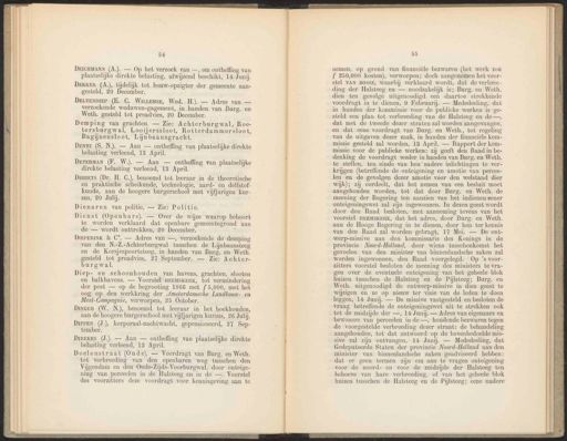54 DEICHMANN (A.). — Op het verzoek van —, om ontheffing van plaatselijke direkte belasting, afwijzend beschikt, 14 Junij. DEKKER (A.), tijdelijk tot bouw-opzigter der gemeente aan- gesteld, 20 December. DELvEnDIEP (E. C. WiLLEmse, Wed. H.). — Adres van — verzoekende weduwen-gagement, in handen van Burg. en Weth. gesteld tot preadvies, 20 December. Demping van grachten. — Zie: Achterburgwal, Roe- tersburgwal, Looijerssloot, Rotterdammersloot, Bagiijnensloot, Lijnbaansgracht. Detz (S. N.). — Aan — ontheffing van plaatselijke direkte belasting verleend, 18 April. DETERMAN (F. W.). — Aan — ontheffing van plaatselijke direkte belasting verleend, 18 April. DiBBers (Dr. H. C.), benoemd tot leeraar in de theoretische en praktische scheikunde, technologie, aard- en delfstof- kunde, aan de hoogere burgerschool met vijfjarigen kur- sus, 20 Juli. Dienaren van politie. — Zie: Politie. nemen, op grond van financiële bezwaren (het werk zou f 250,000 kosten), verworpen; doch aangenomen het voor- stel VAN BOSSE, waarbij verklaard wordt, dat de verbree- ding der Halsteeg en — noodzakelijk is; Burg. en Weth. dien ten gevolge uitgenoodigd een daartoe strekkende voordragt in te dienen, 9 Februarij. — Mededeeling, dat in handen der kommissie voor de publieke werken is ge- steld een plan tot verbreeding van de Halsteeg en de —, dat met de tweede dezer straten zal worden aangevangen, en dat eene voordragt van Burg. en Weth, tot regeling van de uitgaven dezer zaak, in handen der financiële kom- missie gesteld zal worden, 18 April. — Rapport der kom- missie voor de publieke werken: zij geeft den Raad in be- denkíng de voordragt weder in handen van Burg. en Weth. te stellen, ten einde van hen’ nadere inlichtingen te ver- krijgen (betreffende de onteigening en amotie van percee- len en de gevolgen dezer amotie voor den welstand dier wijk); zij oordeelt, dat het nemen van een besluit moet aangehouden worden, tot dat door Burg. en Weth. de meening der Regering ten aanzien van het indienen eener onteigeningswet zal zijn ingewonnen. In dezen geest wordt door den Raad besloten, met aanneming tevens van het voorstel HEEMSKERK, dat het adres, door Burg. en Weth. aan de Hooge Regering in te dienen, door hen ter kennis van den Raad zal worden gebragt, 17 Mei. — De ont- werp-missive aan den kommissaris des Konings in de provincie Noord-Holland, door wiens tusschenkomst het gevoelen van den minister van binnenlandsche zaken zal worden ingewonnen, den Raad voorgelegd. Op '’s voor- zitters voorstel besloten de meening des ministers te vra- gen over de eventuele onteigening van het geheele blok huizen tusschen de Halsteeg en de Pijlsteeg; Burg. en Weth. uitgenoodigd de ontwerp-missive in dien geest te wijzigen en ze op nieuw ter visie van de leden te doen leggen, 14 Junij. — De missive vastgesteld en besloten de vraag betreffende de onteigeningswet uit te strekken ook tot de zuidzijde der —, 14 Junij. — Adres van eigenaars en bewoners van perceelen in de —, houdende bezwaren tegen de voorgestelde verbreeding dezer straat: de behandeling aangehouden, tot dat antwoord op de bovenbedoelde mis- sive zal zijn ontvangen, 14 Junij. — Mededeeling, dat Gedeputeerde Staten der provincie Noord-Holland aan den minister van binnenlandsche zaken geadviseerd hebben: dat er geen termen zijn om aan te vragen onteigening voor de noord- en voor de zuidzijde der Halsteeg ten behoeve van hare verbreeding, of van het geheele blok huizen tusschen de Halsteeg en de Pijlsteeg; eene nadere Dienst (Openbare). — Over de wijze waarop behoort te worden verklaard dat openbare gemeentegrond aan de — wordt onttrokken, 20 December. DiEPERINK & C°. — Adres van —, verzoekende de demping van den N.-Z.-Achterburgwal tusschen de Lijnbaansteeg en de Korsjespoortsteeg, in handen van Burg. en Weth. gesteld tot preadvies, 27 September. — Zie: Achter- burgwal. Diep- en schoonhouden van havens, grachten, slooten en balkhavens. — Voorstel HEEMSKERK, tot vermindering der post — op de begrooting 1866 met f 5,000, met het oog op den werkkring der Amsterdamsche Landbouw- en Mest-Compagnie, verworpen, 25 October. DinGer (W. N), benoemd tot leeraar in het boekhouden, aan de hoogere burgerschool met vijfjarigen kursus, 26 Julij. DiPPen (J.), korporaal-nachtwacht, gepensioneerd, 27 Sep- tember. Direkes (J.). — Aan — ontheffing van plaatselijke direkte belasting verleend, 13 April. Doelenstraat (Oude). — Voordragt van Burg. en Weth. tot verbreeding van den openbaren weg tusschen den Vijgendam en den Oude-Zijds-Voorburgwal, door onteige- ning van perceelen in de Halsteeg en in de —. Voorstel des voorzitters deze voordragt voor kennisgeving aan te