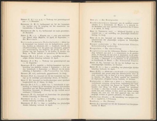70 HEKMAN (C. A.), c.s, q.q. — Verkoop van gemeentegrond aan —, 6 December. HenDricas (A. M. J.), herbenoemd tot lid der kommissie van bestuur over de inrigting tot het examineren van varenslieden, 6 December. MERCKENRATH (Dr. L. J.), herbenoemd tot stads geneesheer, 20 December. HereT (J. M.), c.s. — Klagten van — over eene mestvaalt van Natura Artis Magistra, 13 April, 27 September. — Zie: Mestvaalt. Hervormde gemeente (Nederduitsche). — Adres van de kommissie van bestuur over de kerkgebouwen, goede- ren, fondsen en inkomsten der —, houdende verzoek om schadeloosstelling voor het gemis aan inkomsten, gepaard aan vermeerdering van uitgaven, als gevolg van het op- houden van het begraven in de kerken, in handen van Burg. en Weth. gesteld tot preadvies, 20 December. HERZEELE (Mr. J. J. P. van). — Aan — ontheffing van plaat- selijke direkte belasting verleend, 13 April. Hesen (P. J. W.). — Verkoop van gemeentegrond aan —, 16 Augustus. HesauyvseN (W. F.), raadslid. — Lid der kommissie van voor- bereiding van publieke werken, 5 September. — Lid van den brandraad, 5 September. — Behoort tot de eerste afdeeling, 5 September. — Zie: Voorstellen van leden. HeuspEN (M. VAN), nachtwacht, gepensioneerd, 14 Junij. Heyssius (Prof. A.), benoemd tot lid der kommissie van toe- zigt op de stedelijke geneeskundige dienst, 25 October. Uisse (J. H.), benoemd tot hoofdonderwijzer eener openbare burgerschool der 2 klasse, 15 Junij. Hrrscm6 (Dr. C.J. J.). — Adres van —, verzoekende in aan- merking te komen bij de benoeming van een uitwonenden geneesheer aan het Buiten-gasthuis, 11 Januarij; tot deze betrekking benoemd, 18 Januarij; op zijn verzoek eervol ontslagen, 9 Februarij. HoLTzMANN (P. H.). — Aan — ontheffing van plaatselijke direkte belasting verleend, 13 April. 71 Host (J.). — Zie: Houtgracht. Hoofdonderwijzers benoemd: aan de openbare armen- scholen, F. J. HAVERKANP, 31 Maart; F. G. MELLINK PZ, 20 December; aan eene openbare burgerschool der 2e klasse, J. H. HINSE, 15 Junij. Hoog (A. VERSCHUUR, wed.) — Afwijzend beschikt op het verzoek van — om ontheffing van plaatselijke direkte be- lasting, 14 Junij. HooG (. A. DE), benoemd tot derden’ verifikateur bij de administratie der plaatselijke accijnsen en belastingen, 25 Januarij. Hoogesluis. — Zie: Amstelbrug. Hoogleeraren aan het Athenaeum Illustre. — Eervol ont- slag verleend aan prof. J. A. ENGELBREGT, in de geschie- denis, 18 Januari; en aan prof. H. BEIJERMAN, in de neder- landsche taal, letterkunde en geschiedenis des vaderlands, 15 Junij. — Benoemd: T.T. H. JORISSEN, in de geschiedenis en letterkunde, 31 Maart. — Zie: Athenaeum Illustre. Hoorn (G. H.), benoemd tot lid van het kollegie van we- tenschappelijke keurders, 19 October. Horre (H. J.). — Aan — ontheffing van plaatselijke direkte belasting verleend, 138 April. Horst (H. H.). — Adres van — en de wed. L. 6. C. STAPELVELD, verzoekende dat grond nabij den Steenen-molen door de stad eventueel hun in huur of in koop afgestaan worde, in handen van Burg. en Weth. gesteld tot preadvies, 27 September; afwijzend hierop beschikt, 18 October. Houtgracht. EF Adres van J. HONT €. s., bewoners der —, verzoekende reiniging, of nog liever, wegruiming der visch- markt, en opruiming van karren en wagens aldaar, in banden van Burg. en Weth. gesteld tot preadvies, 14 Junij. — Aan hun verzoek tot wegruiming der visch- markt kan niet voldaan worden, doch aan hunne overige klagten zal, voor zoo veel deze gegrond zijn, zoo veel mogelijk worden te gemoet gekomen, 16 Augustus. Hoyack (L.), benoemd tot lid der kommissie voor den graan- handel, 31 Maart. Hormann (W. G.), benoemd tot kontròleur der plaatselijke direkte belasting, 16 February. Hooger onderwijs. — Zie: Athenaeum Illustre, Geneeskundig onderwijs. Houthavens (Stads). — De betrekking van opzigter over de — opgeheven, 9 Februarij. HorrzMAnN (J. J.). — Aan — ontheffing van plaatselijke direkte belasting verleend, 13 April. Houtloots. — Zie: PouwEts.