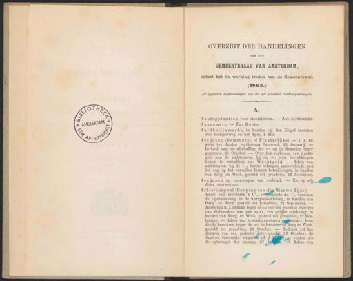 Stadsarchief Amsterdam, archieftoegang 31375, Archief van de Gemeente Amsterdam: Gemeenteblad, inventarisnummer 9, Indexen, Overzicht der handelingen van de gemeenteraad over de jaren 1851-1890, 1865