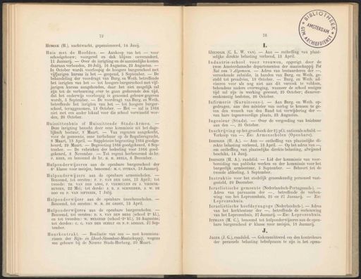 12 Huseex (H.), nachtwacht, gepensioneerd, 14 Junij. Huis met de Hoofden. — Aankoop van het — voor schoolgebouw; voorgevel en dak blijven onveranderd, 11 Januari. — Over de inrigting en de aanzienlijke kosten daaraan verbonden, 20 Julij, 16 Augustus, 23 Augustus. — In October wordt voorloopig de hoogere burgerschool met vijfjarigen kursus in het — geopend, 5 September. — De behandeling der voordragt van Burg. en Weth. betreffende het inrigten van het — tot hoogere burgerschool met vijf- jarigen kursus aangehouden, daar het niet mogelijk zal zijn tot de verbouwing over te gaan gedurende den tijd, dat het onderwijs voorloopig in genoemd gebouw gegeven wordt, 5 September. — De voordragt van Burg. en Weth. betreffende het inrigten van het — tot hoogere burger- school, teruggenomen, 18 October. — Het — zal in 1866 niet met een ander lokaal voor die school verwisseld wor- den, 26 October. Huiszittenhuis of Huiszittende Stads-Armen. — Deze inrigting bezocht door eene kommissie uit het dage- lijksch bestuur, 8 Maart. — Van regenten aangekocht, voor de gemeente, eene turfschuur op de Reguliersgracht, 8 Maart, 13 April. — Suppletoire begrooting 1864 goedge- keurd, 29 Maart. — Begrooting 1866 goedgekeurd, 6 Sep- tember. — De rubrieken der bedeeling voor 1866 goed- gekeurd, 8 November. — Tot regent herbenoemd de hr. Pp. KEER, en benoemd de hr. H. H. BEELS, 6 December. Hulponderwijzeres aan de openbare burgerschool der 4e klasse voor meisjes, benoemd: M. C. ITTMAN, 18 Januarij. IUulponderwiijzers aan de openbare armenscholen. — Benoemd, tot eersten: F. P. VAN DER L00S, 13 April; tot tweede: TH. VAN DER LOOS, P. VERMEULEN en J. YSERINK- HUYSEN, 22 Mei; tot derde: J. B. J. SCHNEIDER, J. W. DE ROO en P. VAN NIFTERIK, 7 Julij. Hulponderwiijjzer aan de openbare tusschenscholen. — Benoemd, tot eersten: W. H. DE GROOT, 138 April. Hulponderwijzers aan de openbare burgerscholen. — Benoemd, tot eersten: D. S. VAN DEN BERG (school 2 kl.), en tot tweeden: w. MELGERD (school -2e kl.), 16 Augustas; tot derden: C. C. VAN DER SCHILT en F. P. ADRIAN, 27 Sep- tember. Huurkontrakt. — Resiliatie van een — met kommissa- rissen der Rjn- en IJssel-Stoomboot-Maatschappij, wegens een gebouw bij de Nieuwe Stads-Herberg, 29 Maart. 18 L IJzenDiJK (C. L. W. van). — Aan — ontheffing van plaat- selijke direkte belasting verleend, 13 April. Industrie-school voor vrouwen, opgerigt door de twee Amsterdamsche departementen der maatschappij 70ot Nut van ’t Algemeen. — Adres van bestuurderen der —, verzoekende subsidie, in handen van Burg. en Weth. ge- steld tot preadvies, 18 October. — Burg. en Weth. ad- viseren voor als nog niet aan dit verzoek te voldoen, behoudens nadere overweging, wanneer de school eenigen tijd zal zijn in werking geweest, 25 October; dienover- eenkomstig besloten, 26 October. Infirmerie (Garnizoens-). — Aan Burg. en Weth. op- gedragen, aan den minister van oorlog te kennen te ge- ven den wensch van den Raad tot verwijdering der — van hare tegenwoordige plaats, 23 Augustus. Insinger (IT. A,). — Aan — ontheffing van plaatselijke di- rekte belasting verleend, 13 April. — Op het adres van —, om ontheffing van plaatselijke direkte belasting, afwijzend beschikt, 14 Junij. INsinGEr (H. A.), raadslid. — Lid der kommissie van voor- bereiding van publieke werken en der kommissie voor het burgerlijk armbestuur, 5 September. — Behoort tot de tweede afdeeling, 5 September. Instruktie voor het stedelijk geneeskundig personeel vast- gesteld, 20 December. Israelietische gemeente (Nederlandsch-Portugeesch-). — Adres van parnassim der —, betreffende de verbou- wing van het Leprozenhuis, 25 en 27 Januarij. — Zie: Leprozenhuis. J. Jäger (J. G.), raadslid, — Gekommitteerd om den kontròleurs der personele belasting behulpzaam te zijn in het opma- Ingenieur (Stads). — Over de vergoeding van huishuur aan den —, 25 October. Israelietische hoofdsynagoge (Nederlandsch-). — Adres van het kerkbestuur der —, betreffende de verbouwing van het Leprozenhuis, 27 Januarij. — Zie: Leprozenhuis. Inschrijving op het grootboek der 24 pCt. nationale schuld. — Verkoop van —. Zie: Armenscholen (Openbare). IrrMANN (M. C.), benoemd tot hulponderwijzeres aan de open- bare burgerschool 4® klasse voor meisjes, 18 Januarij.