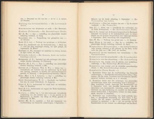 76 tus. — Benoemd tot lid van het — de hr. G. H. HOORN, 19 October. Keuring van levensmiddelen. — Zie: Levensmid- delen. Keurmeester van drinkwater en melk. — Zie: BRONCHEL. KLAASSEBOS (A.). — Verpachting van grasgewas aan —, 18 October. KLEEF (G. G. VAN). — Verkoop van grond aan —, 18 October. KLijN (G.), sluisknecht aan de Oosterdok-sluis. — Brief van — over het hem aangezegd ontslag, ter zijde gelegd, als ongezegeld, 29 Maart. KiijNvELD (C. H.), benoemd tot makelaar in erwten, boonen en fijne zaden, 20 Julij. Klinische school. — Zie: Genees-, heel- en verlos- kundige school. KLINKHAMER (J. P.), benoemd tot sub-ontvanger der plaat- selijke direkte belasting, 16 Februarij. Kiuyver (A. J. TniBaAuLrT, Wed. A. W‚). — Adres van —, verzoekende, als weduwe van een ambtenaar bij de bank van leening, pensioen, in handen der pensioen-kommissie gesteld, 11 Januarij. — Afwijzend hierop beschikt, 8 Maart. KoL (Mevr. J. E. J. LuEssEN). — Aan — ontheffing van plaatselijke direkte belasting verleend, 4 Mei. Knoop (Generaal-majoor W. J.). — Geschenk van boekwer- ken aan de stads bibliotheek, 16 Augustus. Knoop (J. H. C.), herbenoemd tot stads heel- en verloskun- dige, 20 December. Kocn (E.J. L.), herbenoemd tot regent der Beide Gasthuizen, 20 December. Koeijen. — Adres van P. VAN DER BOOGAARD, verzoekende vergunning tot het houden van — in een perceel in de Raamstraat, in handen van Burg. en Weth. gesteld tot afdoening, 22 Mei. Behoort tot de derde afdeeling, 5 September. — Zie: Voorstellen van leden. Koffijhuis. — Over het inrigten van een — op de nieuwe veemarkt. — Zie: Veemarkt. Kox (A.S.), leeraar aan de hoogere burgerschool te Roermond, benoemd tot leeraar in de nederlandsche taal- en letter- kunde aan de hoogere burgerschool met vijfjarigen kursus, 5 September. (Deze benoeming niet aangenomen). Kox (W. H.). — Verkoop van grond aan —, 11 Januarij. Kork (Erven A. VAN DER). — Aan de — ontheffing van plaatselijke direkte belasting verleend, 13 April. Kommandant (Plaatselijke). — Aan kolonel DE MOULIN vrije woning verleend in het gebouw op den Dam, weder voor één jaar tot 1 Mei 1867, 25 October. Kommissie tot het examineren van varenslieden. — Zie: Varenslieden. Kommissie voor den graanhandel. — Zie:Graanhandel. Kommissie voor den schouwburg, — Zie: Schouwburg. Kommissie van toezigt over de scholen voor middelbaar onderwijs. — Zie: Onderwijs (Middelbaar). Kommissie van toezigt over de stedelijke geneeskundige dienst. — Zie: Geneeskundige dienst. Kommissiën (Vaste Raads —): 1. Kommissie belast met de voorbereiding van financiële onderwerpen. — Jaarlijksche benoeming harer leden, 5 Sep- tember. (De hh. KEER, voorzitter, CATS BUSSEMAKER, MENDES, BIENFAIT, KOENEN, MATTHES En P. N. MULLER). Kommissie belast met het ontwerpen van plaatselijke verordeningen tegen wier overtreding straf is bedreigd. — Deze kommissie wordt, ingevolge het Raadsbesluit van 3 September 1857, niet jaarlijks herbenoemd. (De hh. MESSCHERT VAN VOLLENHOVEN, voorzitter, ASSER, SCHIMMEL- PENNINCK (na zijne herkiezing tot raadslid tot lid der kom- missie herbenoemd, 5 September), LINTELO DE GEER, HEEMS- KERK, MOLSTER en BÜCHNER). Kommissie van voorbereiding van stads publieke wer- ken. — IN benoeming van hare leden, 5 Sep- tember. (De hh. MOMMA, voorzitter, HESHUYSEN, BEUKER, INSINGER en RIJNDERS). — De — zal, ten gevolge van het Raadsbesluit tot het vormen van afdeelingen van den Raad, Kinderen (Uitbestede). — Zie: Bestedelingen (Stads). Kipp (H. L. F.). — Aan — ontheffing van plaatselijke direkte belasting verleend, 4 Mei. KOENEN (Mr. H. J.), raadslid. — Lid der kommissie van voorbereiding van financiële onderwerpen, 5 September. — Kox (J.). — Adres van — betreffende het verbreeden van de Oude Doelenstraat. — Zie: Doelenstraat (Oude). Kip (E. M.). — Aan — ontheffing van plaatselijke direkte belasting verleend, 14 Junij.