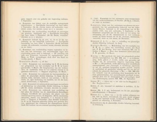 geen rapport over een gedeelte der begrooting indienen, 5 September. Kommissie bedoeld bij de artt. 11, 12 en 13 der ver- ordening op het burgerlijk armbestuur. — Jaarlijksche benoeming van hare leden, 5 September. (De hh. BROUWER ANCHER, als wethouder, voorzitter, BROMS, INSINGER, MOLSTER en DE VRIES). Kommissiën (Raads —), ad hoc: 1. (105). Kommissie van rouwbeklag bij Z. M. den koning ter gelegenheid van het overlijden van H. M. de konin- gn-moeder, 8 Maart. (De burgemeester, een der wethou- ders, de raadsleden KEER en VAN LIMBURG STIRUM en de gemeente-sekretaris). — Rapport uitgebragt, 29 Maart. (106). Kommissie tot onderzoek der bezwaarschriften in zaken de plaatselijke direkte belasting, 14 Junij. (De hh. BEUKER, KEER, GÜLCHER, FEITH en VAN LENNEP). — De hr. FEITH, na zijne herkiezing tot raadslid, tot lid der kom- missie herbenoemd, 5 September. (107). Kommissie tot onderzoek der aanvragen om restitutie of afschrijving van plaatselijke direkte belasting, 14 Junij. (De hh. ASSER, HEEMSKERK, GÜLCHER, MOLSTER en LUDEN). (109). Kommissie tot het ontwerpen eener reorganisatie van het nachtwachtswezen, 25 October. (De hh, B. 3. MÜLLER, DE VRIES en MATTHES). Kommissie, belast met het ontwerpen van plannen tot reor- ganisatie van het geneeskundig onderwijs aan het Athe- naeum Îllustre, benoemd in de vergadering van 16 De- cember 1863, nog niet ontbonden, 6 September. — De kommissie aangevuld met de hh. PENN en VAN BOSSE, ter vervanging van de hh. HERCKENRATH en VAN CAPPELLE, KöniesLow (J. A. C.). — Aan — ontheffing van plaatselijke direkte belasting verleend, 14 Junij. Koning. — Het geschenk der stad, ter gelegenheid van het zilveren huwelijksfeest van HH. MM. den — en de Konin- ging, heeft gekost f 17,000, welke som gevonden zal worden uit de onvoorziene uitgaven begrooting 1864, 4 Mei. — Dit geschenk, welks aflevering door verschillende omstandigheden was vertraagd, is eerstdaags afgewerkt en zal ter openbare bezigtiging worden gesteld, waarna de aanbieding zal geschieden tegelijk met die van het ge- schenk der gemeente Rotterdam, 4 Mei. — HH. MM. heb- ben bedankt voor de aanbieding door kommissiën uit de twee gemeenteraden; het amsterdamsche geschenk is over- gebragt door den hr. BONEBAKKER, den vervaardiger; brief van dankbetuiging namens HH. MM, 27 September. KoninG (W.). — Adres van — ter zake van het Bagijnhof. — Zie: Bagijnensloot. Koning (Mr. J. C. DE), herbenoemd tot lid der plaatselijke schoolkommissie, 6 December. Konings (C.). — Adres van — en der andere schippers van het veer op Tezel, verzoekende dat geen vierde schipper in het veer benoemd worde, in handen van Burg. en W eth. gesteld tot afdoening, 3 November. Kontròôleurs bij de plaatselijke direkte belasting benoemd, 16 Februarij. Kommissie van beheer over de stedelijke rentegevende eigendommen. — Jaarlijksche benoeming van hare leden, 5 September. (De hh. CORVER HOOFT, als wethouder, voor- zitter, ASSER, VAN LENNEP, LUDEN €en P. N. MULLER). Kommissie van voorbereiding wegens regtszaken en be- last met het ontwerpen van verordeningen tegen wier overtreding geene straf is bedreigd. — De instelling van zulk eene kommissie, bestaande uit regtsgeleerden, door Burg. en Weth. voorgedragen doch door den Raad on- noodig geacht, 8 Maart. (108). Kommissie van onderzoek naar aanleiding van het adres der direktie van de Amsterdamsche Kanaalmaat- schappij, betreffende het aanwijzen der plaats voor het centraal spoorweg-station, 23 Augustus. (De hh. HEEMSKERK, PIJNAPPEL, TEDING VAN BERKHOUT, P. N. MULLER En BIEN- Farr). — Rapport, 2 November. (Aan dezelfde kommissie, in de op 23 Augustus gehouden zitting met gesloten deu- ren, opgedragen het onderzoek der slaatsplannen betref- fende het bouwen van een centraal spoorweg-station alhier). zoodat zij thans bestaat uit de hh. BÜCHNER, HEEMSKERK, Koningin-Moeder. — Mededeeling van het overlijden van H. M. de —; adres van rouwbeklag namens den Raad aan Z. M. den Koning, door eene kommissie HD. aan te bieden, 8 Maart. — Door deze kommissie is het adres aan Z. M. gezonden, 29 Maart. Konin (J. DE), benoemd tot makelaar in mobilair, 11 Ja- nuarij. Kommissie van voorbereiding betreffende de aanvragen om pensioen, wachtgeld enz. — Jaarlijksche benoeming van hare leden, 5 September. (De hh. BROMS, voorzitter, GÜLCHER en B. J. MÜLLER). PIJNAPPEL, PENN en VAN BOSSE, 20 December.