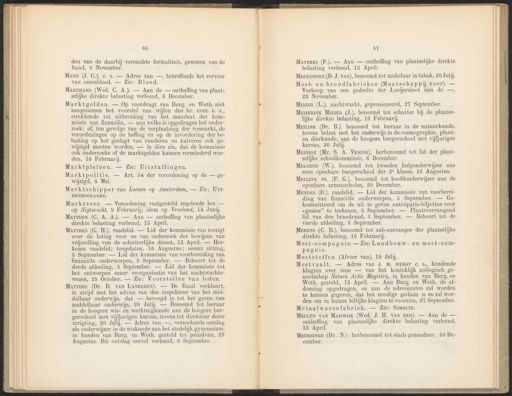 86 den van de daarbij vereischte formaliteit, gewezen van de hand, 8 November. MANN (J. C.), e. s. — Adres van —, betreffende het vervoer van ossenbloed. — Zie: Bloed. MancaanD (Wed. C. A.). — Aan de — ontheffing van plaat- selijke direkte belasting verleend, 6 December. Marktgelden. — Op voordragt van Burg. en Weth. niet aangenomen het voorstel van wijlen den hr. COOL €. °s,, strekkende tot uitbreiding van het mandaat der kom- missie van financiën, — aan welke is opgedragen het onder- zoek: of, ten gevolge van de verplaatsing der veemarkt, de verordeningen op de heffing en op de invordering der be- lasting op het geslagt van runderen en kalveren ook ge- wijzigd moeten worden, — in dien zin, dat de kommissie ook onderzoeke of de marktgelden kunnen verminderd wor- den, 16 Februarij. Marktpleinen. — Zie: Uitstallingen. Marktveer. — Verordening vastgesteld regelende het — op Nigtevecht, 9 Februarij; idem op Vreeland, 14 Junij. MATTERN (C. A. A.). — Aan — ontheffing van plaatselijke Marrtars (Dr. D. vAN LANKEREN). — De Raad verklaart, in strijd met het advies van den inspekteur van het mid- delbaar onderwijs, dat — bevoegd is tot het geven van middelbaar onderwijs, 20 Julij. — Benoemd tot leeraar in de hoogere wis- en werktuigkunde aan de hoogere bur- gerschool met vijfjarigen kursus, tevens tot direkteur dezer inrigting, 20 Juli. — Adres van —, verzoekende ontslag als onderwijzer in de wiskunde aan het stedelijk gymnasium, in handen van Burg. en Weth. gesteld tot preadvies, 23 Augustus. Dit ontslag eervol verleend, 6 September. 87 Marrags (P.). — Aan — ontheffing van plaatselijke direkte belasting verleend, 13 April. MEER (L.), nachtwacht, gepensioneerd, 27 September. MEuERINK Meyer (J.), benoemd tot schatter bij de plaatse- lijke direkte belasting, 16 Februarij. Marktpolitie. — Art. 54 der verordening op de — ge- wijzigd, 4 Mei. direkte belasting verleend, 13 April. MepEvoorr (D. J. vAn), benoemd tot makelaar in tabak, 20 Julij. MeiLiNK (Dr. B.), benoemd tot leeraar in de natuurkunde, tevens belast met het onderwijs in de cosmographie, plant- en dierkunde, aan de hoogere burgerschool met vijfjarigen kursus, 20 Julij. Marktschipper van Loenen op Amsterdam, — Zie: UyT- DENBOOGAARD. Marres (G. H.), raadslid. — Lid der kommissie van toezigt over de loting voor en van onderzoek der bewijzen van vrijstelling van de schutterlijke dienst, 13 April. — Her- kozen raadslid; toegelaten, 16 Augustus; neemt zitting, 5 September. — Lid der kommissie van voorbereiding van financiële onderwerpen, 5 September. — Behoort tot de derde afdeeling, 5 September. — Lid der kommissie tot het ontwerpen eener reorganisatie van het nachtwachts- wezen, 25 October. — Zie: Voorstellen van leden. Meel- en broodfabrieken (Maatschappij voor). — Verkoop van een gedeelte der Looijersloot aan de —, 22 November. Memesz (Mr. S. A. VENING), herbenoemd tot lid der plaat- selijke schoolkommissie, 6 December. MeeerD (W.), benoemd tot tweeden hulponderwijzer aan eene openbare burgerschool der 2° klasse, 16 Augustus. MrLunk Pz. (F. G.), benoemd tot hoofdonderwijzer aan de openbare armenscholen, 20 December. Mennes (D.), raadslid. — Lid der kommissie van voorberei- ding van financiële onderwerpen, 5 September. — Ge- kommitteerd om de uit te geven anticipatie-biljetten voor “gezien” te teekenen, 5 September. — Plaatsvervangend lid van den brandraad, 5 September. — Behoort tot de vierde afdeeling, 5 September. Merens (C. D.), benoemd tot sub-ontvanger der plaatselijke direkte belasting, 16 Februarij. Mest-compagnie. — Zie: Landbouw- en mest-com- pagnie. Meststoffen (Afvoer van), 19 Julij. Mestvaalt. — Adres van J. M. HERGT c. s., houdende klagten over eene — van het koninklijk zoölogisch ge- nootschap Natura Artis Magistra, in handen van Burg. en Weth. gesteld, 18 April. — Aan Burg. en Weth. de af- doening opgedragen, en aan de adressanten zal worden te kennen gegeven, dat het noodige gedaan is en zal wor- den om in hunne billijke klagten te voorzien, 27 September. Metaalwarenfabriek. — Zie: SCHOLTE. MEULEN van Marwijk (Wed. J. H. VAN DER). — Aan de — ontheffing van plaatselijke direkte belasting verleend, 18 April. MEURSINGE (Dr. N.). herbenoemd tot stads geneesheer, 20 De- cember.