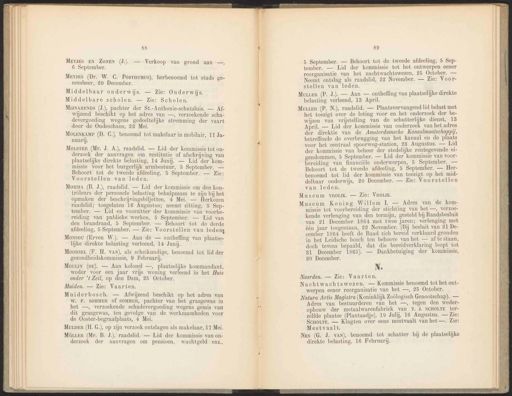 88 MEYJES EN ZONEN (J.). — Verkoop van grond aan — 6 September. + Meyses (Dr. W. C. Postauumus), herbenoemd tot stads ge- neesheer, 20 December. : Middelbaar onderwijs. — Zie: Onderwijs. Middelbare scholen. — Zie: Scholen. MiyNArENDs (J.), pachter der St.-Anthonie-schutsluis. — Af- wijzend beschikt op het adres van —, verzoekende scha- devergoeding wegens gedeeltelijke stremming der vaart door de Oudeschans, 22 Mei. ? MoMA (B. J.), raadslid. — Lid der kommissie om den kon- tròleurs der personele belasting behulpzaam te zijn bij het opmaken der beschrijvingsbiljetten, 4 Mei. — Herkozen raadslid; toegelaten 16 Augustus; neemt zitting, 5 Sep- tember. — Lid en voorzitter der kommissie van voorbe: reiding van publieke werken, 5 September. — Lid van den brandraad, 5 September. — Behoort tot de derde afdeeling, 5 September. — Zie: Voorstellen van ledeng Monsou (Erven W.). — Aan de — ontheffing van plaatse- lijke direkte belasting verleend, 14 Junij. ij ee Moorse (F. H. van), als scheikundige, benoemd tot lid der gezondheidskommissie, 9 Februarij. MouLIN (DE). — Aan kolonel —, plaatselijke kommandant, weder voor een jaar vrije woning verleend in het Huis onder ’t Zeil, op den Dam, 25 October. Muiden. — Zie: Vaarten. 89 5 September. — Behoort tot de tweede afdeeling, 5 Sep- tember. — Lid der kommissie tot het ontwerpen eener reorganisatie van het nachtwachtswezen, 25 October. — Neemt ontslag als raadslid, 22 November. — Zie: Voor- stellen van leden. Muren (P. J.). — Aan — ontheffing van plaatselijke direkte belasting verleend, 13 April. Mutter (P. N.), raadslid. — Plaatsvervangend lid belast met het toezigt over de loting voor en het onderzoek der be- wijzen van vrijstelling van de schutterlijke dienst, 18 April. — Lid der kommissie van onderzoek van het adres der direktie van de Amsterdamsche Kanaalmaatschappij, betreffende de overbrugging van het kanaal en de plaats voor het centraal spoorweg-station, 23 Augustus. — Lid der kommissie van beheer der stedelijke rentegevende ei- gendommen, 5 September. — Lid der kommissie van voor- bereiding van financiële onderwerpen, 5 September. — Behoort tot de tweede afdeeling, 5 September. — Her- benoemd tot lid der kommissie van toezigt op het mid- delbaar onderwijs, 20 December. — Zie: Voorstellen van leden. Museum Koning Willem I. — Adres van de kom- missie tot voorbereiding der stichting van het —, verzoe- kende verlenging van den termijn, gesteld bij Raadsbesluit van 21 December 1864 met twee jaren; verlenging met één jaar toegestaan, 22 November. (Bij besluit van 21 De- cember 1864 heeft de Raad zich bereid verklaard gronden in het Leidsche bosch ten behoeve van het — af te staan, doch tevens bepaald, dat die bereidverklaring loopt tot 81 December 1865). — Dankbetuiging der kommissie, 20 December. N: Naarden. — Zie: Vaarten. MOLENKAMP (D. C.), benoemd tot makelaar in mobilair, 11 Ja- nuarij. Muiderbosch. — Afwiijjzend beschikt op het adres van W. F. SOHMER of SOMMER, pachter van het grasgewas in het —, verzoekende schadevergoeding wegens gemis van dit grasgewas, ten gevolge van de werkzaamheden voor de Ooster-begraafplaats, 4 Mei. Museum VROLIK. — Zie: VROLIK. Nachtwachtswezen. — Kommissie benoemd tot het ont- werpen eener reorganisatie van het —, 25 October. MorstEr (Mr. J. A.), raadslid. — Lid der kommissie tot on- derzoek der aanvragen om restitutie of afschrijving van plaatselijke direkte belasting, 14 Junij. — Lid ‘der kom- missie voor het burgerlijk armbestuur, 5 September. — Behoort tot de tweede afdeeling, 5 September. — Zie: Voorstellen van leden. MutDER (H. G.), op zijn verzoek ontslagen als makelaar, 17 Mei. Natura Artis Magistra (Koninklijk Zoölogisch Genootschap). — Adres van bestuurderen van het —, tegen den weder- opbouw der metaalwarenfabriek van T. J. SCHOLTE ter- zelfde plaatse (Plantaadje), 19 Julij, 16 Augustus. — Zie: ScmoLTE. — Klagten over eene mestvaalt van het —. Zie: Mestvaalt. MürLer (Mr. B. J.), raadslid. — Lid der kommissie van on- derzoek der aanvragen om pensioen, wachtgeld enz, Nes (G. J. vAn), benoemd tot schatter bij de plaatselijke direkte belasting, 16 Februarij.