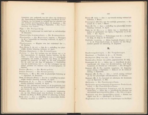 102 kommissie van onderzoek van het adres van direkteuren der Amsterdamsche Kanaalmaatschappij betreffende de over- brugging van het kanaal in verband met het plaatsen van een centraal spoorweg-station alhier, 23 Augustus. — Be- hoort tot de eerste afdeeling, 5 September. — Zie: Voor- stellen van leden. Piijp. — Zie: Paalgording. Pier (J. F.), herbenoemd tot stads heel- en verloskundige, 20 December. Plaatselijke kommandant. — Zie: Kommandant. Plantaadje. — Zie: Mestvaalt, sCHOLTE. -— Woningen in de — ongeschikt ter bewoning verklaard, 13 April. — Zie: WILKING. Plantsoenen. — Klagten over het onderhoud der —, 25 October. 103 Praac (M. van). — Aan — op verzoek ontslag verleend als makelaar, 8 Maart. Praeceptor (Derde), aan het stedelijk gymnasium. — Be- noemd dr. J. ROOS, 8 Maart. R. Raadsvergaderingen. — Zie: Vergaderingen. Raadzaal. — Ventilatie in de —, 25 October. Raampoort (Brug voor de). — Zie: GALMAN. vaarthoogte der brug over Kromboomsloot, hoek Regt- boomsloot, 18 October en 8 November. — Zie: Bruggen. Reederijen (Permanente kommissie uit de amster- damsche). — Adres der — betreffende het plaatsen van een centraal spoorweg-station alhier. — Zie: Spoorwegen. Pras (Erven L. DE LA). — Aan de — ontheffing van plaat- selijke direkte belasting verleend, 13 April. Pains (H. T.). — Aan — ontheffing van plaatselijke direkte belasting verleend, 13 April. RAASING (G.), dienaar van politie, gepensioneerd, 20 Juli. RADEMAKER (B. J.). — Adres van —, betreffende de door- RauusEN (Mr. E. N.), raadslid, toegelaten, 16 Augustus; neemt zitting, 5 September. — Behoort tot de vierde af- deeling, 5 September. Registers van den burgerlijken stand. — Kosten van zegels voor de —, rijksuitgave, 25 October, Pleinen (Openbare). — Zie: Uitstallingen. Prior JR. (J. D.), c.s. — Adres van — betreffende het maken en openhouden van bijten, 5 September en 18 Oc- tober. — Zie: Bijten. RaausEN (Mr. E. N.). — Aan — eervol ontslag verleend als lid der plaatselijke schoolkommissie, 18 October. Reglement van orde voor de vergaderingen van den Raad, Politie. — Over het vestigen van een bureau van — in het Leprozenhuis, 27 Januarij; hiertoe besloten, 19 Oe- tober. — Adres van »de dienaren van —”, verzoekende verhooging van wedde, in handen van Burg. en Weth. gesteld tot preadvies, 19 Julij; op dit stuk overgegaan tot de orde van den dag, 16 Augustus. — Verbouwing van het hoofd-bureau van —, tot het verkrijgen van een lokaal geschikt tot kantoor voor de bouwopzigters, 18 October. Provinciale Staten. — Verkiezingen voor de —, 13 April, 19 Julij, 25 Julij en 20 December. RanuusEN (Mr. J. J.), benoemd tot sekretaris der kommissie voor de Rijnvaart, 17 Mei. Politie (Markt-). — Zie: Markt-politie. Publieke vrouwen. — Adres, houdende klagten over de — in de Pieter-Jacob-straat, in handen van den Burge- meester gesteld tot afdoening, 16 Augustus. Railroute. — Zie: Paardenspoorbaan. Politie (Straat-). — Zie: Straat-politie. Railroute-maatschappij (Algemeene Nederland- sche). — Zie: Paardenspoorbaan. Polituren. — Met 1 Mei 1866 de plaatselijke belasting op — afgeschaft, 20 December. Pook vAN BAGGEN (Wed.). — Aan de — ontheffing van plaat- selijke direkte belasting verleend, 18 April. PopprrBAuM (G. J.). — Aan — ontheffing van plaatselijke direkte belasting verleend, 13 April. Poser (C. E.), benoemd tot leeraar in de hoogduitsche taal en letterkunde aan de hoogere burgerschool met vijfjari- gen kursus, 20 Julij. PouwErs (H.). — Adres van —, verzoekende vergunning om op den Buiten-singel eene houtloots te bouwen, in banden van Burg. en Weth. gesteld tot afdoening, 14 Junij. PoveL (A.). — Aan — ontheffing van plaatselijke direkte belasting verleend, 13 April.