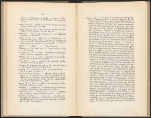 110 hunne broodbakkerijen, in handen van Burg. en Weth. ve tot preadvies, 14 Junij. Afwijzend hierop beschikt, 7 Juli. SIEUWE JR. (J. A.), benoemd tot schatter bij de plaatselijke direkte belasting, 16 Februari. Sintels. — De plaatselijke belasting op — met 1 Mei 1866 afgeschaft, 26 December. an Burg. en van plaatselijke van plaatselijke SoBBE (W.). — Aan — ontheffing van plaatselijke direkte belasting verleend, 13 April. SOETEMAN (P. LAMMERS), benoemd tot kontrôleur der plaat- selijke direkte belasting, 16 Februarij. SoHMER of SomMEr (W. F.). — Afwijzend beschikt op een adres van —, pachter o. a. van het grasgewas in het Muiderbosch, verzoekende schadevergoeding wegens gemis van dit grasgewas, ten gevolge van de werkzaamheden voor de Oosterbegraafplaats, 4 Mei. SoomEr (H.). — Aan — ontheffing van plaatselijke direkte belasting verleend, 18 April. SPEELMAN (1), kommies bij de administratie der stedelijke accijnsen en belastingen, gepensioneerd, 8 Maart. aanleggen van trottoirs en het verbeteren der bestrating in een gedeelte der Vijzelstraat, 22 November, 20 Decem- ber. — Zie: Vijzelstraat. 111 Spoorwegen. — In S 2 van de memorie van ae ding der Regering op het voorloopig ontslag der Twee e Kamer over het ontwerp van wet tot bekrachtiging van eenige artikelen der koncessie voor den en spoorweg, komt voor dat het advies van het gemeente be- stuur van Amsterdam nog wordt ingewacht; dit advies was echter door den minister van binnenlandsche zaken niet gevraagd, en derhalve is door Burg. en Weth. aan den minister berigt dat de brief, door den minister pe doeld, bij hen niet is ontvangen; sedert is uit ’s ministers antwoord hierop gebleken dat de brief, waarop hij het antwoord van het gemeentebestuur verwachtte, den 25 Maart ter verzending gereed lag, doch aan de bureaux van het departement is blijven liggen; eerst nu is dit stuk bij Burg. en Weth. ingekomen, 19 Julij. — Adres van be- stuurderen der Amsterdamsche Kanaalmaatschappij, hou- dende verzoek dat de gemeenteraad zich over de rigting van den noord-hollanudschen staats-spoorweg bij de Hooge Regering verklare; in handen van de kamer ‚van koophan- del en fabrieken gesteld, 16 Augustus. (Volgens de plan- nen der Hooge Regering zal*het kanaal overbrugd moe- ten worden en door de Aanaalmaatschappij worden, in het belang der scheepvaart, bezwaren tegen de westelijke over- 0 ï ar [ 5 sl 5 \e- brugging ingebragt). De kamer van koophandel en fabrie ken is van meening dat het ontwerp der Regering onver- anderd behoort te blijven. Burg. en Weth. vereenigen zich met dit advies, en stellen voor aan adressanten te kennen te geven: dat de Raad hunne inzigten niet deelt en mits- dien aan hun verzoek geen gevolg kan geven. De stukken tot onderzoek in handen eener raadskommissie gesteld, 23 Augustus. — De behandeling van het rapport dezer kommissie aangehouden, 18/19 October. — De kommissie stelt voor: zniet te treden in het verzoek der A msterdamsche Kanaalmaatschappij tot ondersteuning van haar verlangen dat de Hooge Regering tot de overbrugging van het 4 ten oosten van Amsterdam besluite en den noord-holland- schen staats-spoorweg langs die rigting naar de hoofd- stad leide”. De kommissie is alzoo voor het plaatsen van een centraal goederen- en personen-station 1n het zooge- naamde open havenfront. Adres van mr. W. K. VAN DER BREGGEN, houdende bestrijding van het rapport der kom- missie, 25 October. — Behandeling dezer stukken, 2 No- vember. — Adres terzelfde zake van de permanente kom- missie uit de amsterdamsche reederijen, 2 November. _ Konklusie van het rapport der raadskommissie aangeno- men, 2 November. (Alzoo beslist: geen bezwaar te opperen tegen de keuze van het open bavenfront tot plaats, voor ONE SINKEL (Erven A. B.). — Aan de — ontheffing van plaat- selijke direkte belasting verleend, 14 Junij. SrssELAAR (A.), c.s. — Adres van —, rijtuighouders, ver- zoekende dat spoedig worde overgegaan tot demping van den Nieuwe-Zijds-Achterburgwal, in handen v Weth. gesteld tot preadvies, 22 November. SOETENS (C.), koncessionaris eener paardenspoorbaan. — Zie: Paardenspoorbaan. SPENGLER (M. A. VAN VLOTEN, wed.). — Aan — ontheffing van plaatselijke direkte belasting verleend, 13 April. Slagt- en bergplaatsen. — Zie: SCHRÖTER. SPIJKERMAN (K. M.), ec. s. — Adres van —, betreffende het Sluizen. — Zie: Bruggen. — Verpachting van eenige —, 8 November. SLuyTERs (J. EYKEN). — Aan — ontheffing direkte belasting verleend, 13 April. SumssAERT (W. J. E.). — Aan — ontheffing direkte belasting verleend, 18 April.